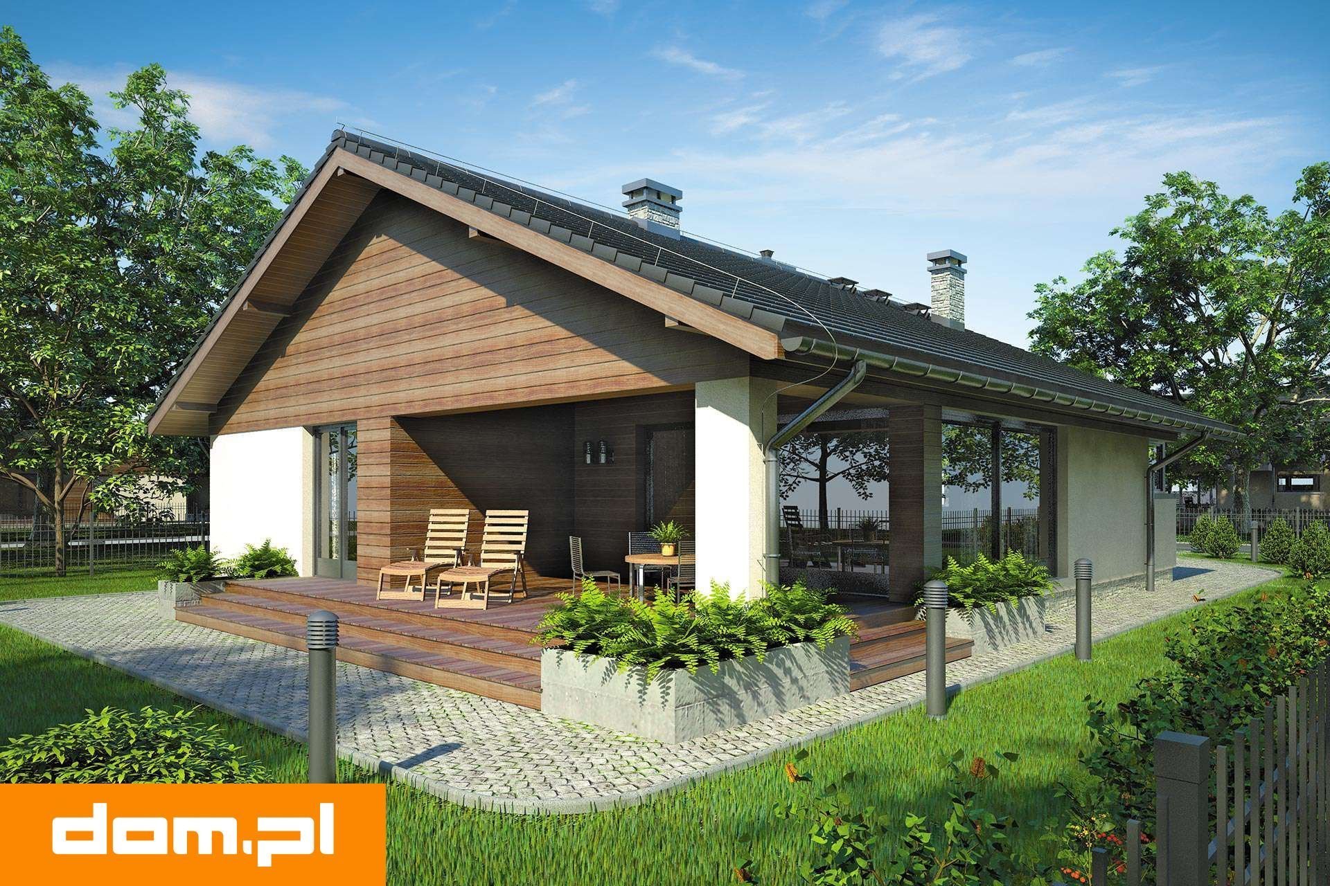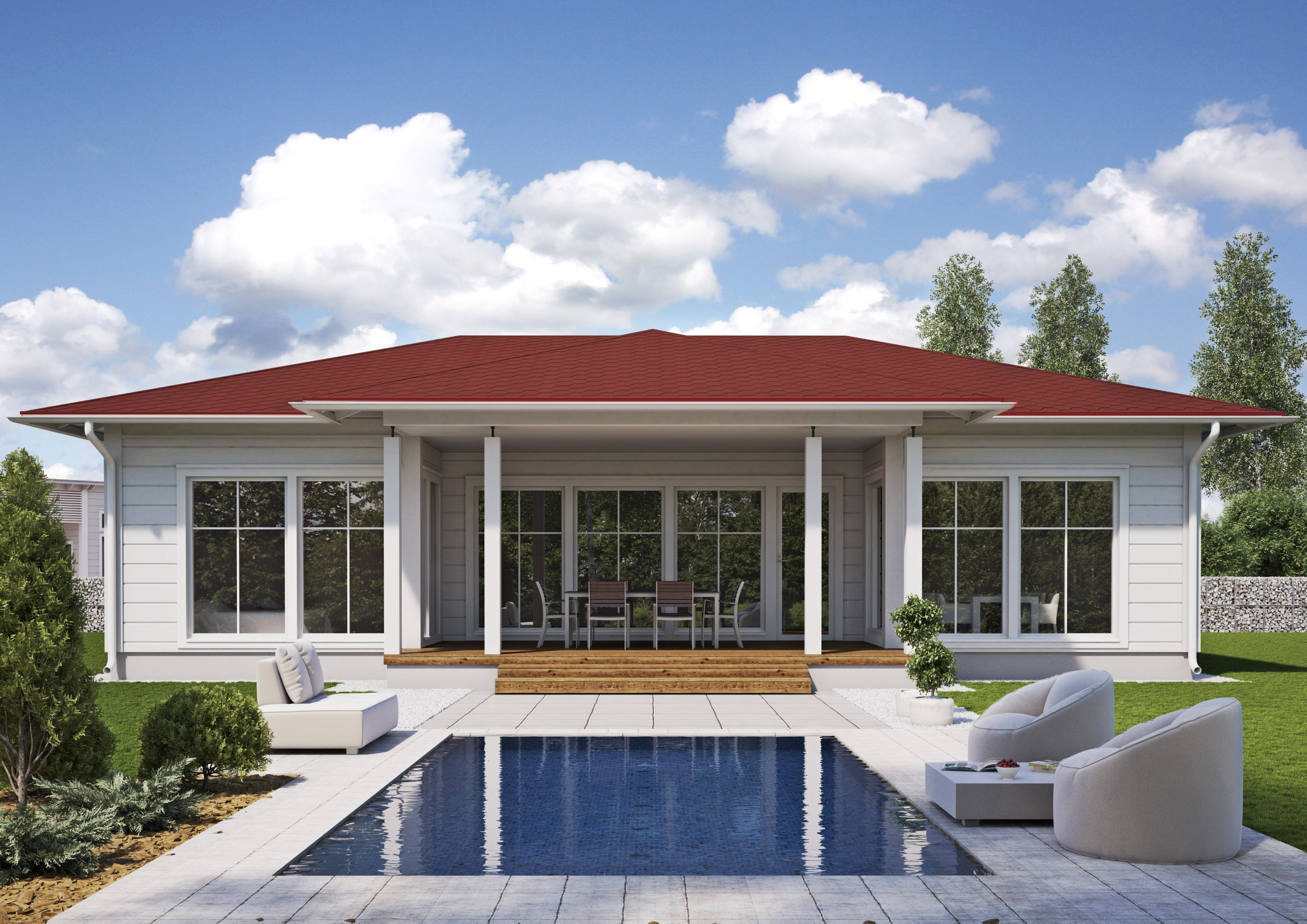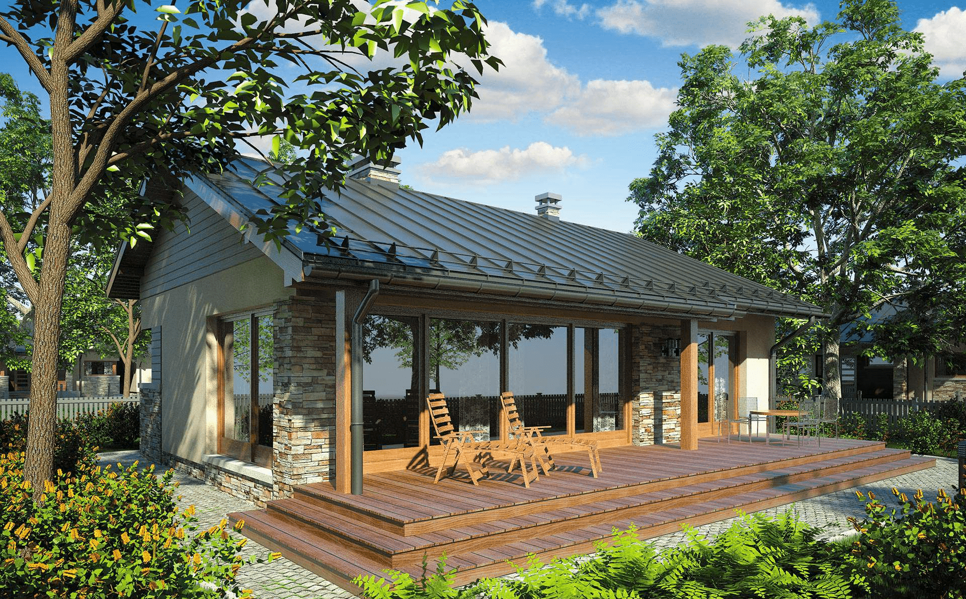Одноэтажный дом с крытой верандой и террасой