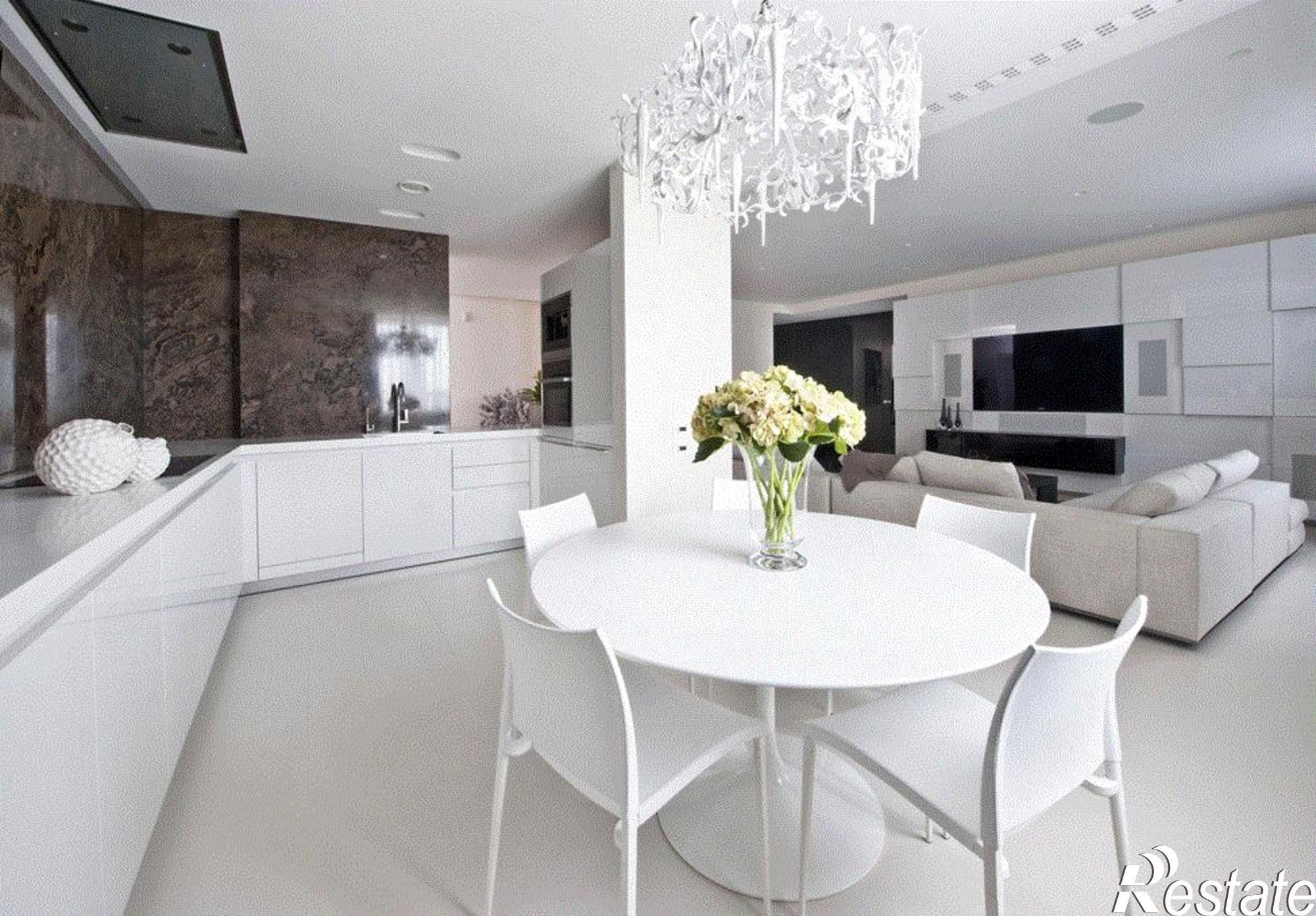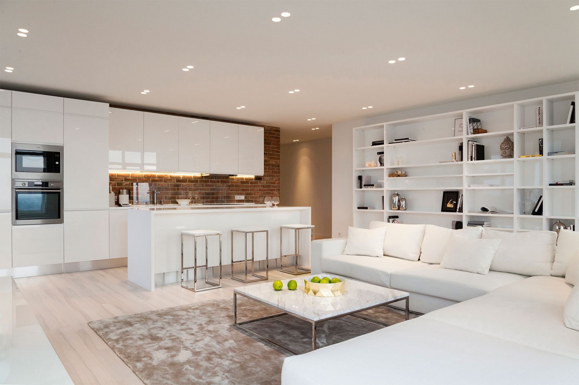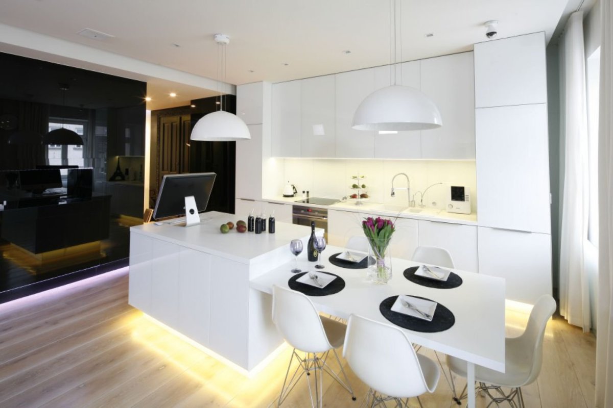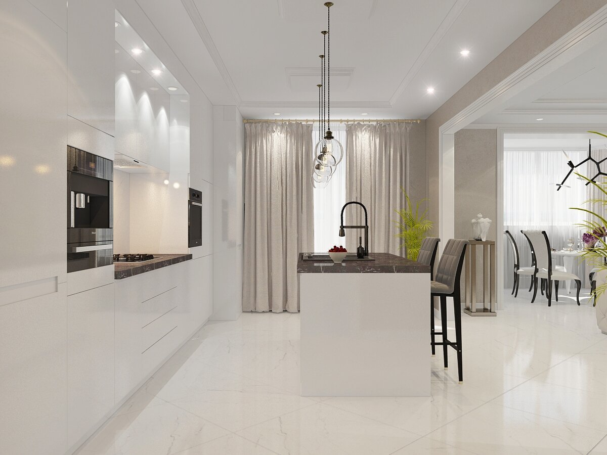 Красивая современная белая кухня гостиная