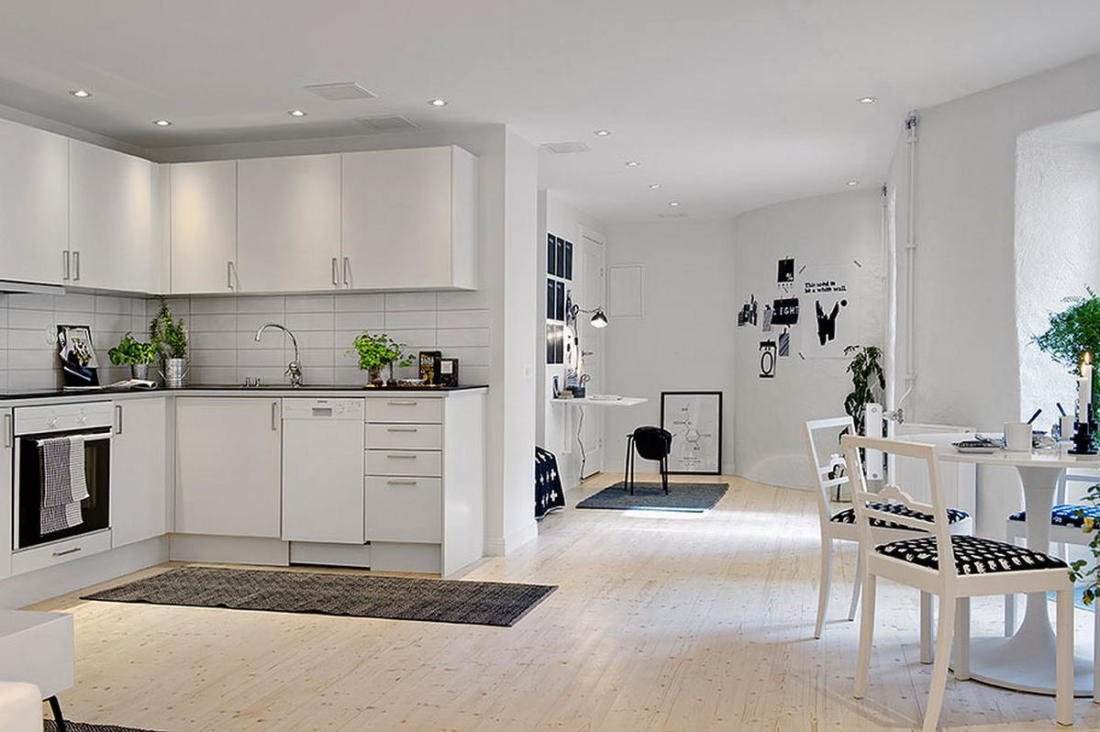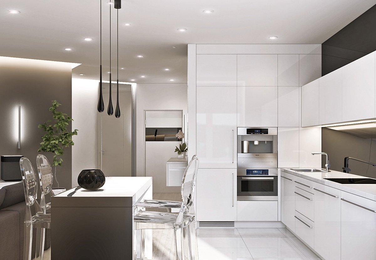 Интерьер студии с белой кухней