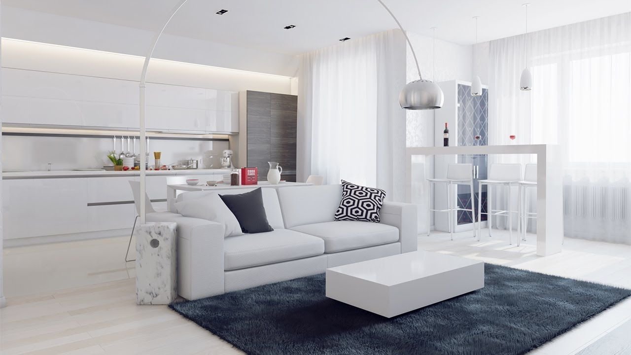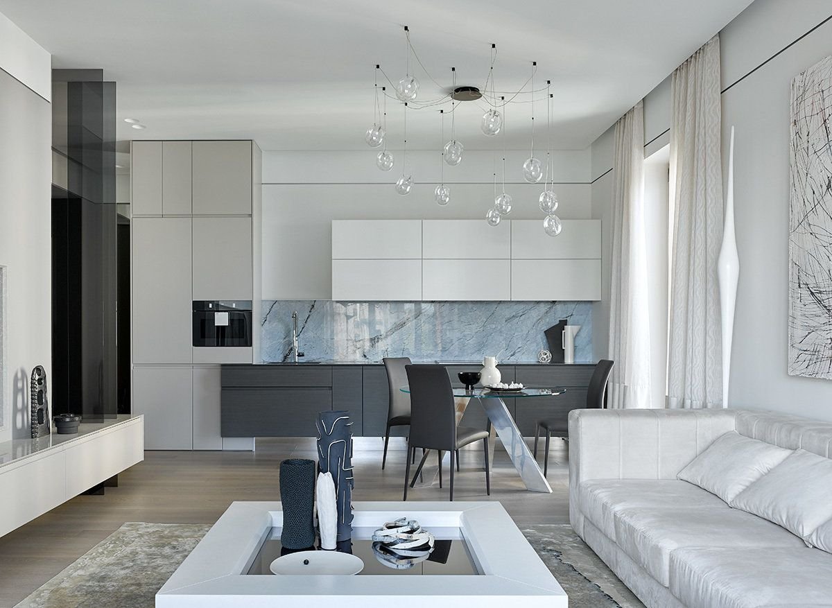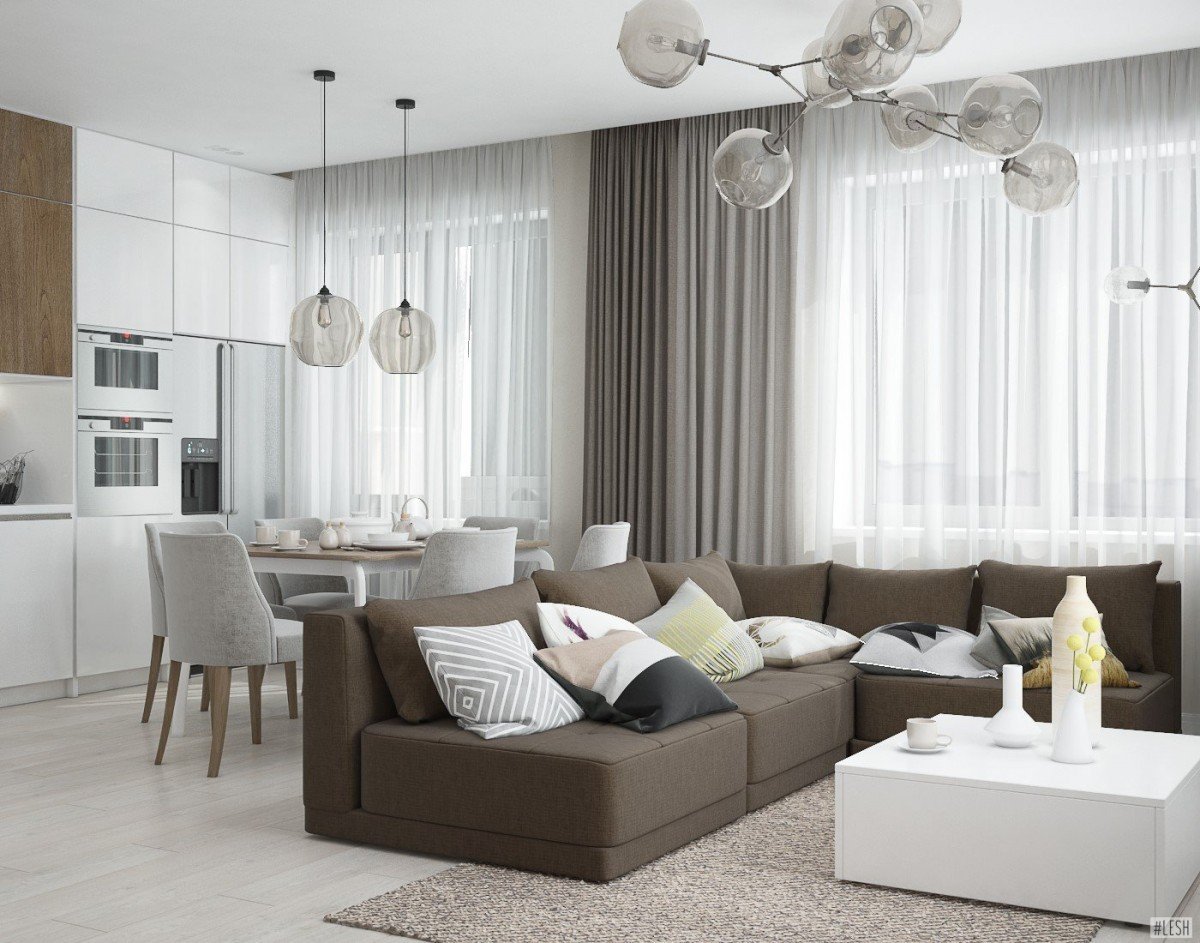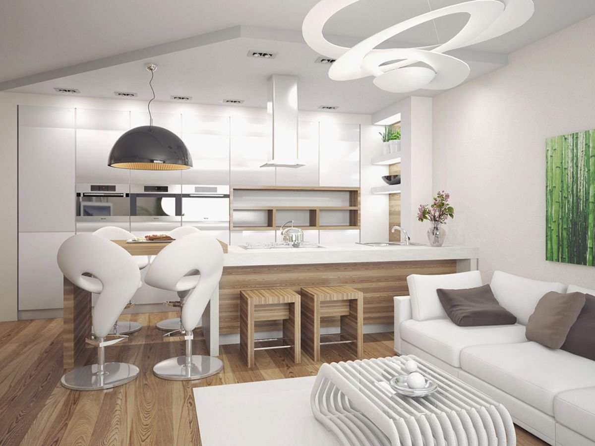 Современные светлые интерьеры гостиной совмещенной с кухней