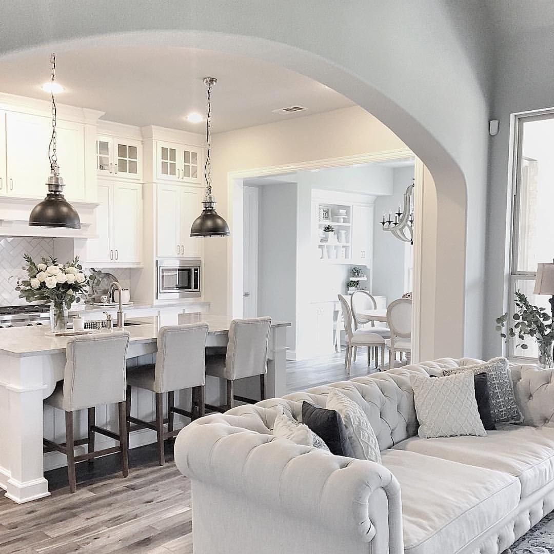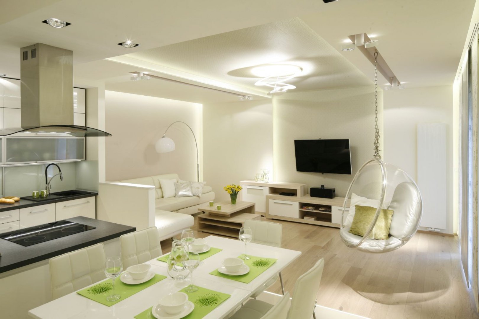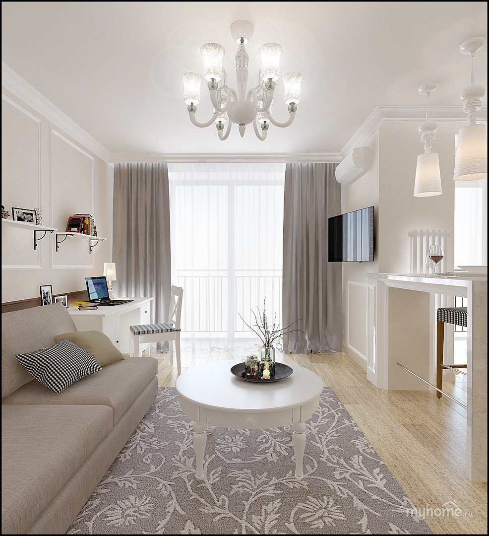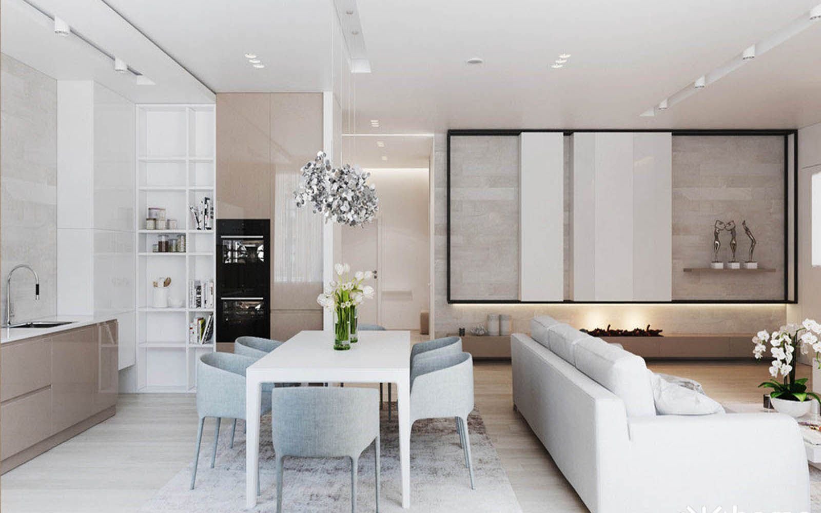 Современные светлые интерьеры гостиной совмещенной с кухней