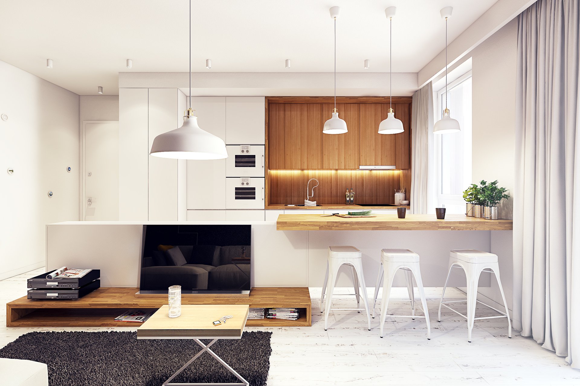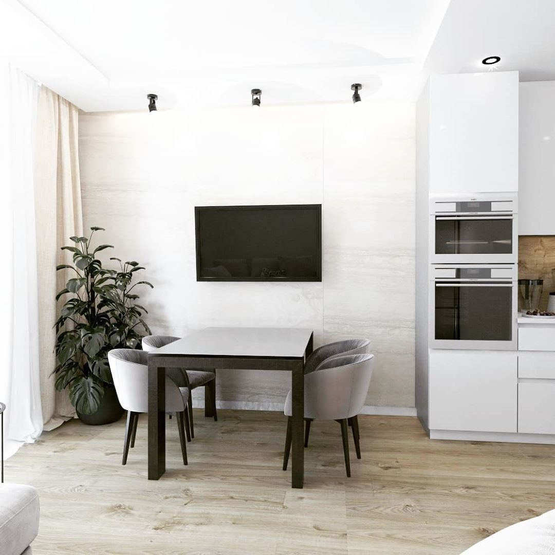 Кухня в скандинавском стиле с телевизором