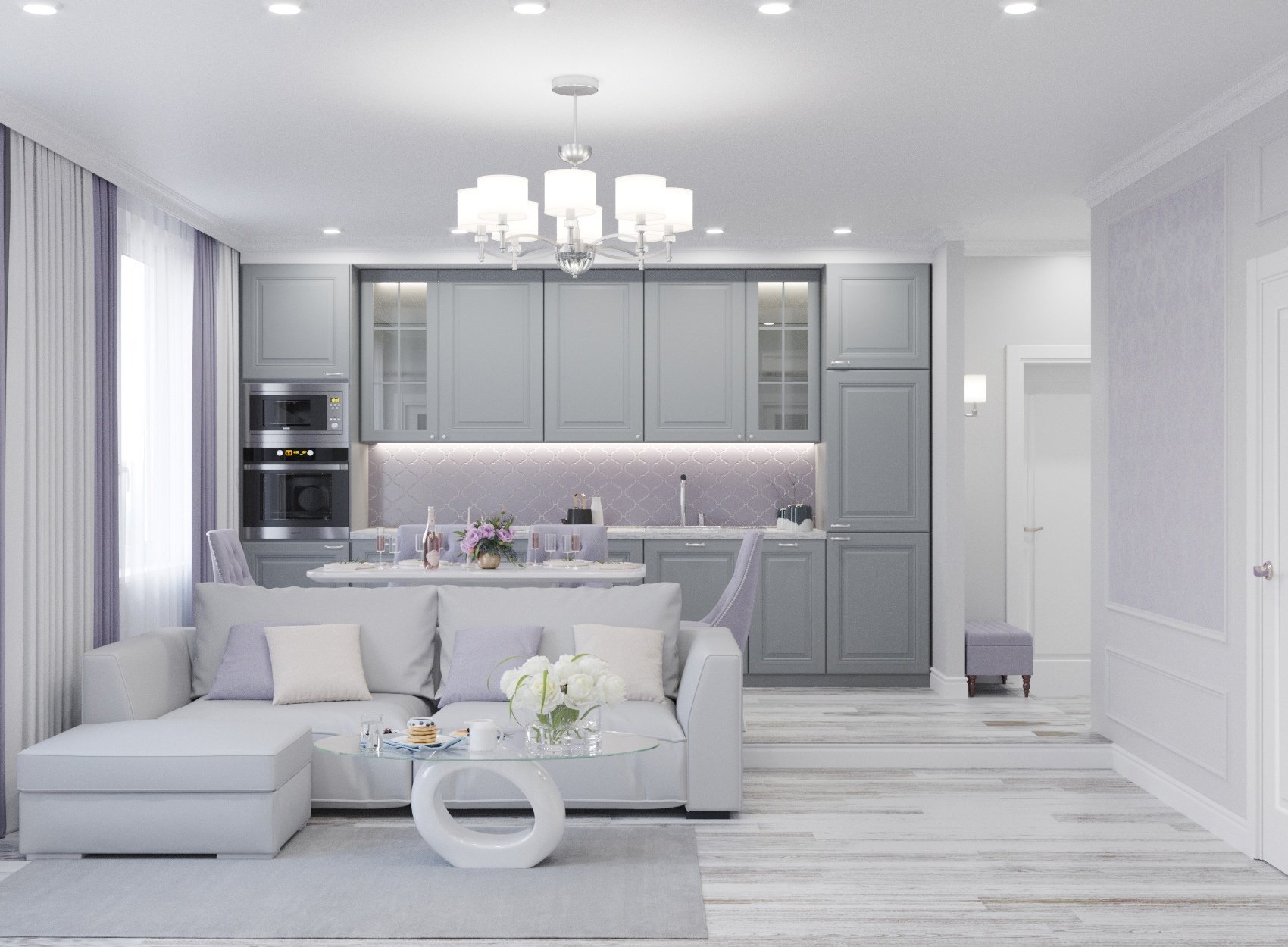 Бело серая кухня гостиная