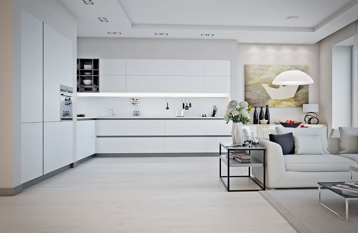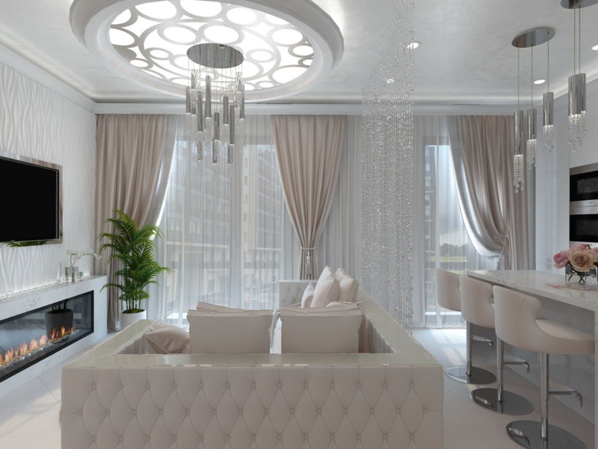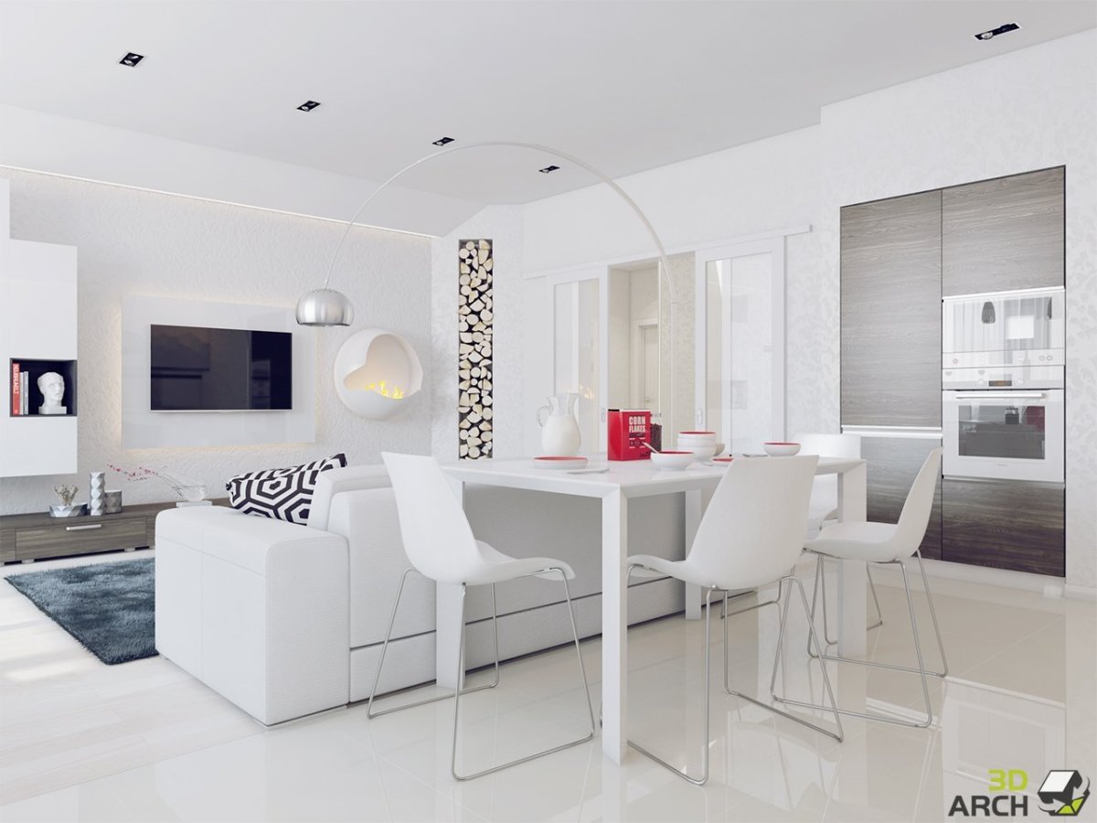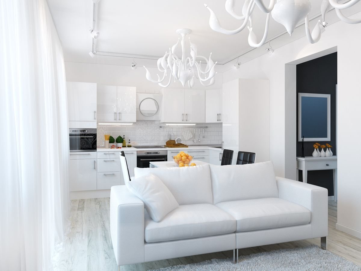 Кухня-гостиная в белых тонах