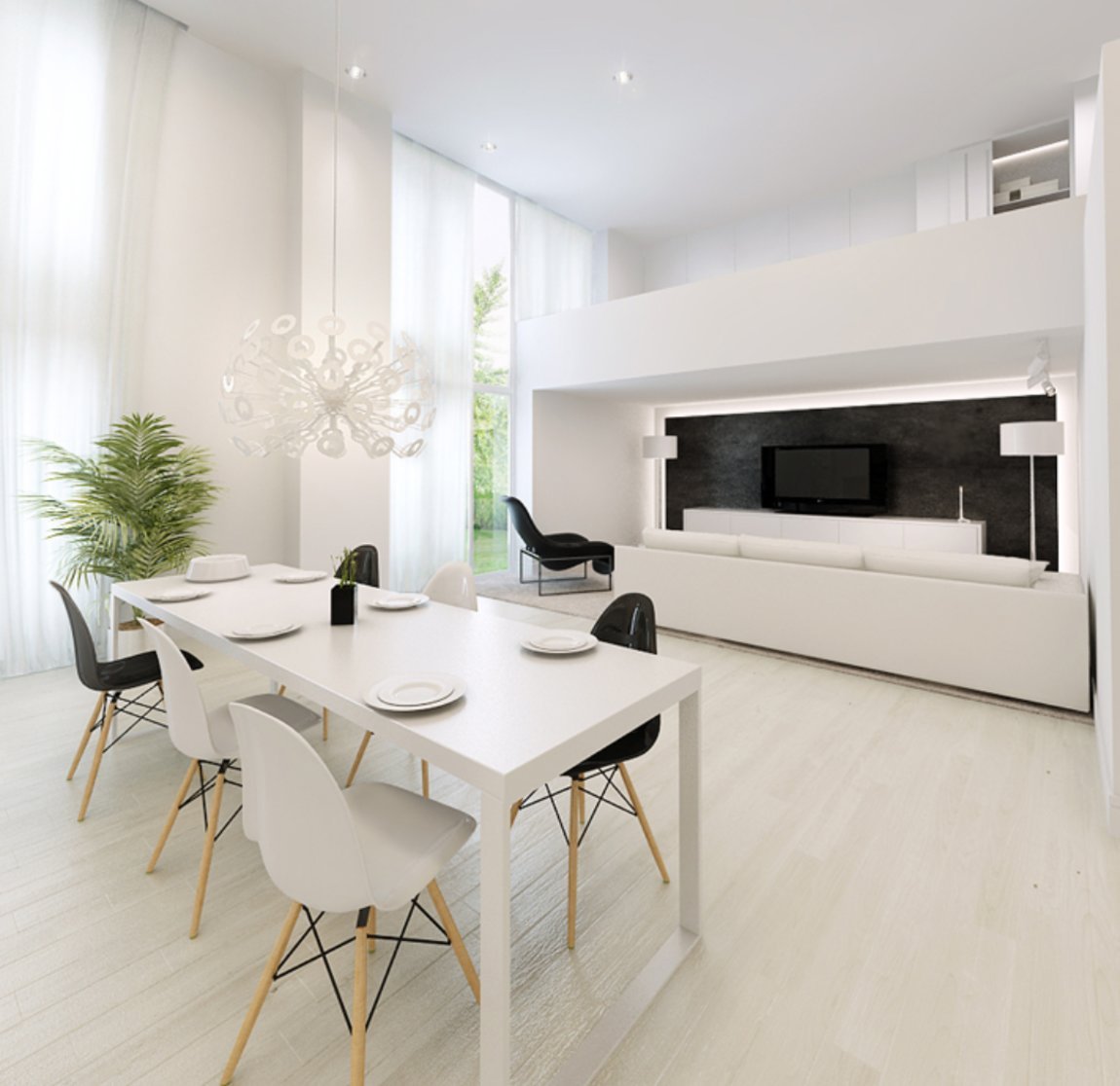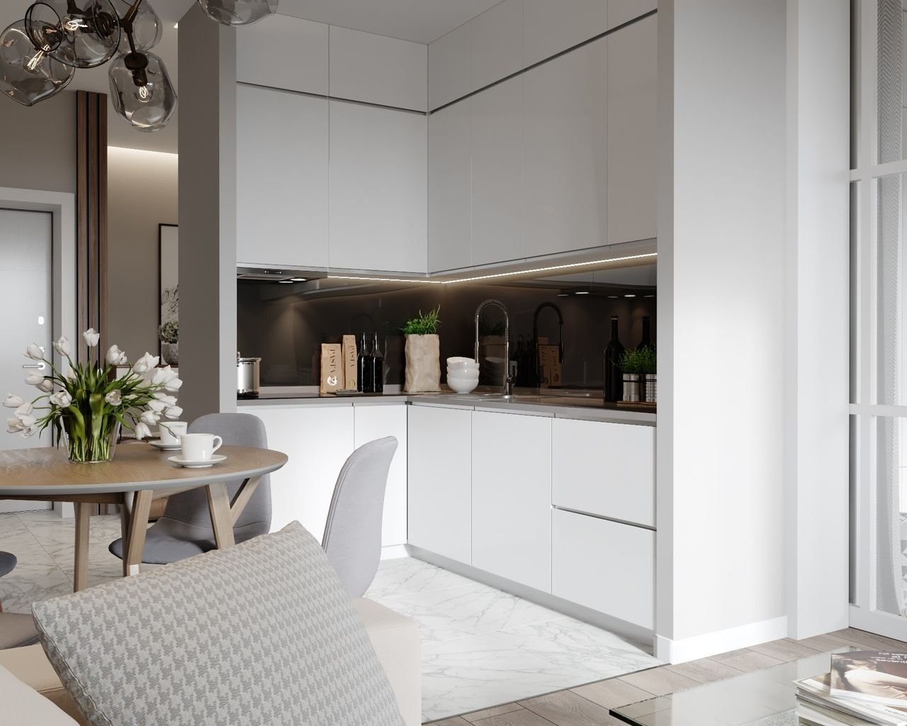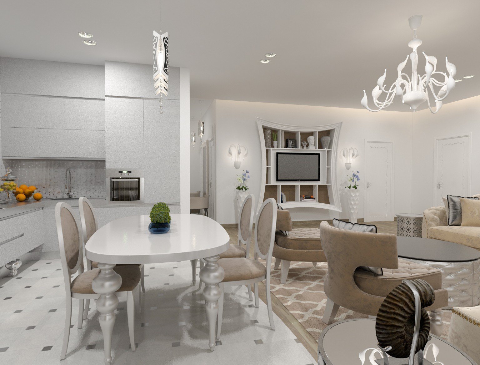 Кухня-гостиная в белых тонах