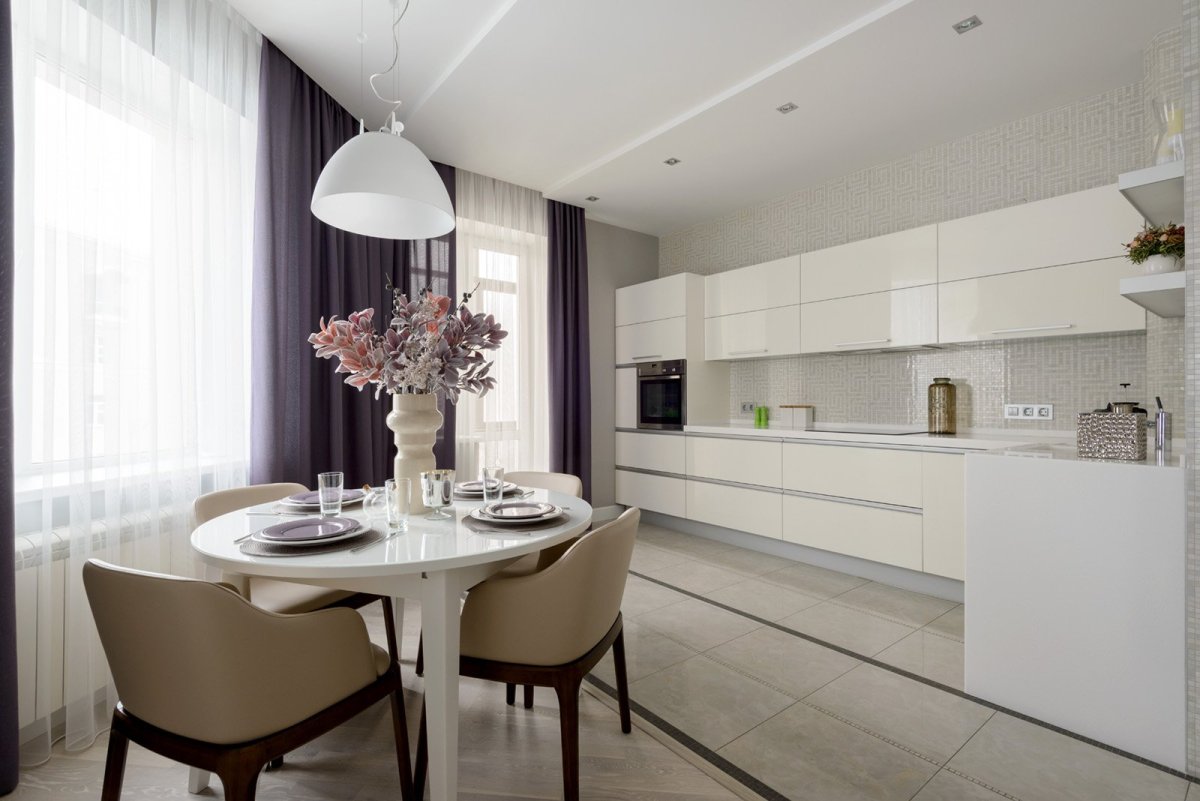 Кухня гостиная в светлых тонах в современном стиле