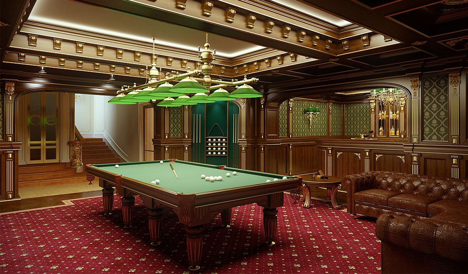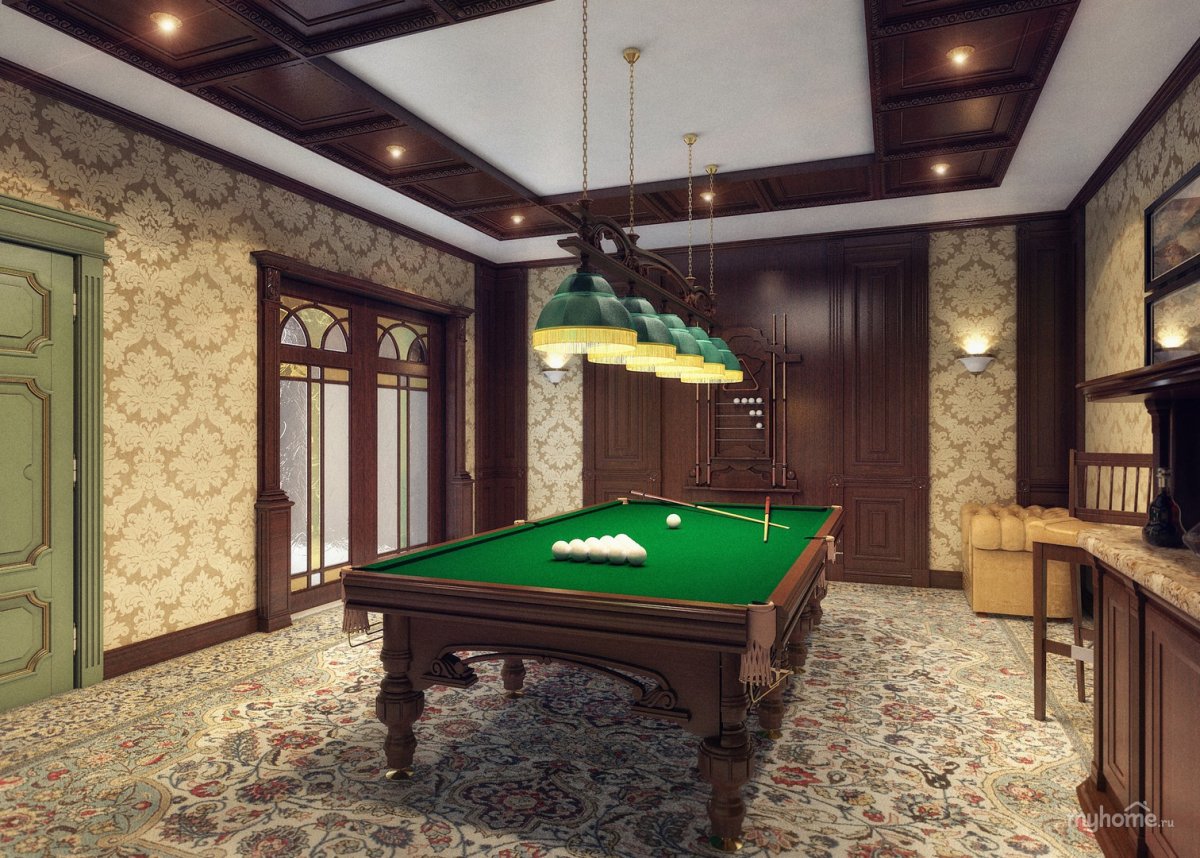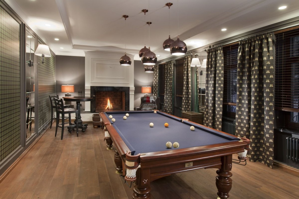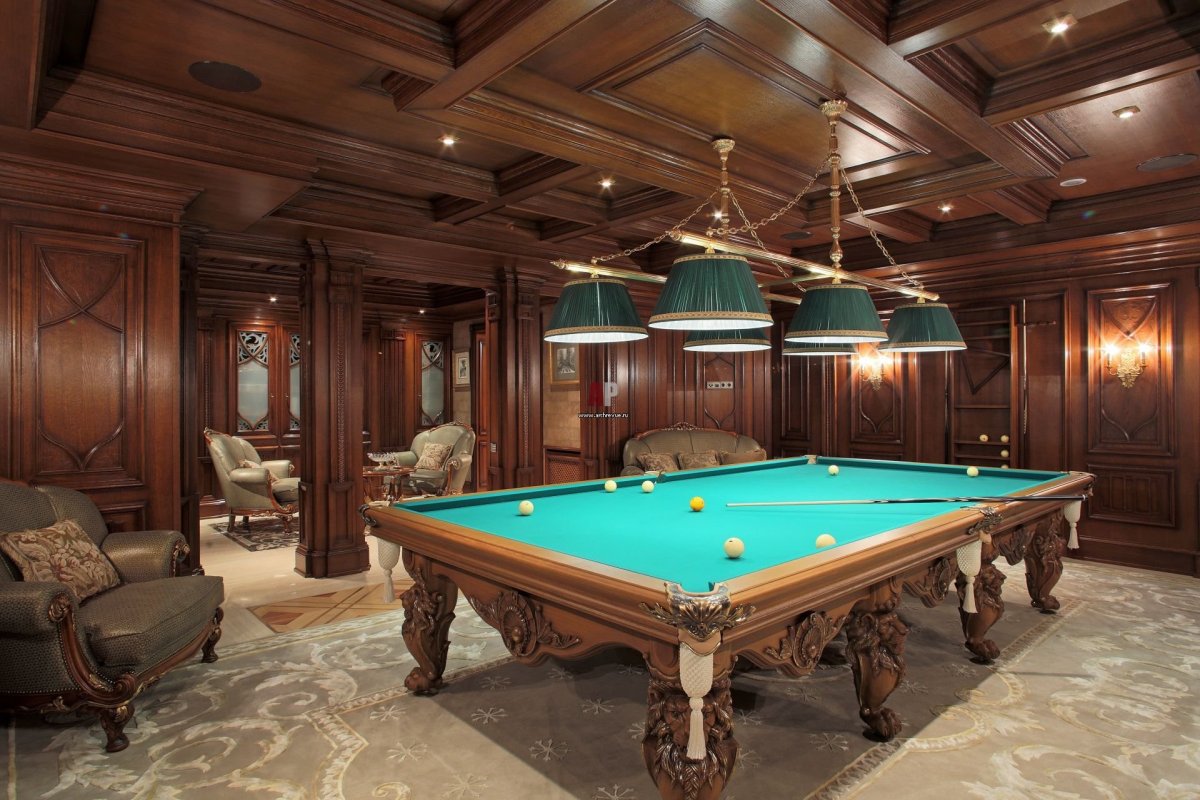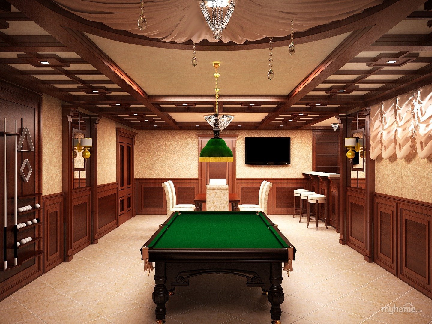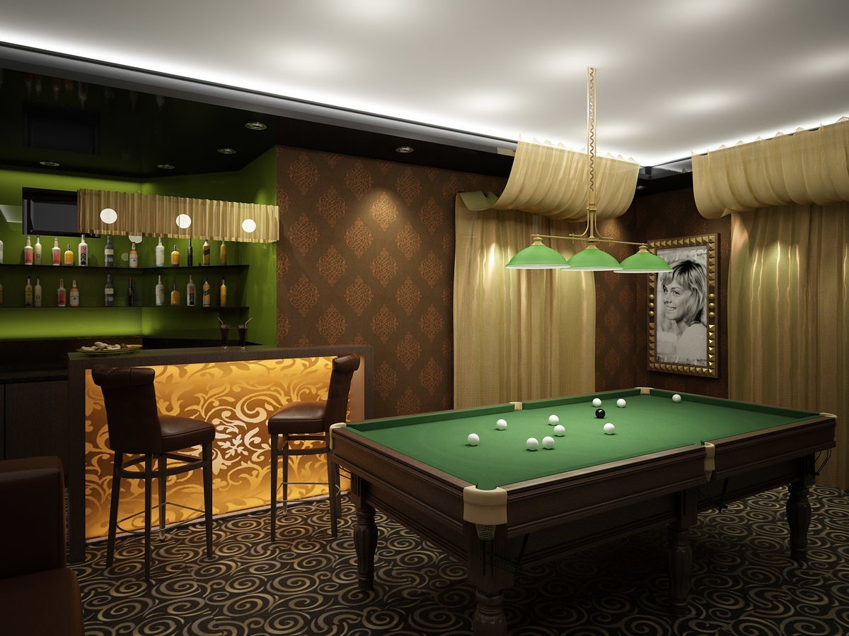 Дизайн бильярдной комнаты с барной стойкой в частном доме
