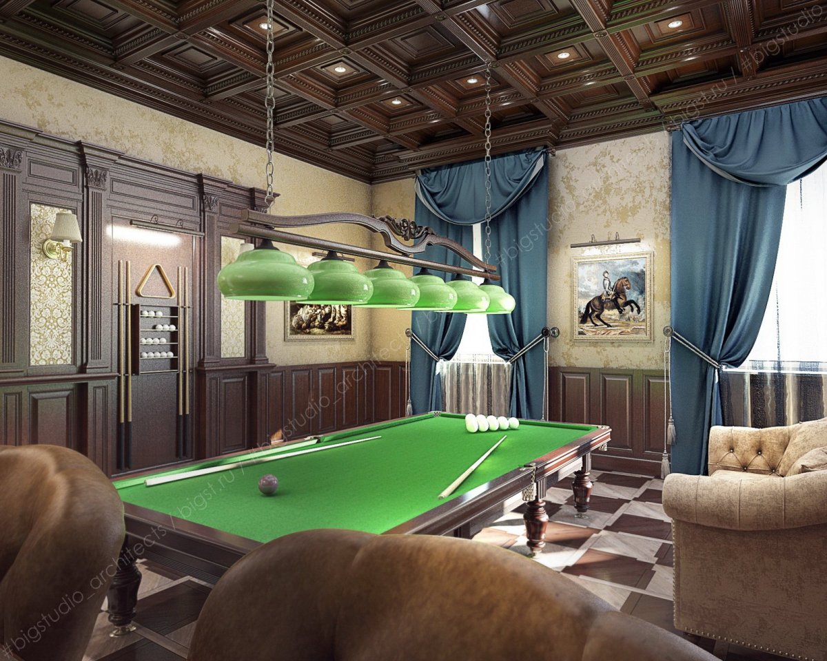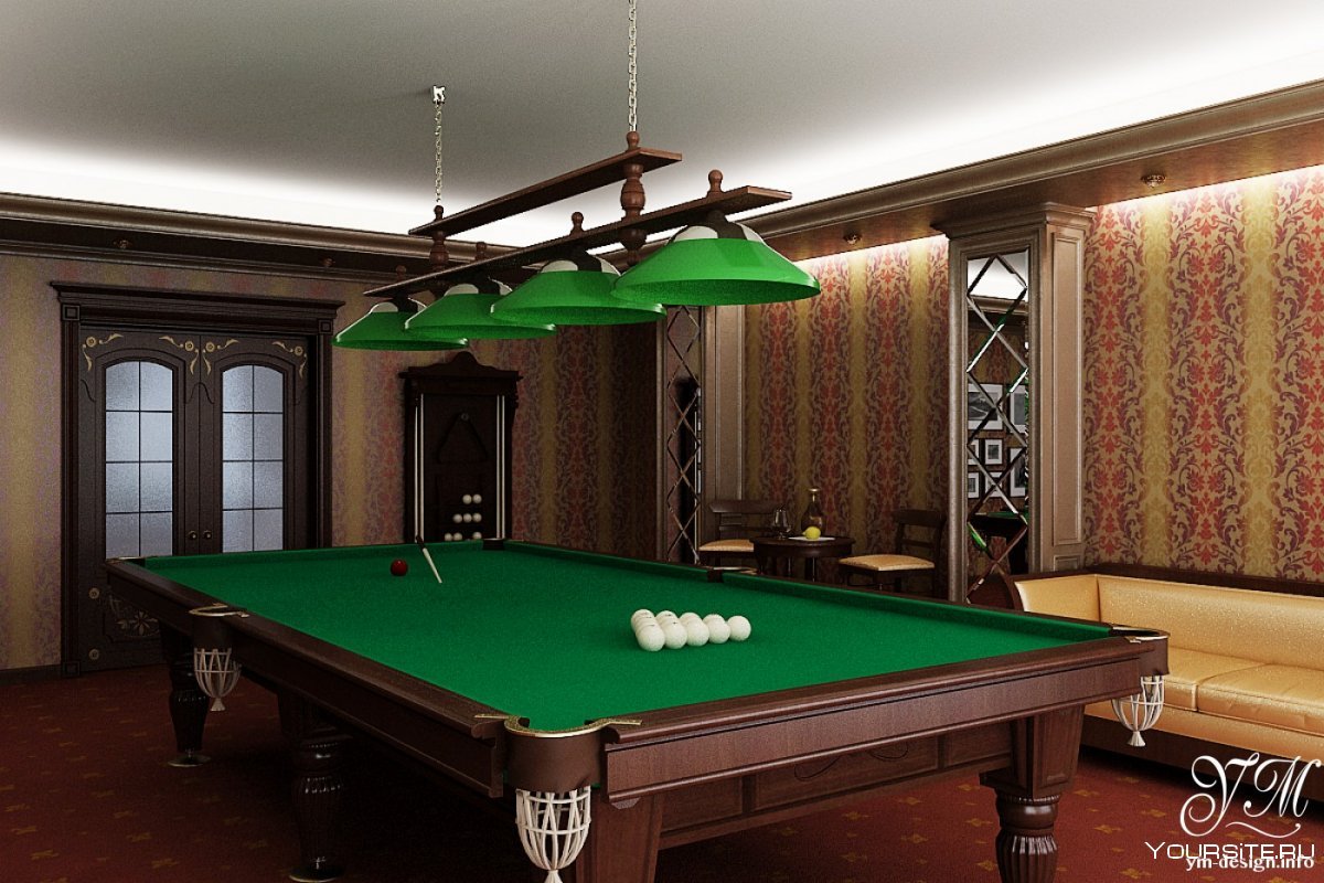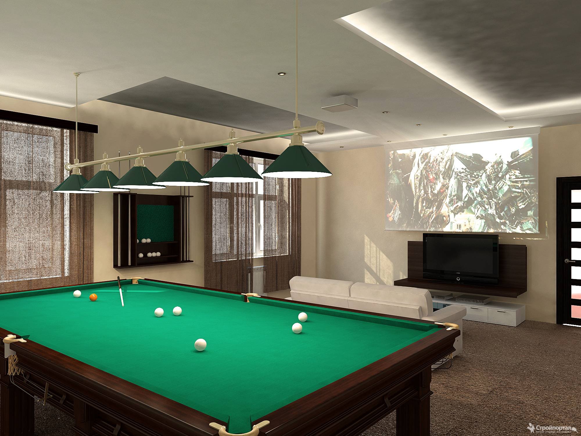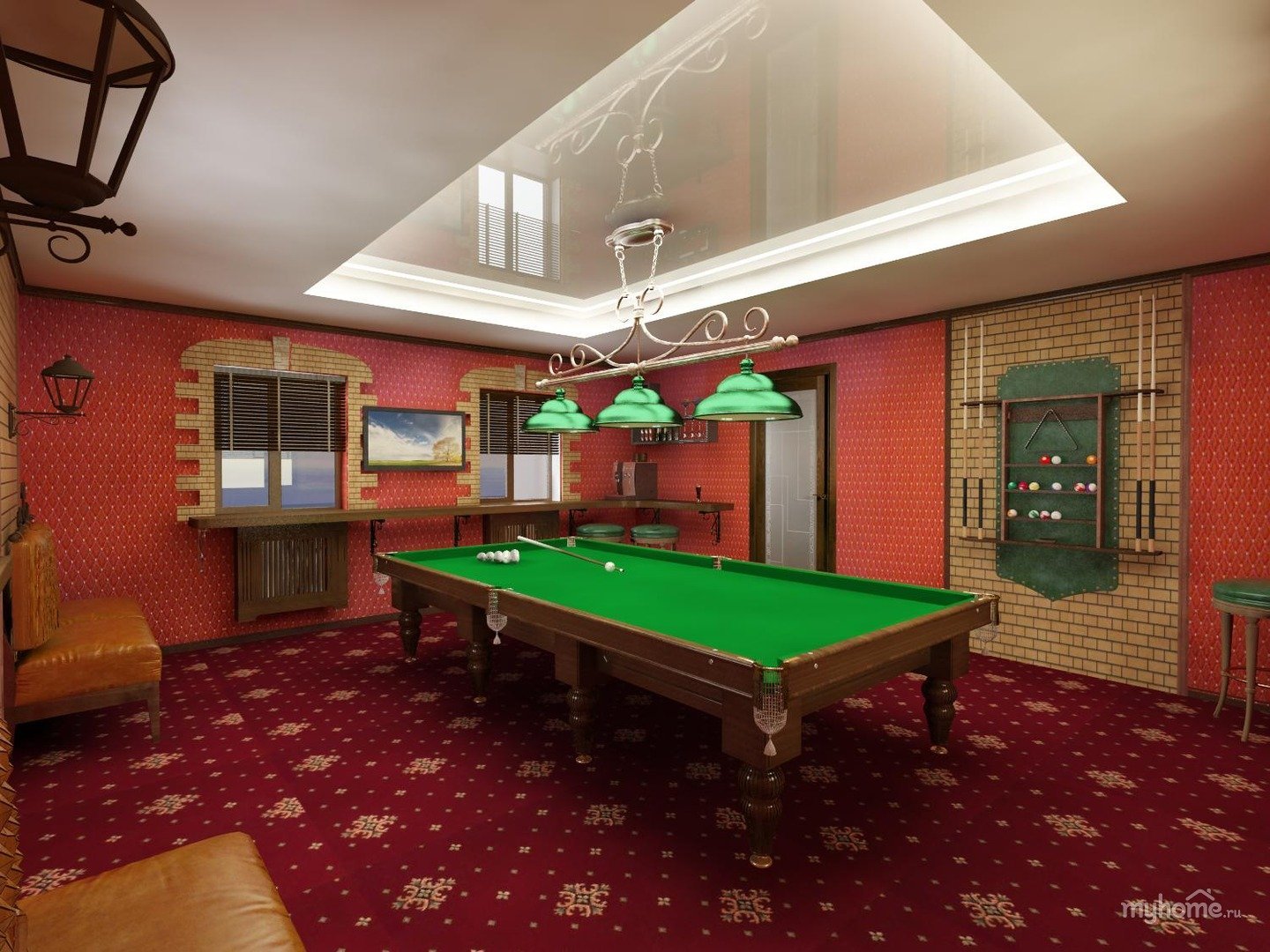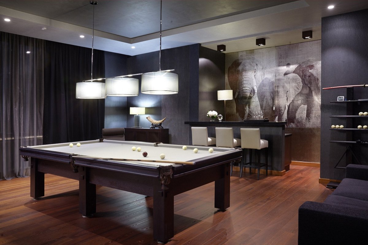 Дизайн бильярдной комнаты с барной стойкой в частном доме
