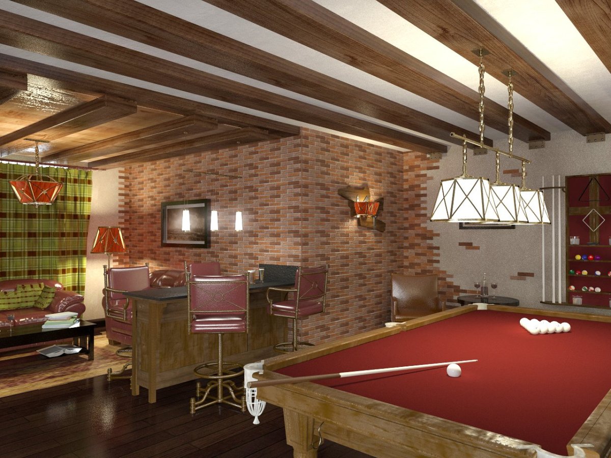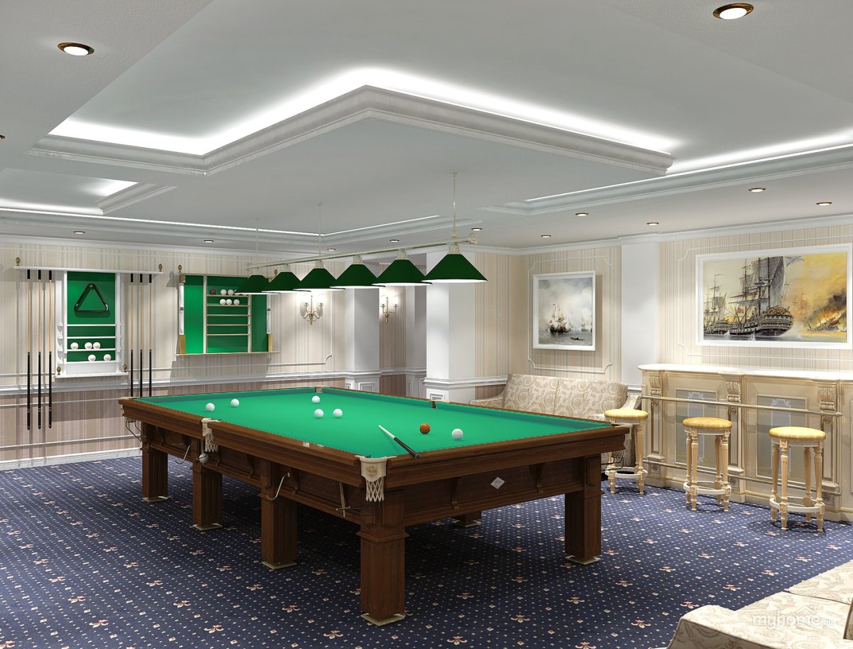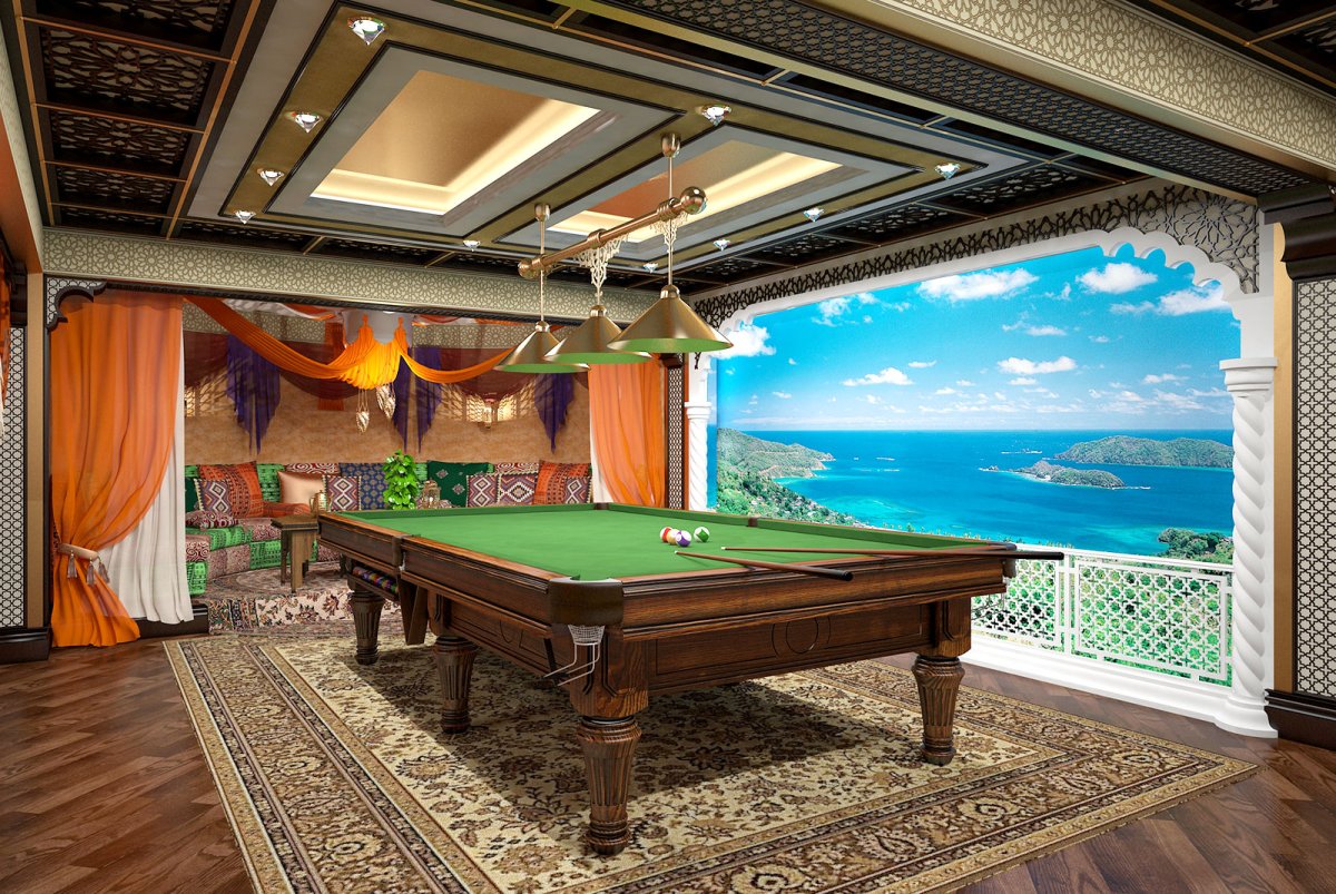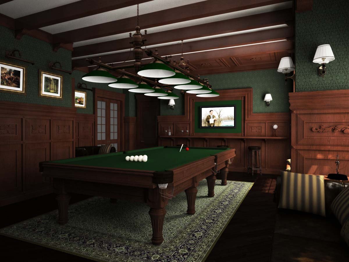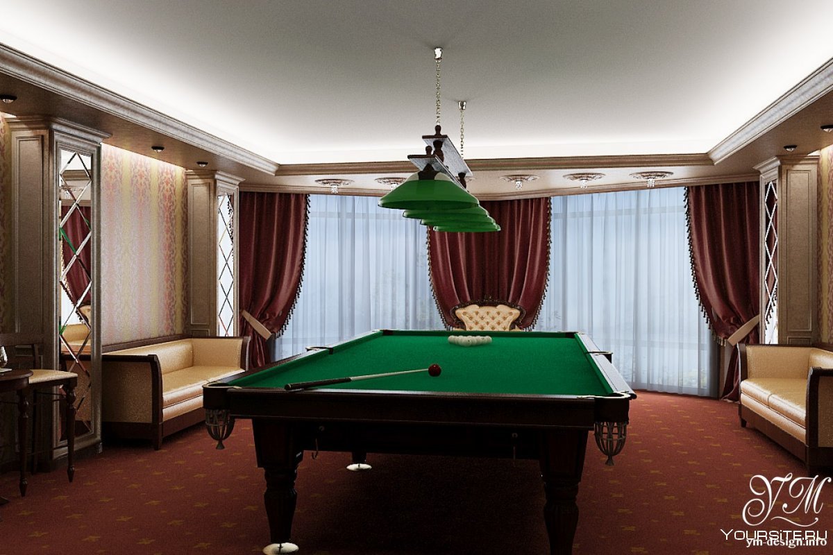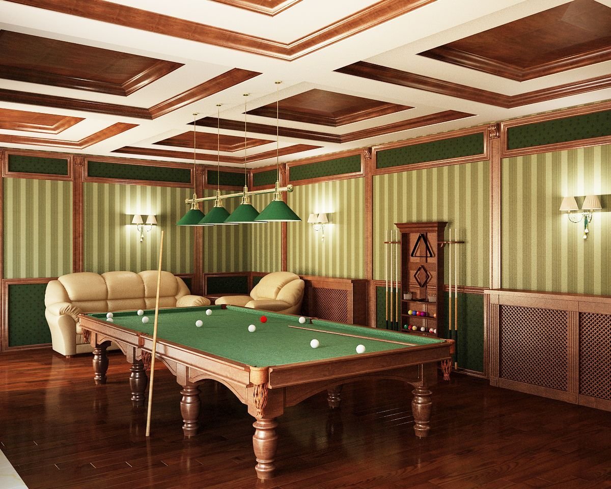 Дизайн бильярдной комнаты с барной стойкой в частном доме