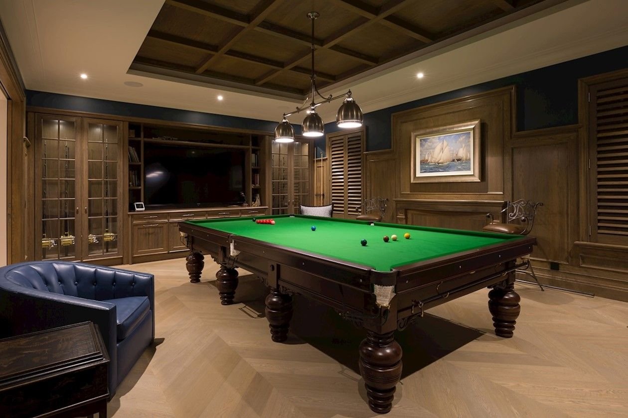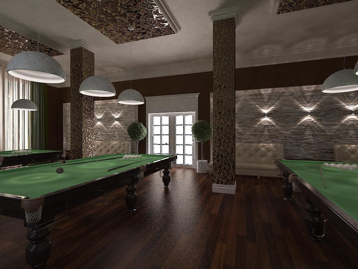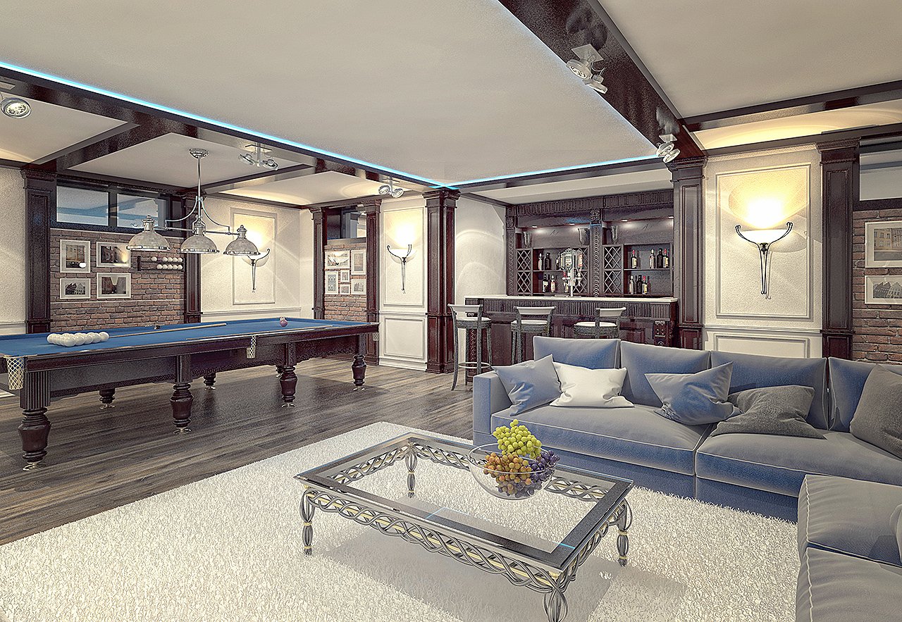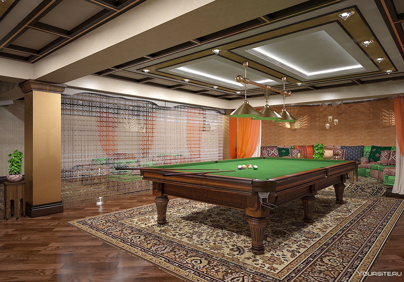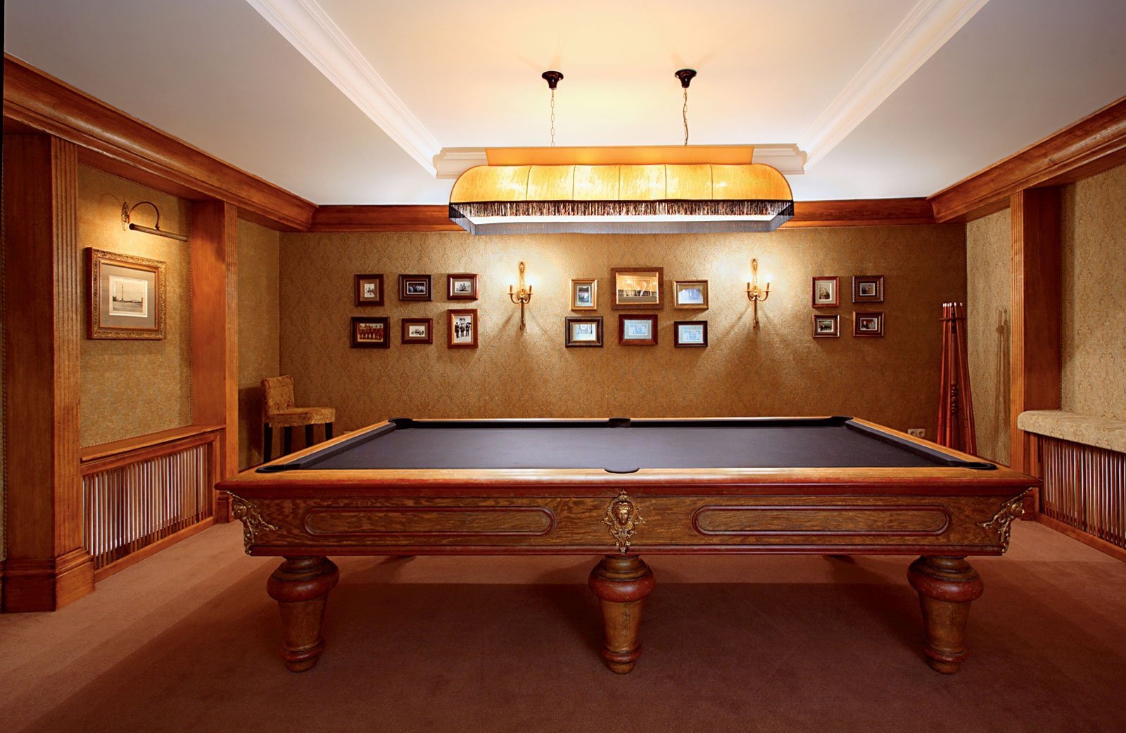 Дизайн бильярдной комнаты с барной стойкой в частном доме