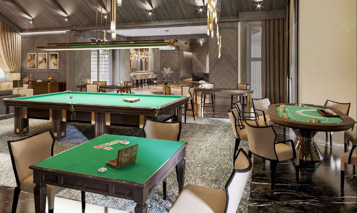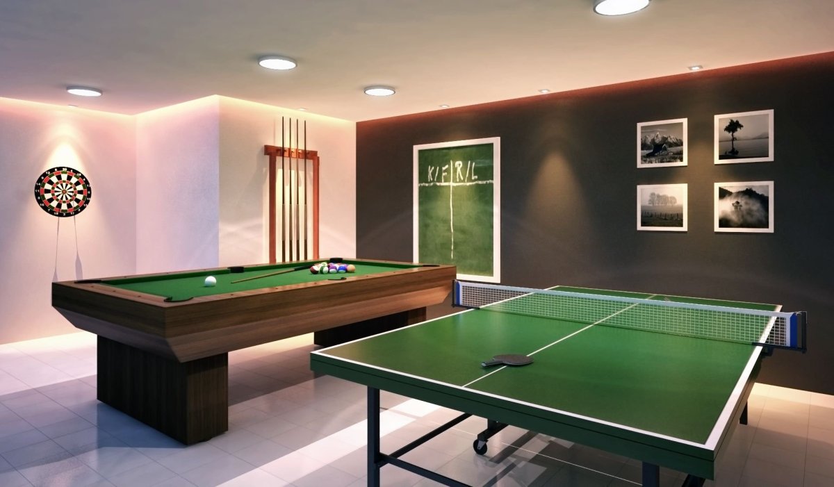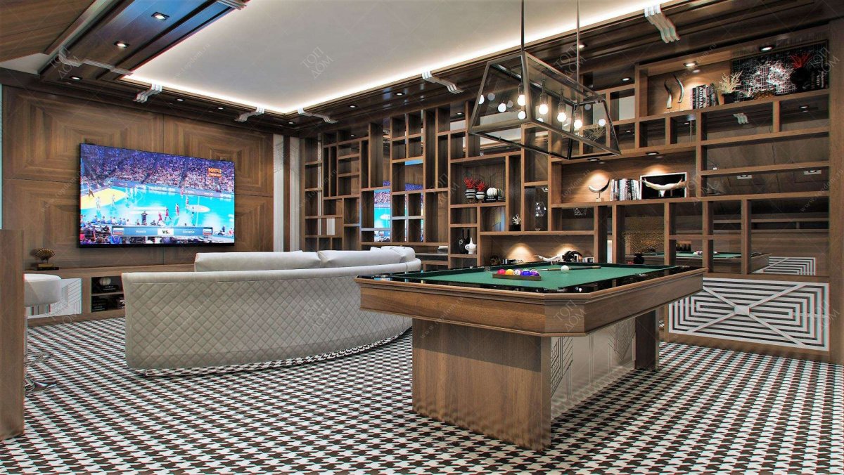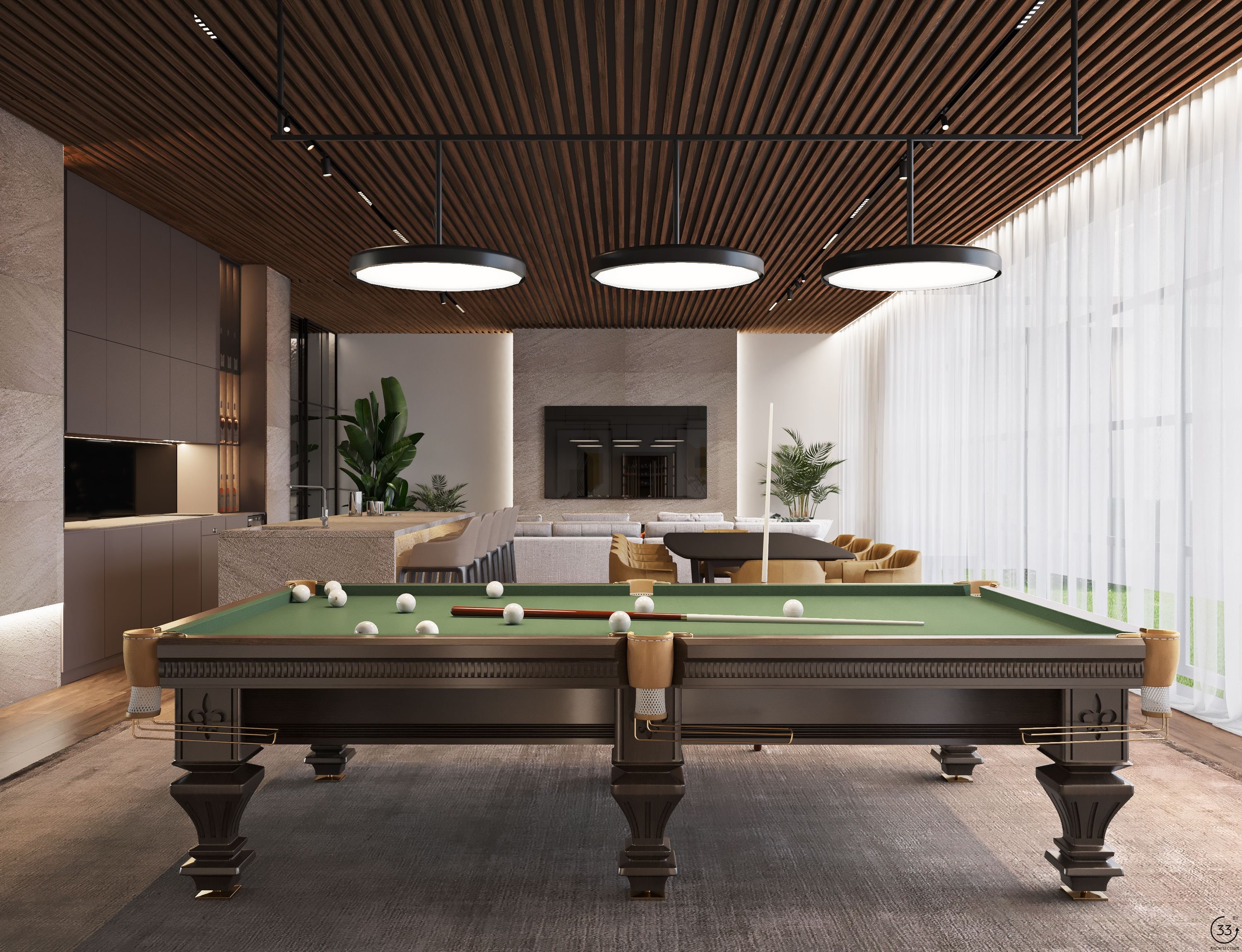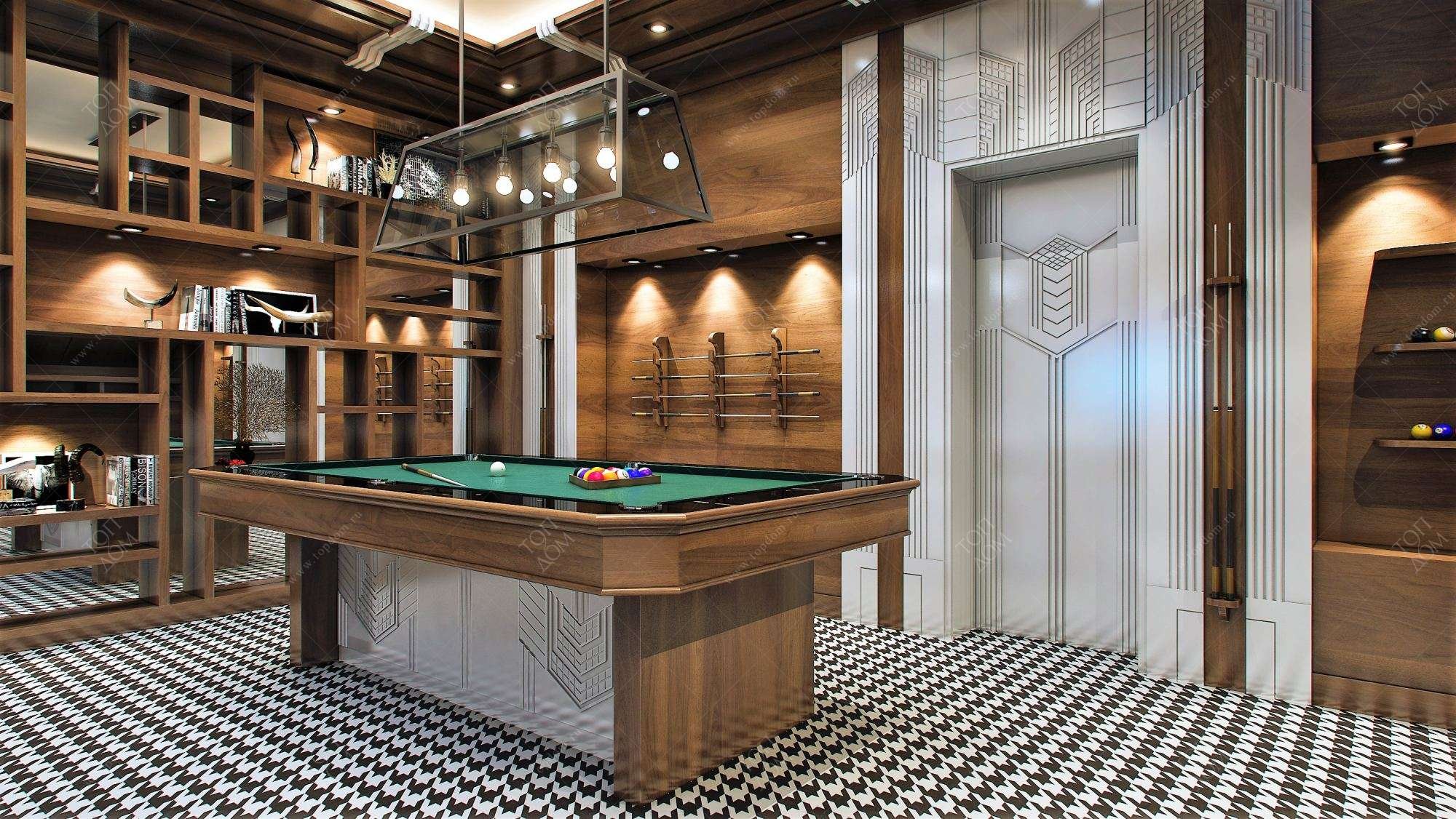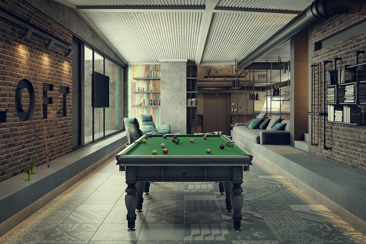 Дизайн бильярдной комнаты с барной стойкой в частном доме