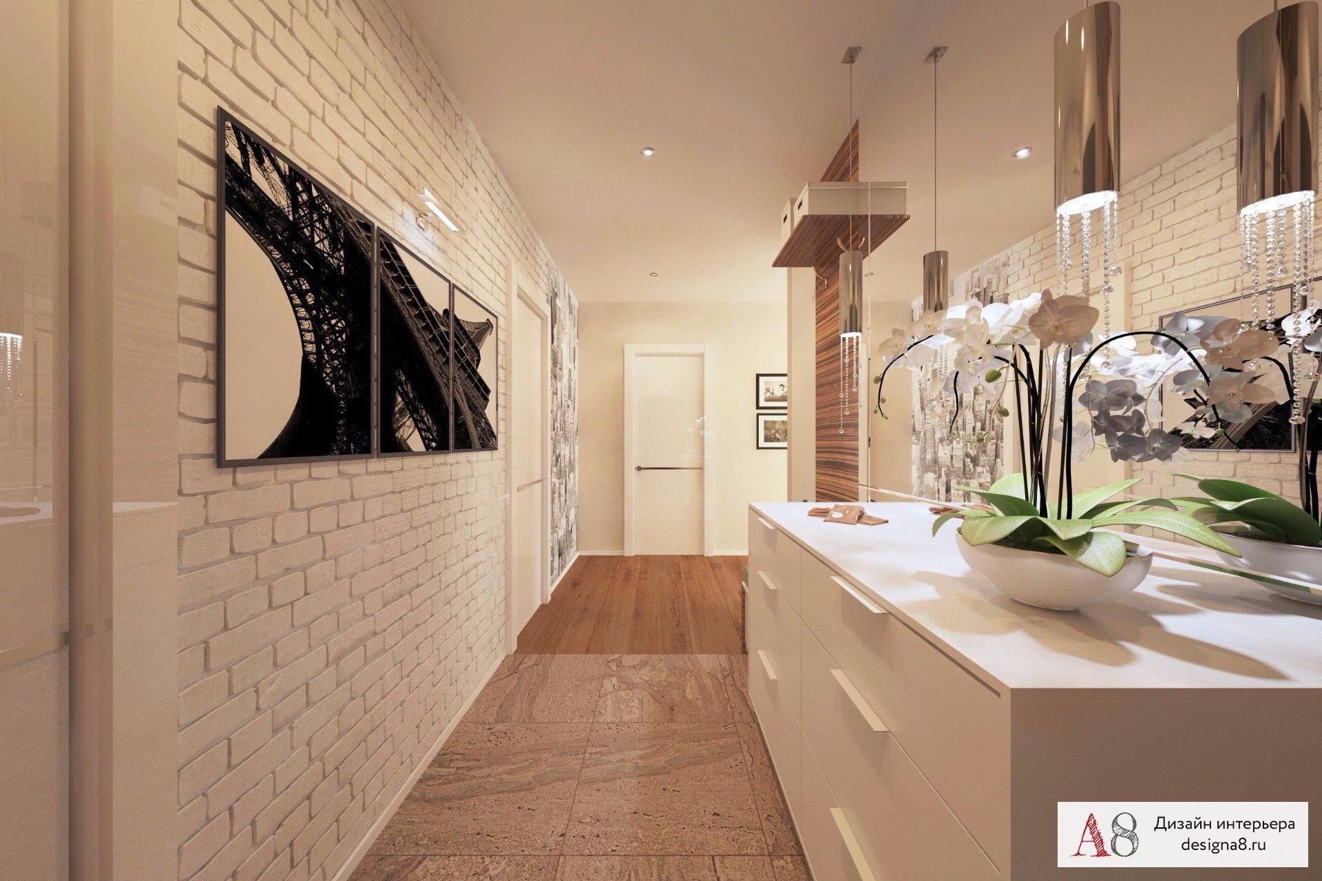 Светлая прихожая с кирпичной стеной