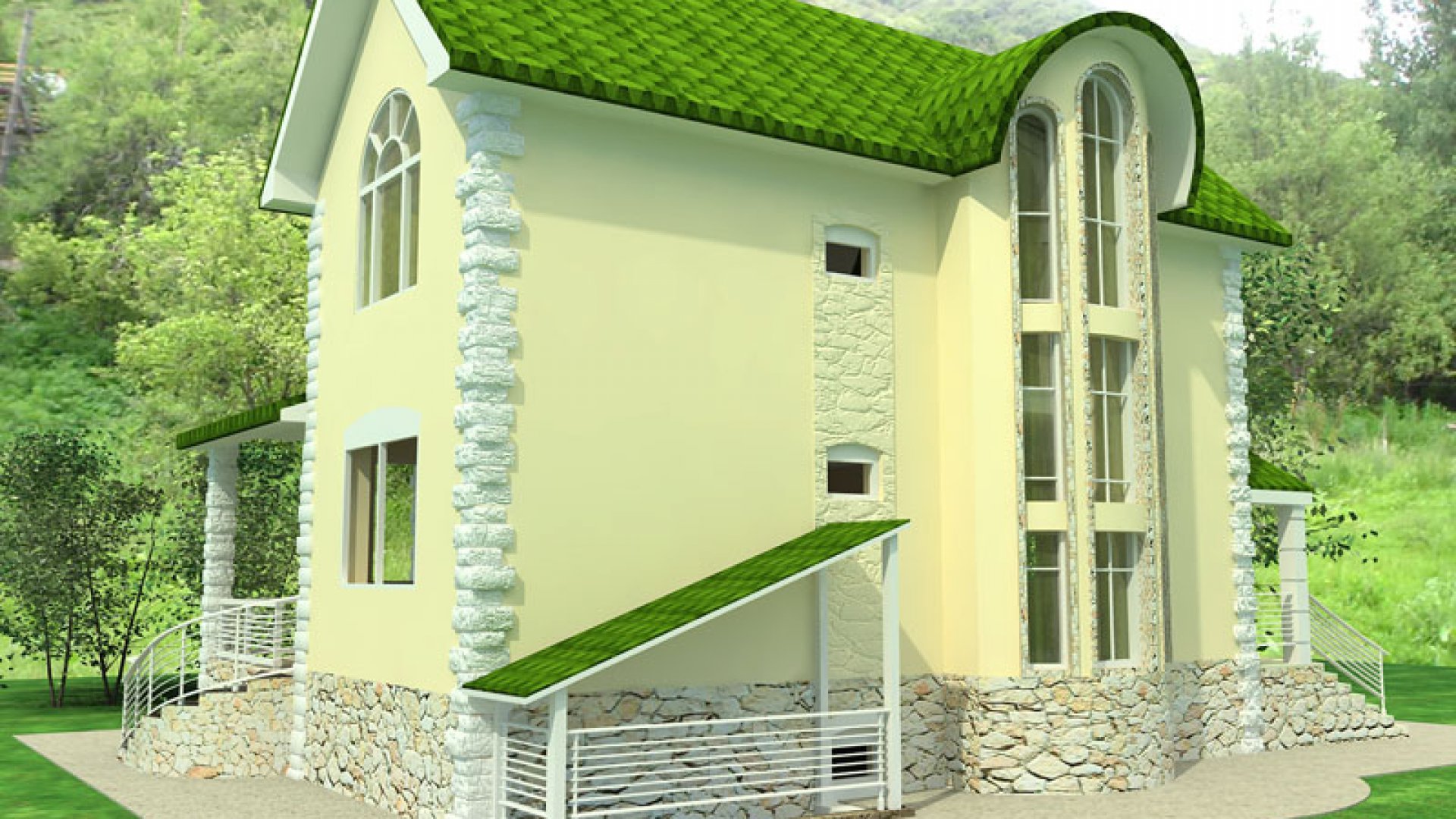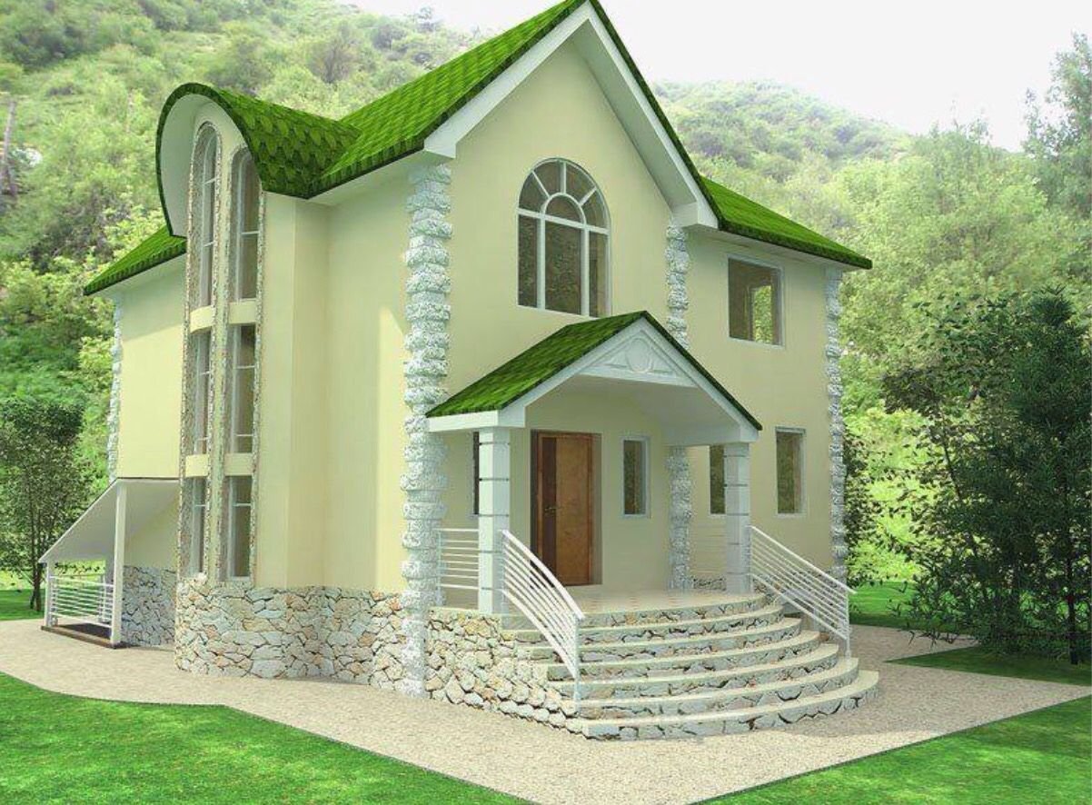 Фасады домов с зеленой крышей
