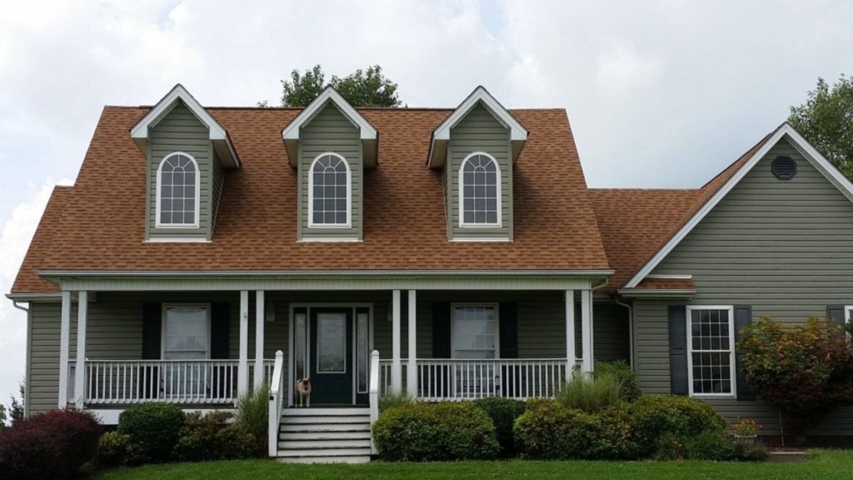 Серый фасад дома и коричневая крыша