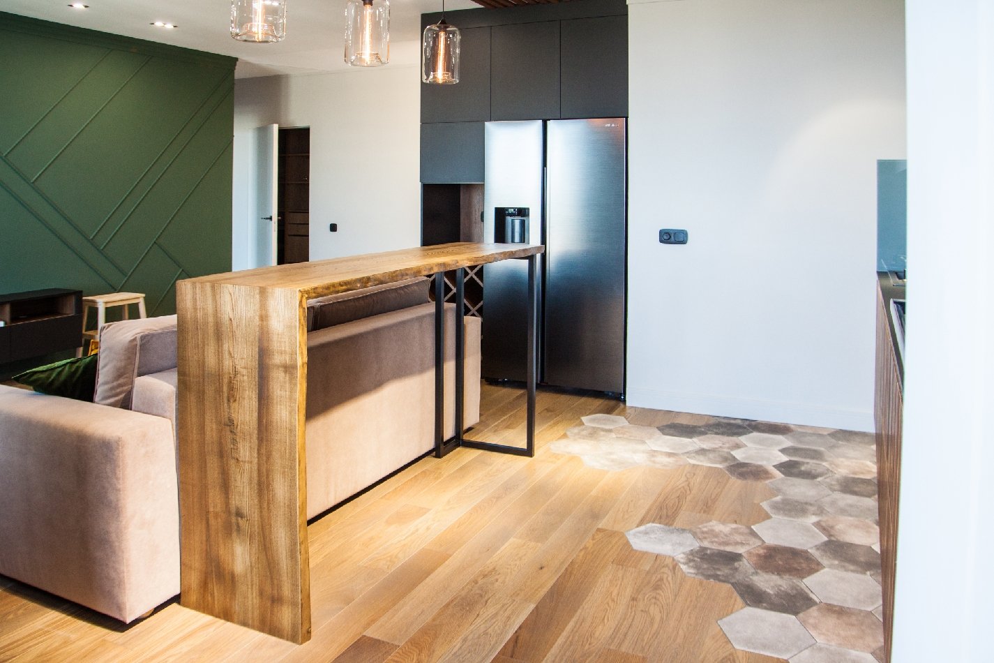 Барная стойка за диваном в гостиной