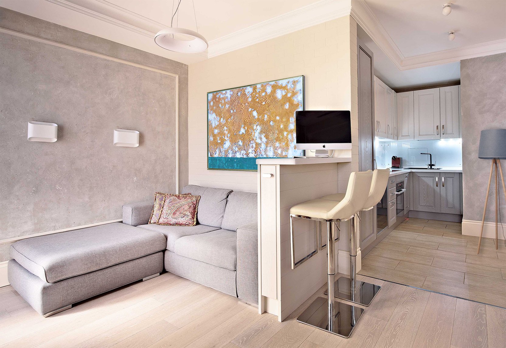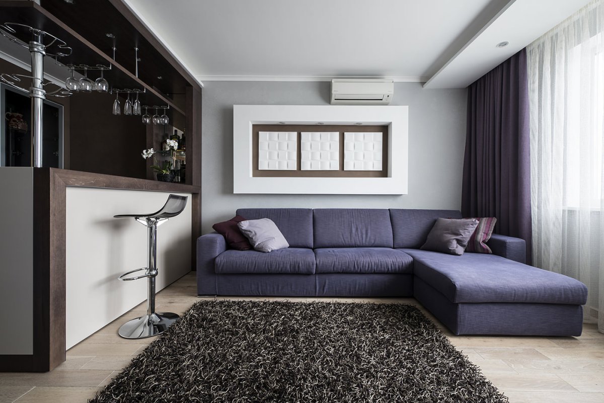 Студия с барной стойкой за диваном
