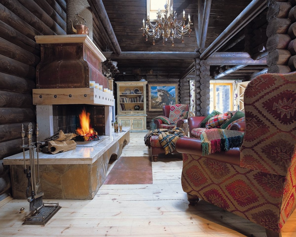 Интерьер охотничьего домика с камином