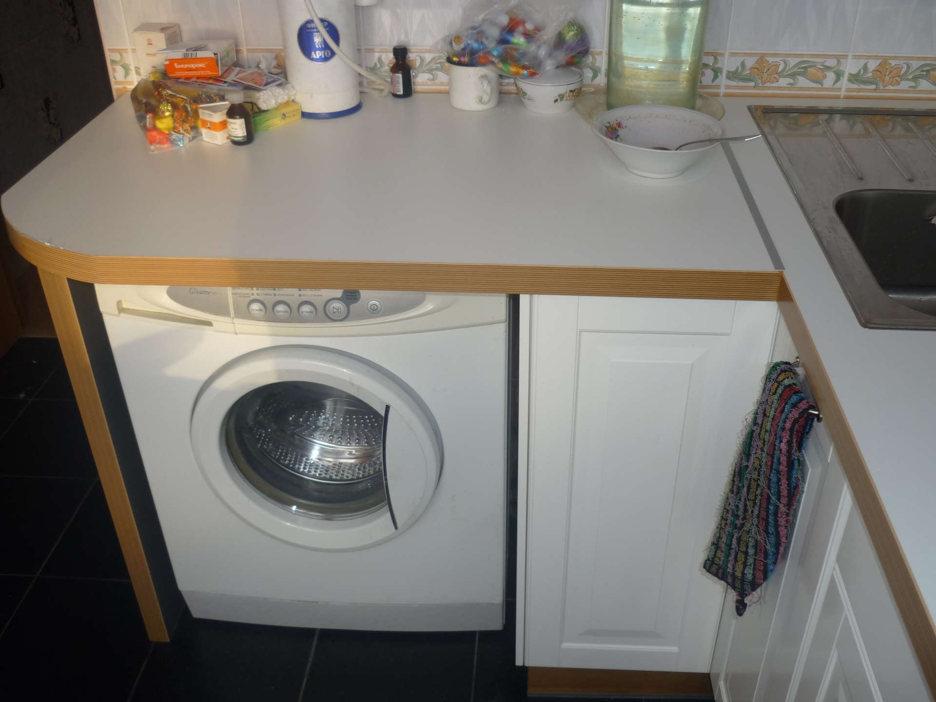 Стиральная машинка на кухне под столешницей