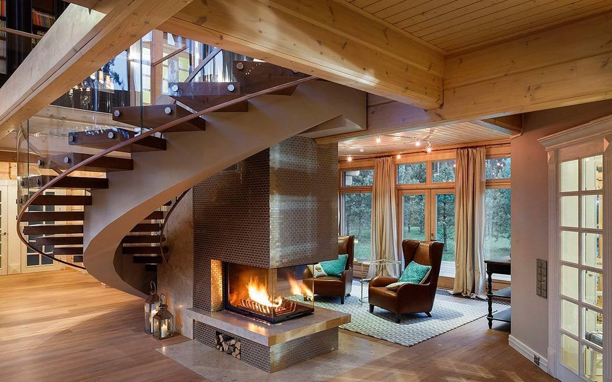 Камин в интерьере деревянного дома