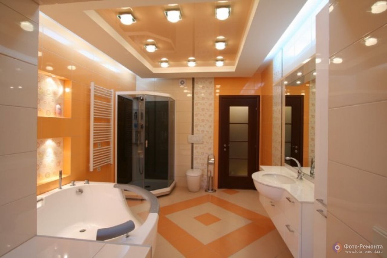 Потолок в ванной с точечными светильниками