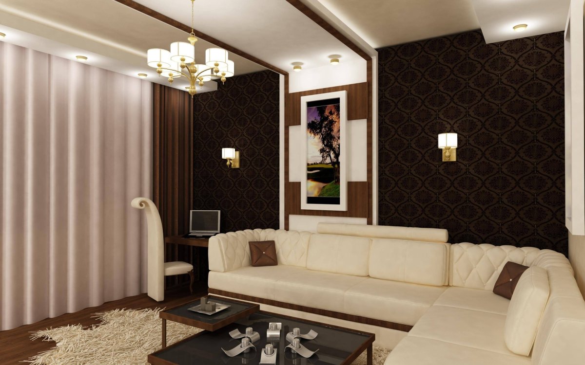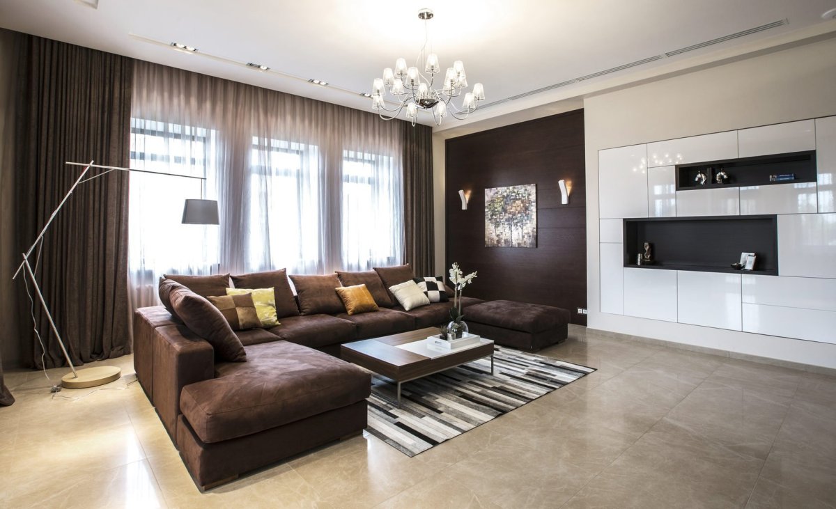 Коричневые стены в интерьере гостиной