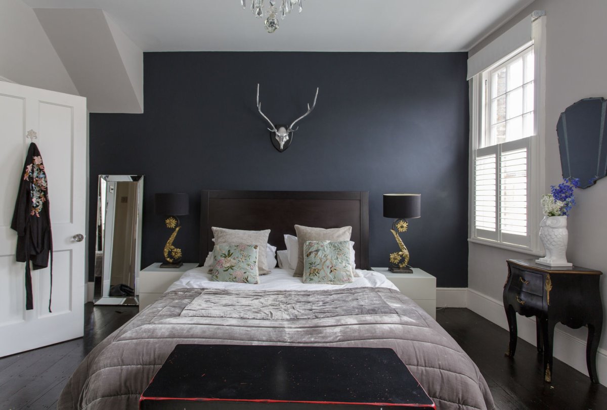 Спальня с темными стенами
