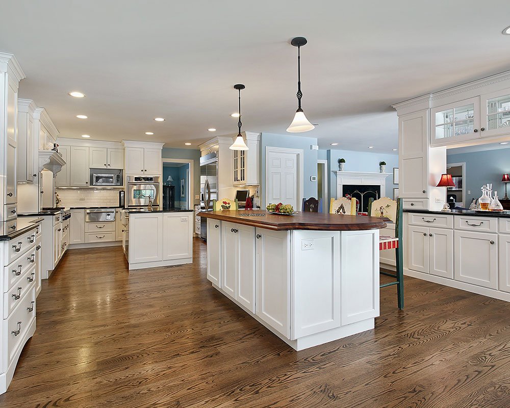 Белая кухня с деревянной столешницей