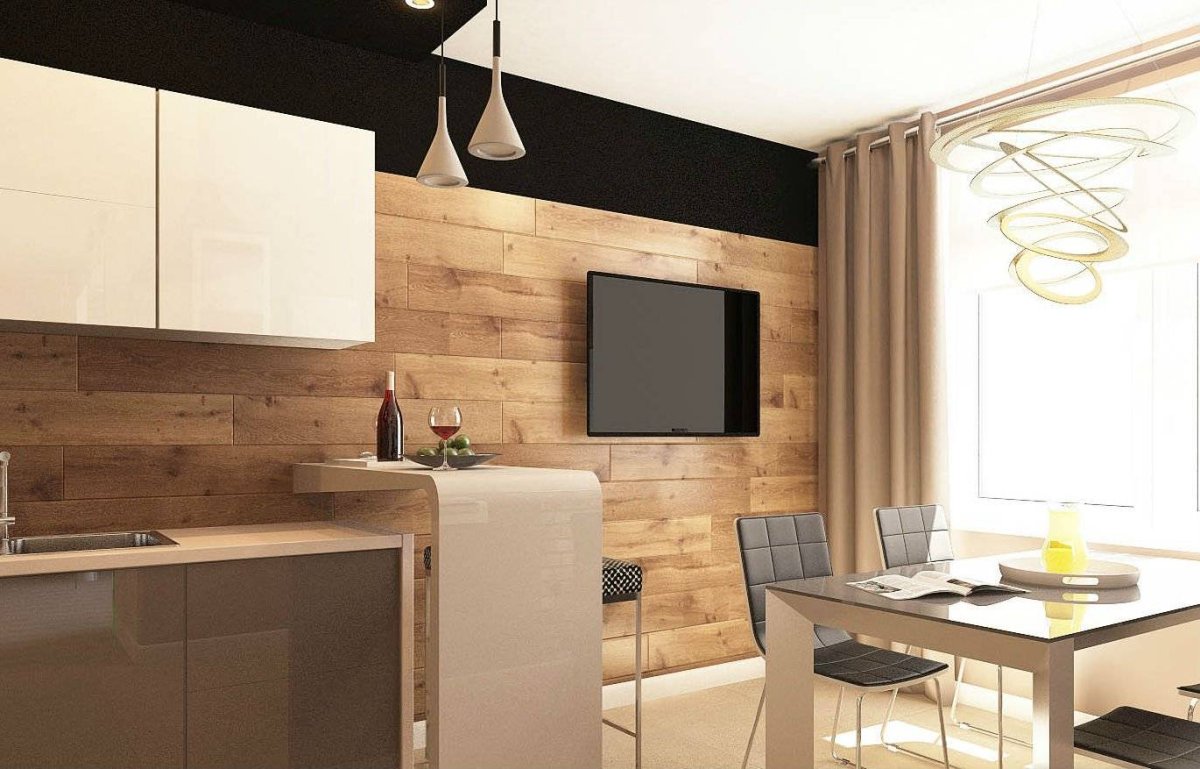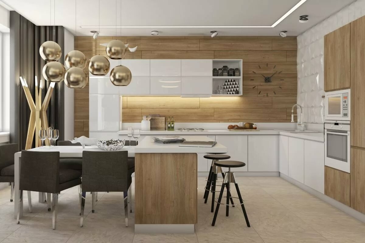 Кухня гостиная белая с деревом