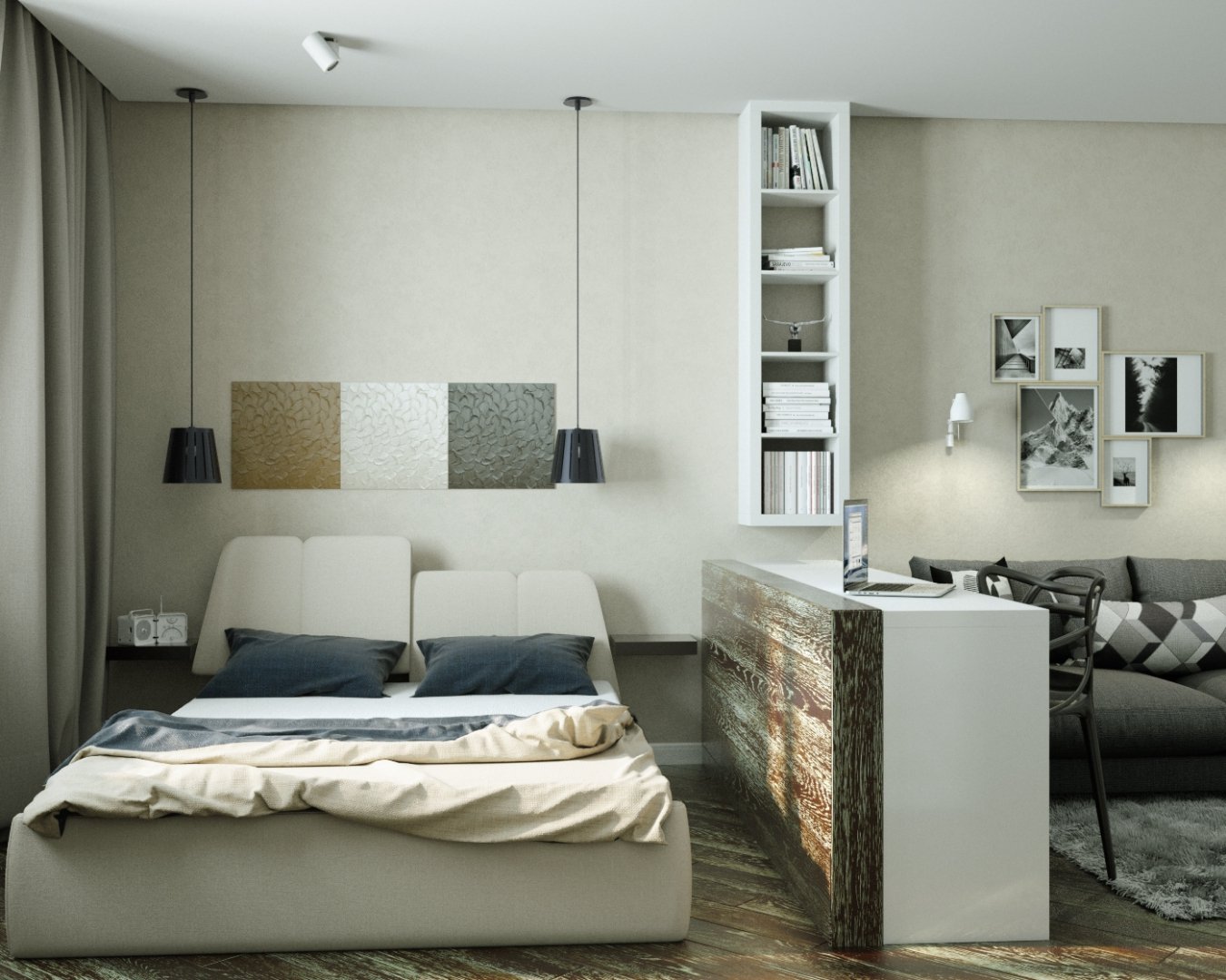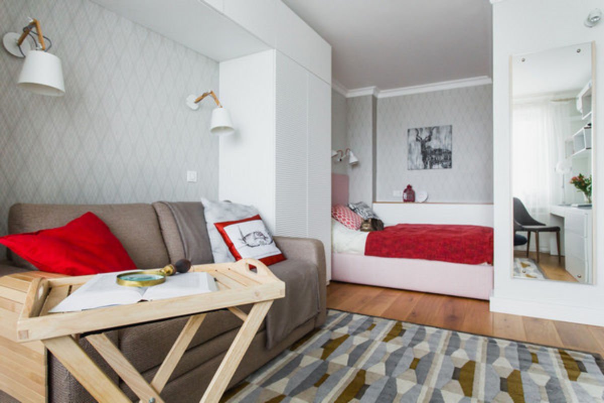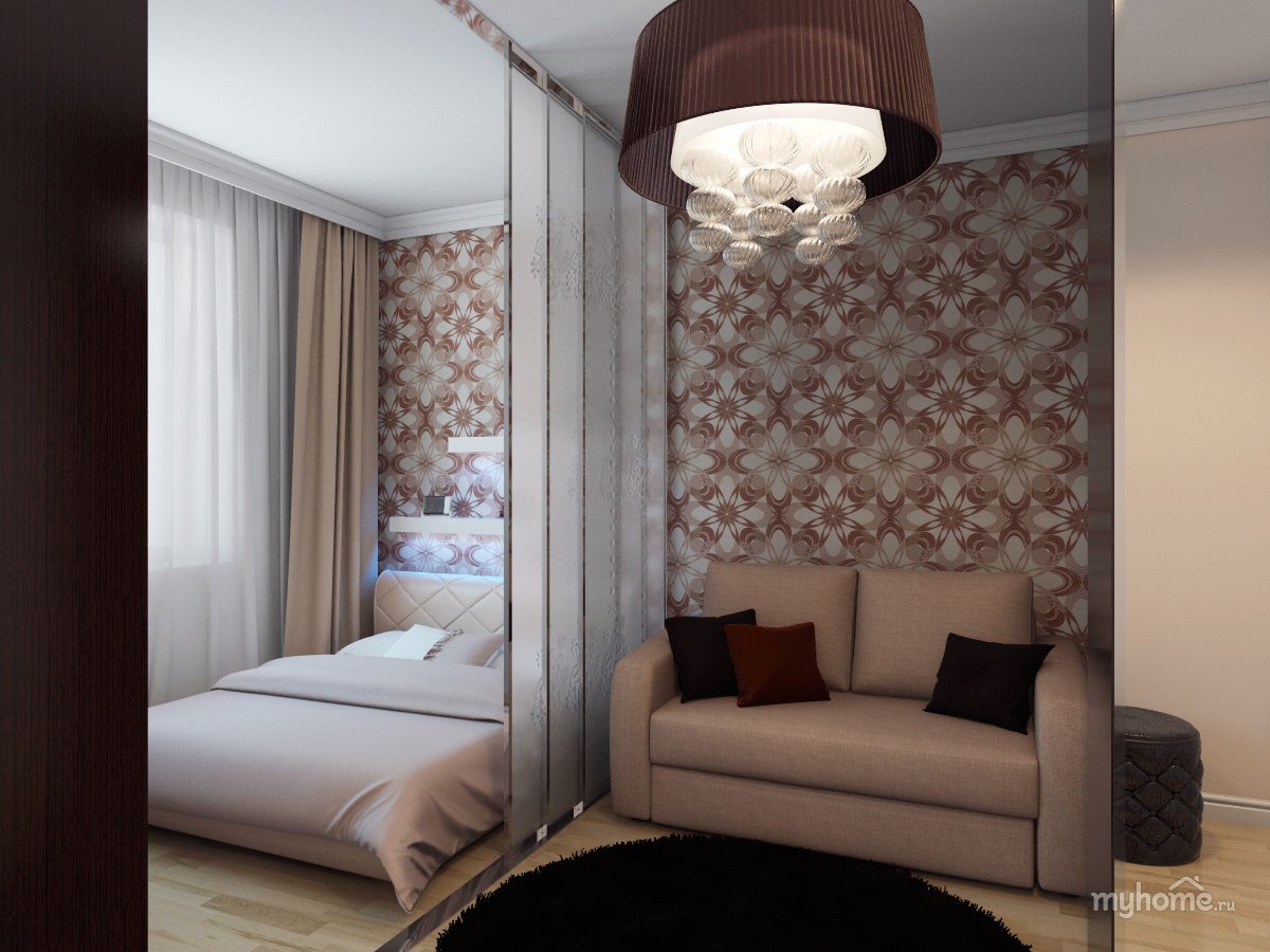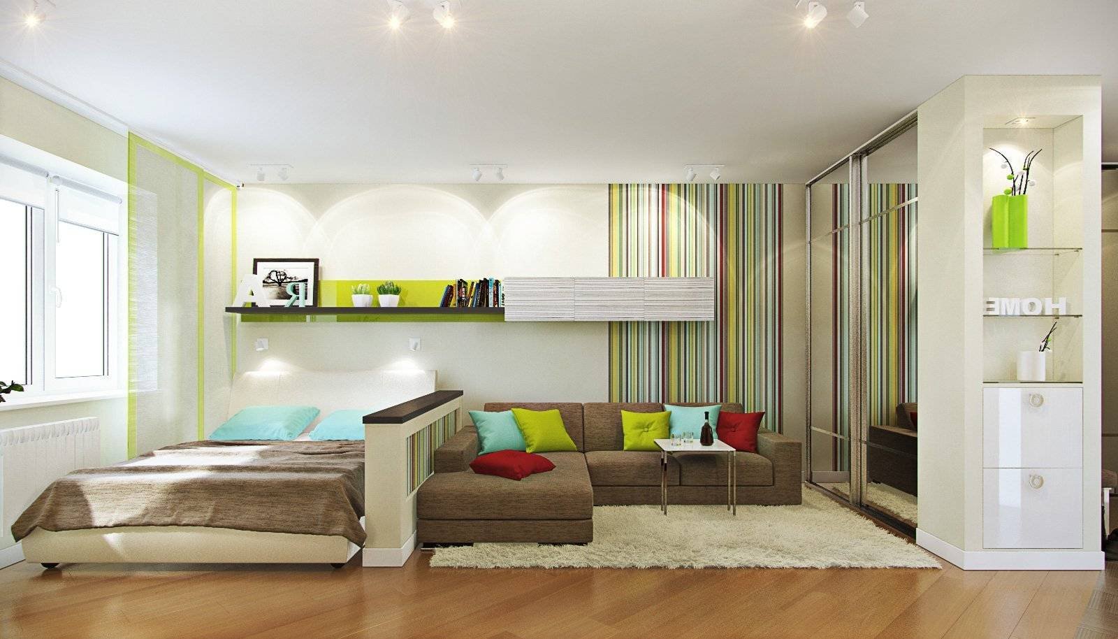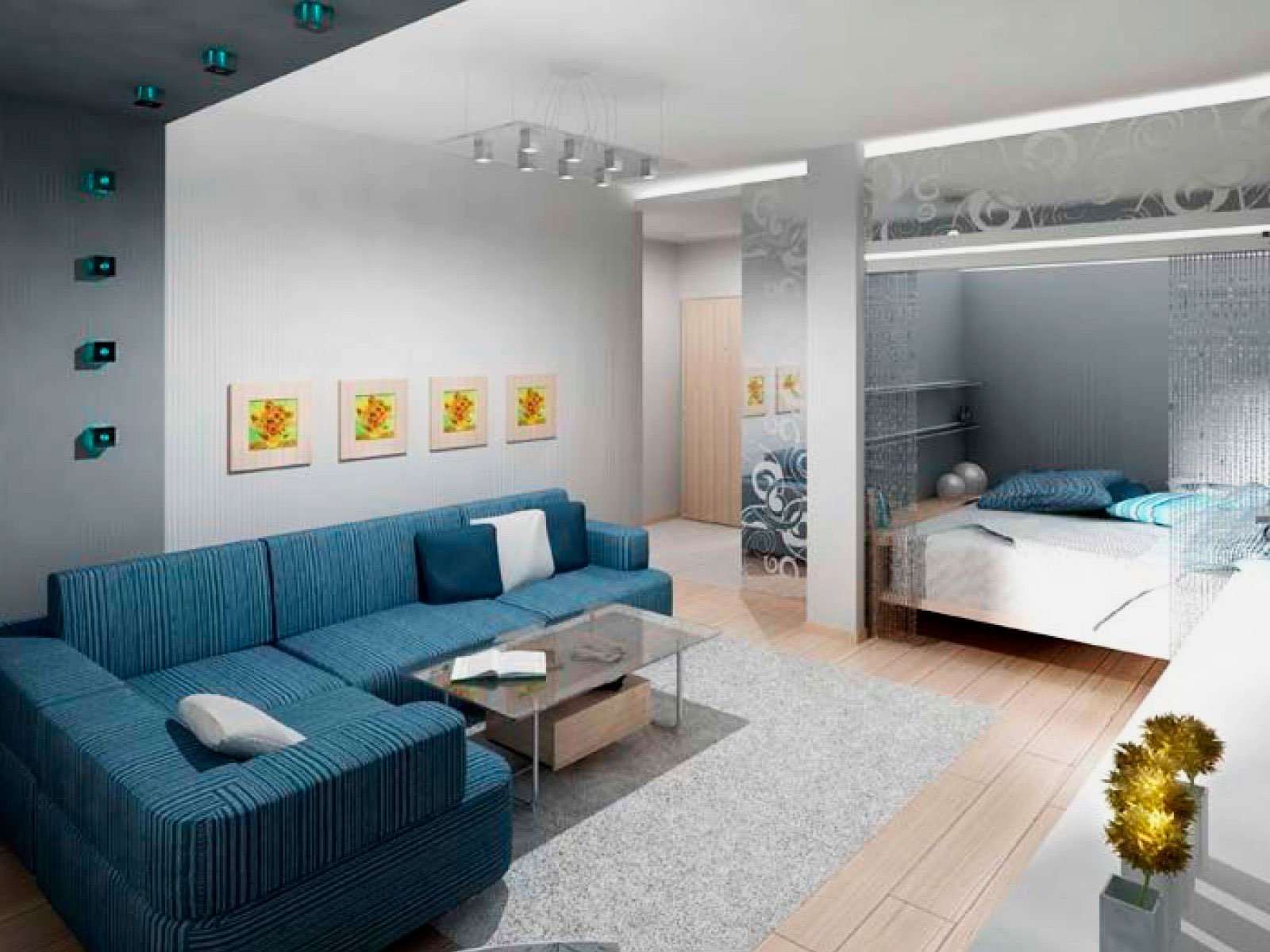Интерьер однокомнатной квартиры с кроватью и диваном
