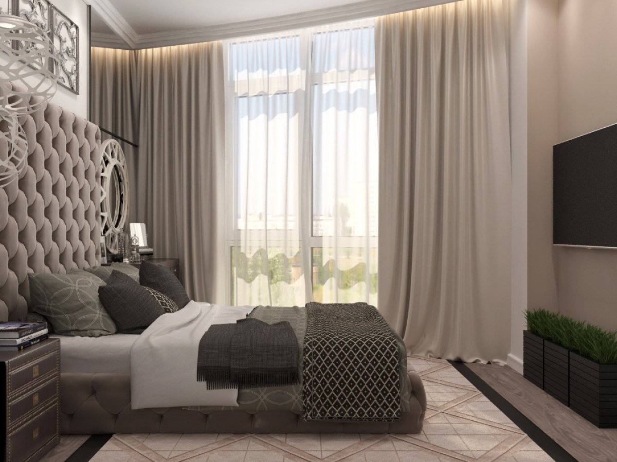 Серые шторы в бежевой спальне