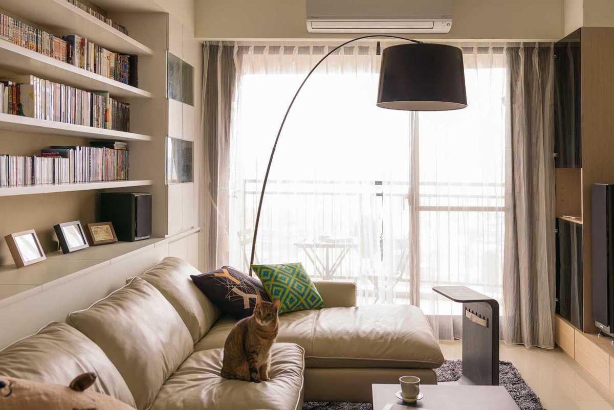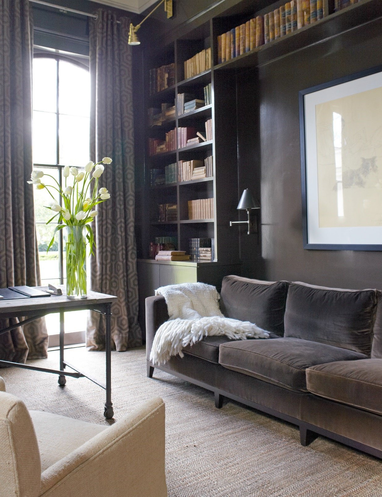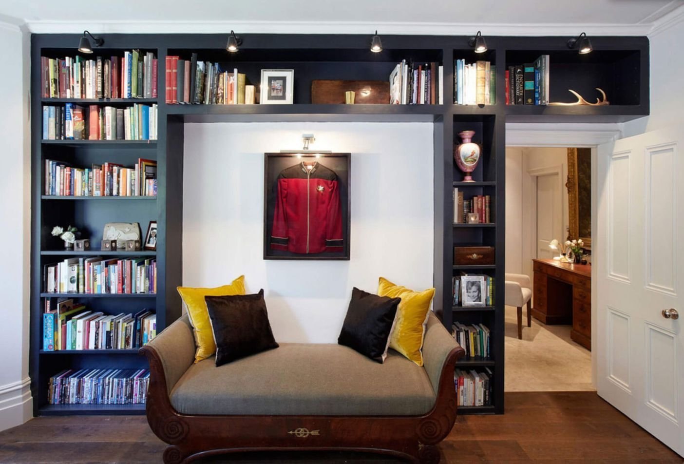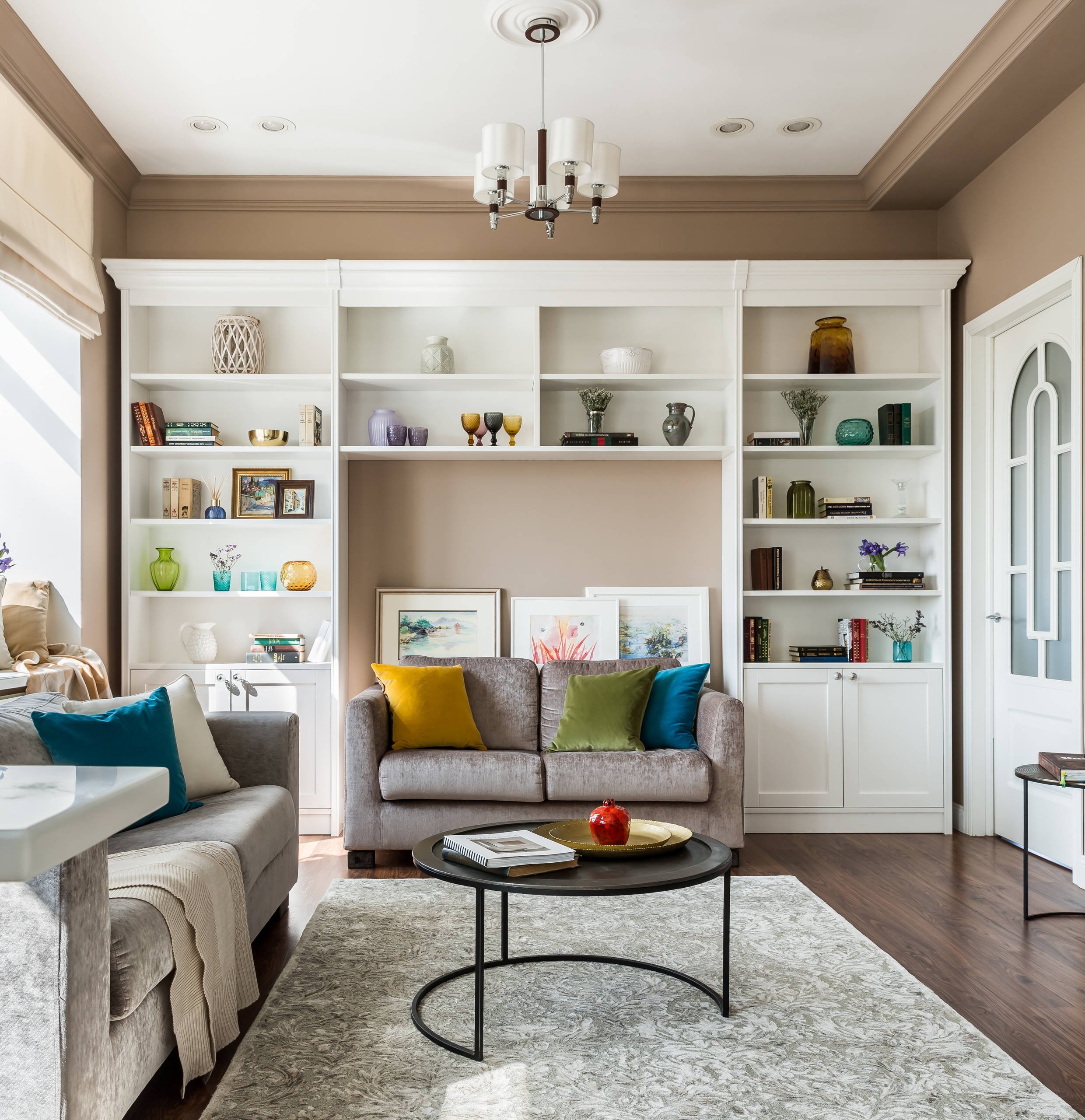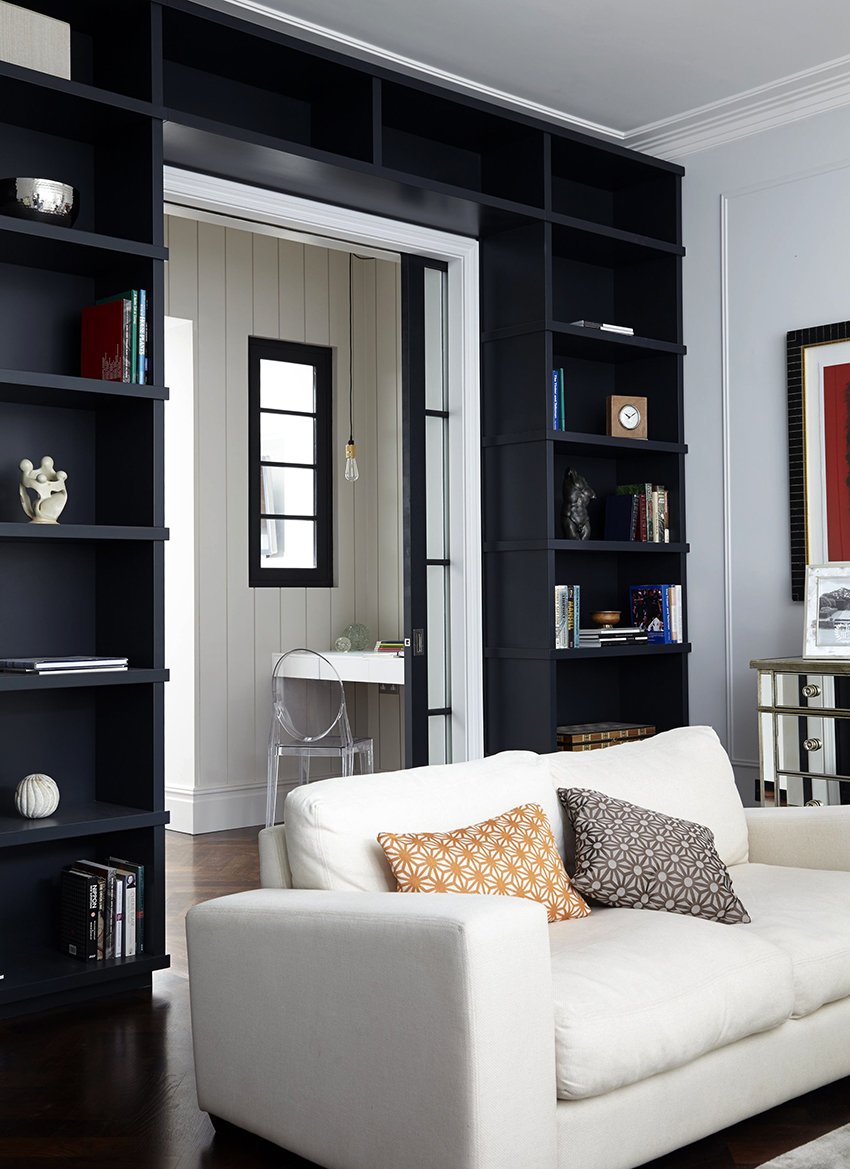 Книжный шкаф за диваном в гостиной