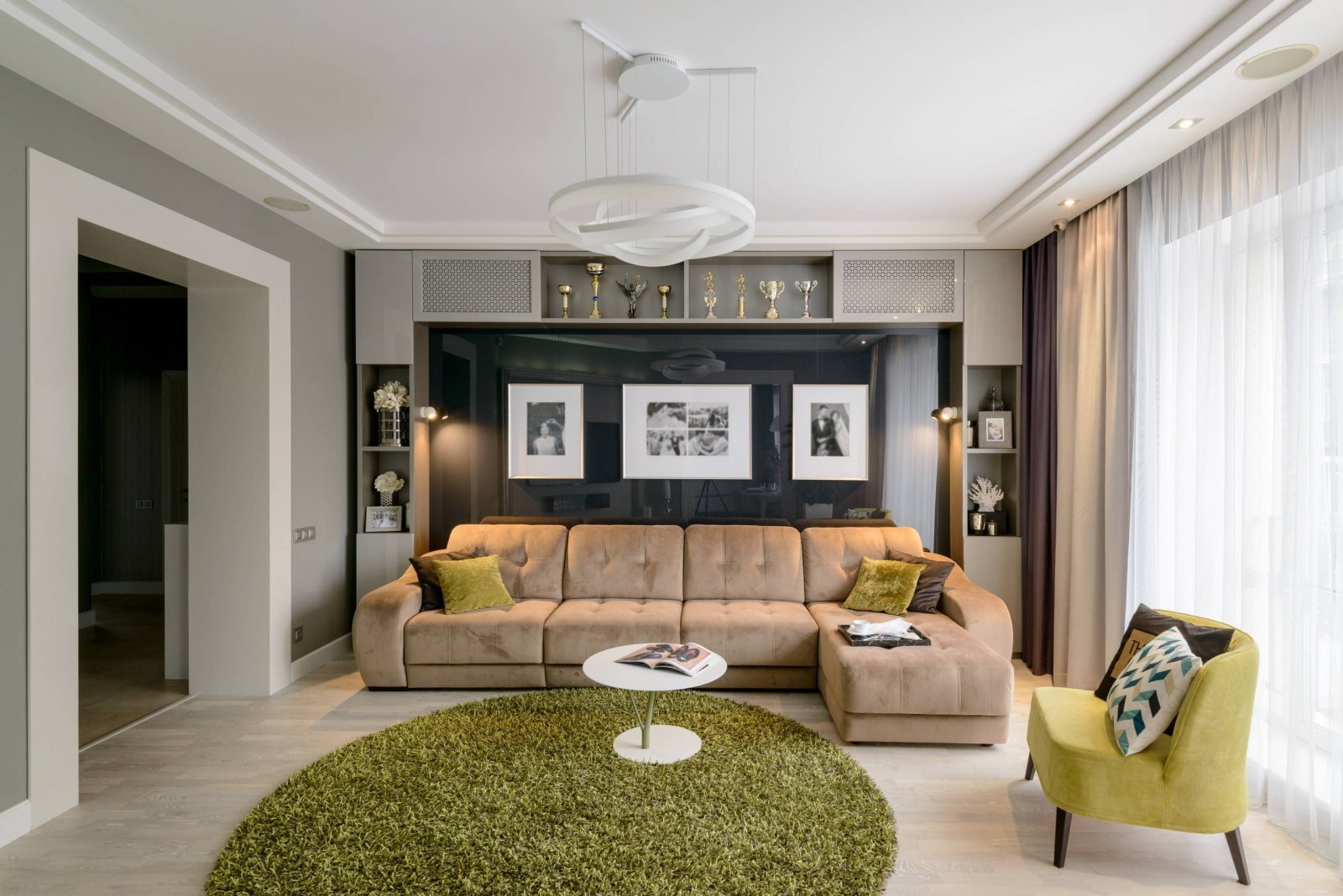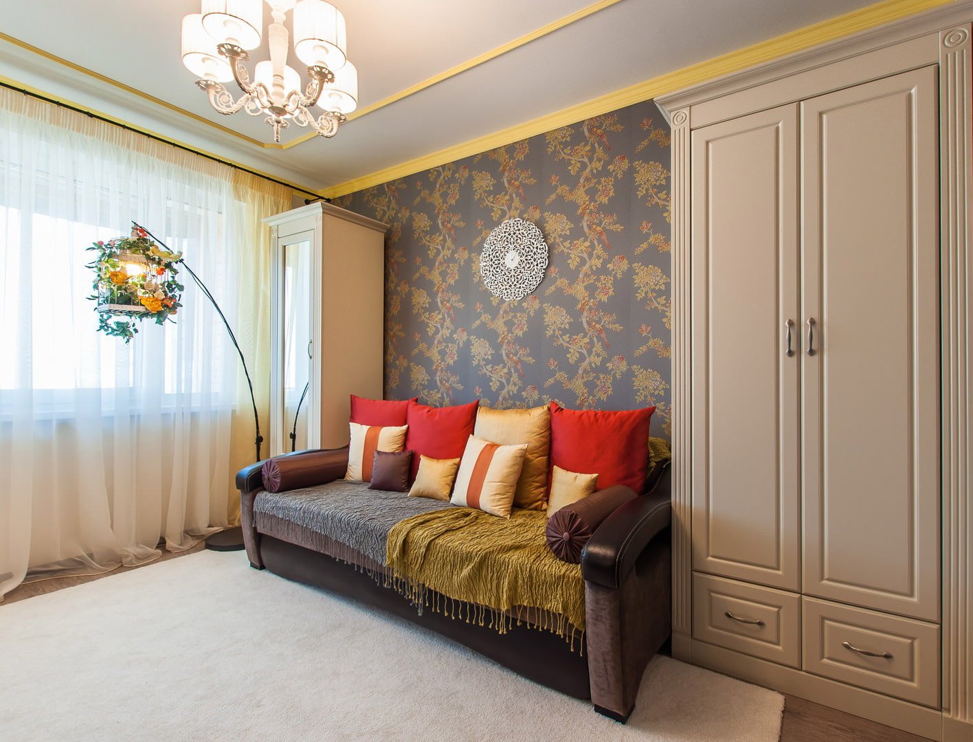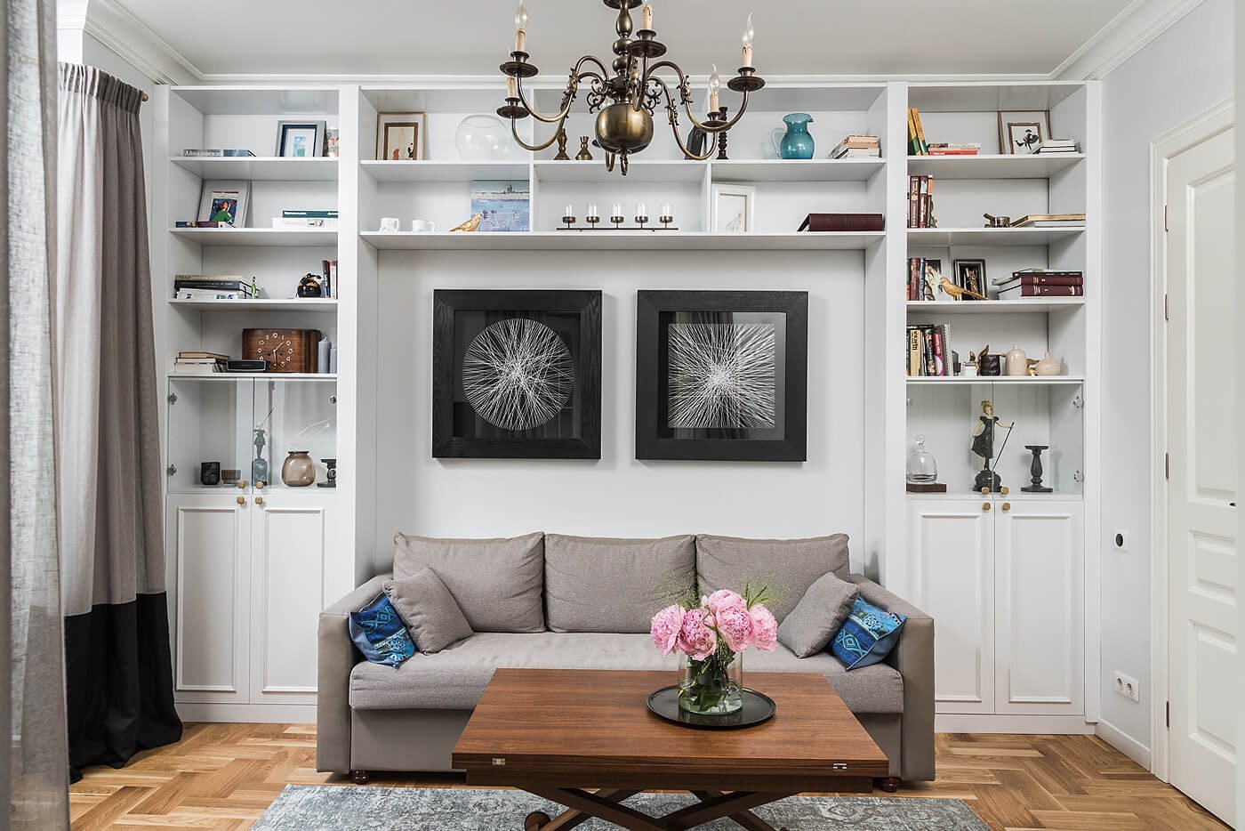 Навесной шкаф над диваном в гостиной