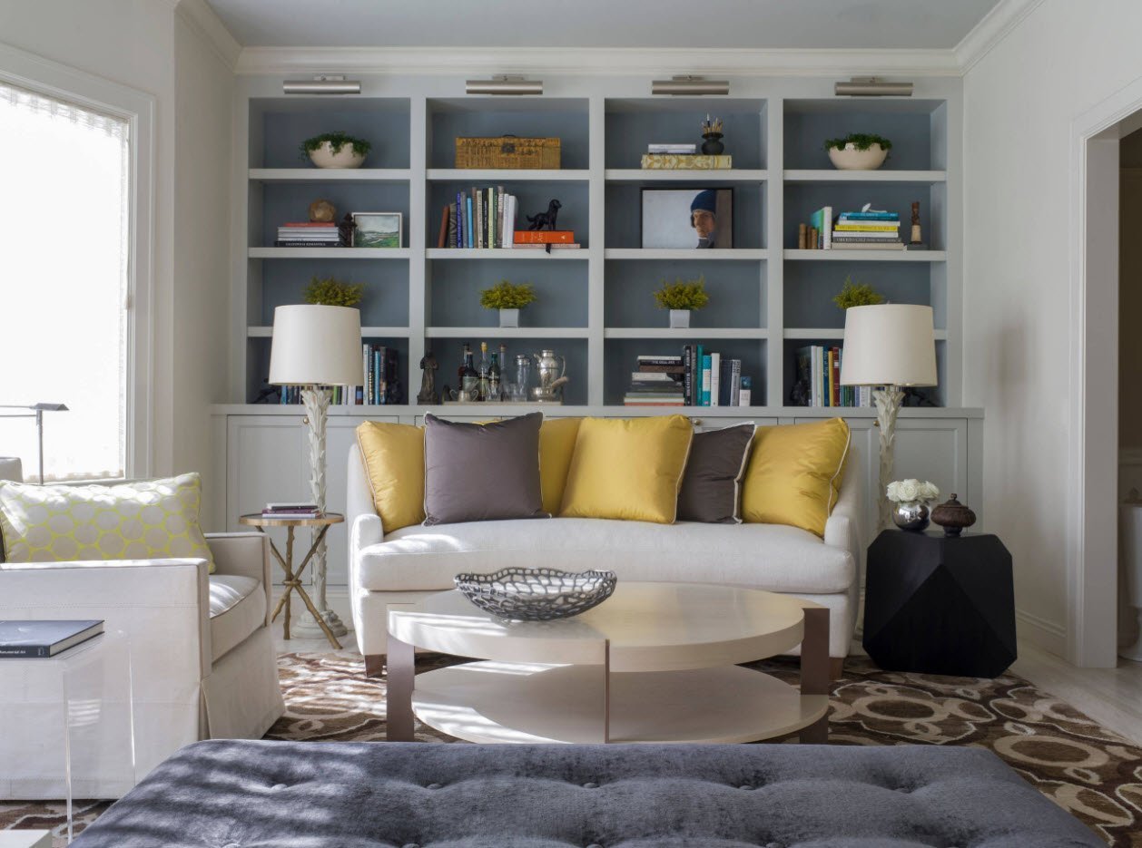 Стеллаж за диваном в гостиной