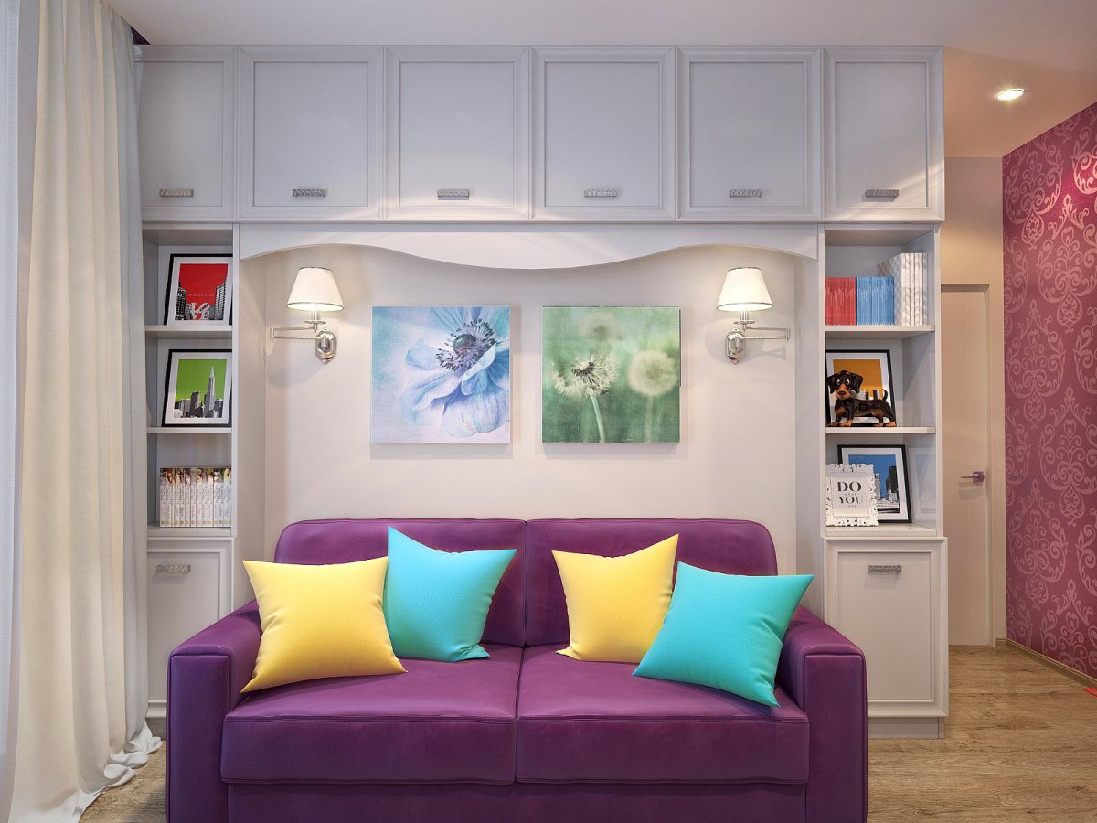 Шкаф над диваном в гостиной