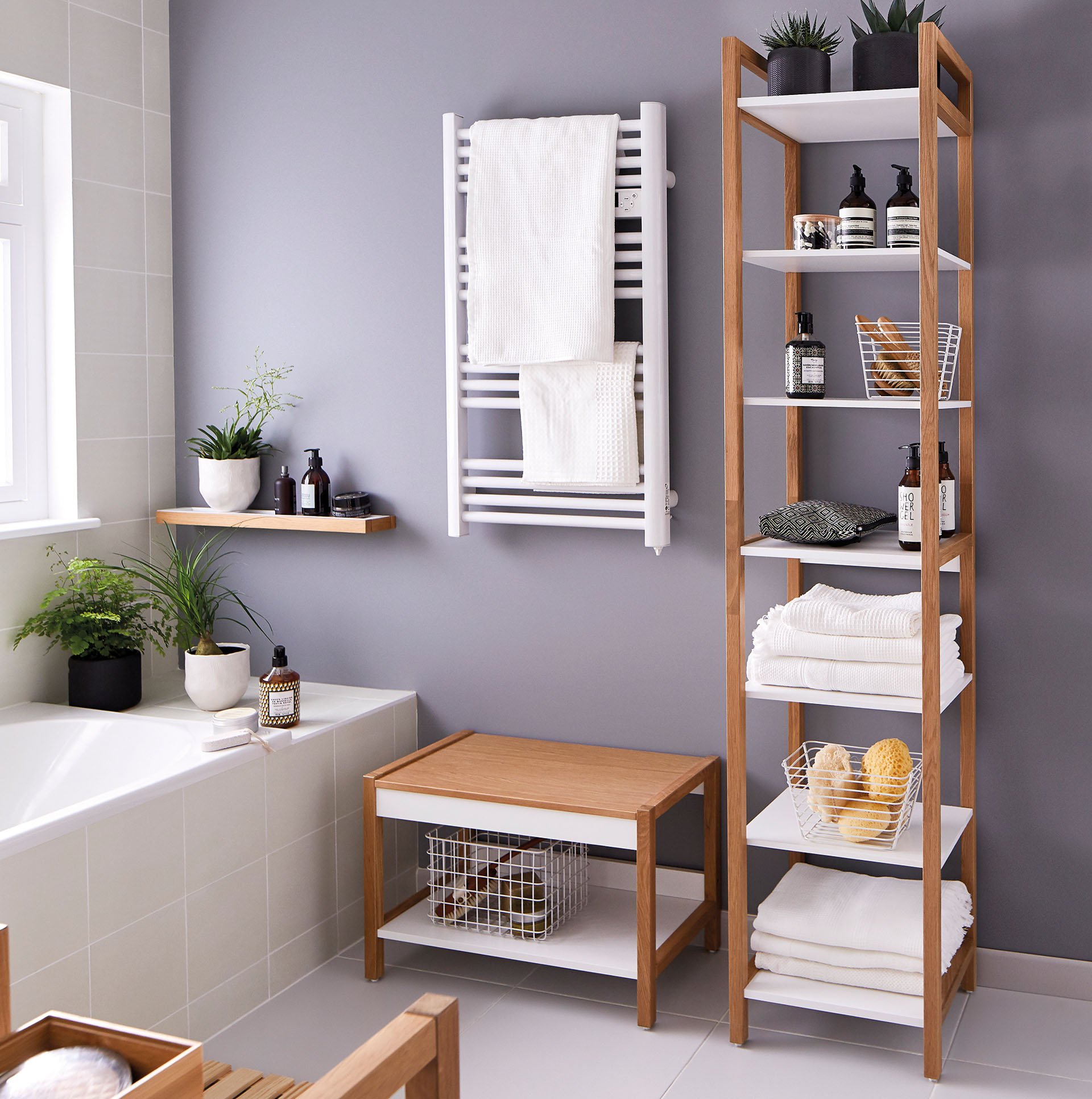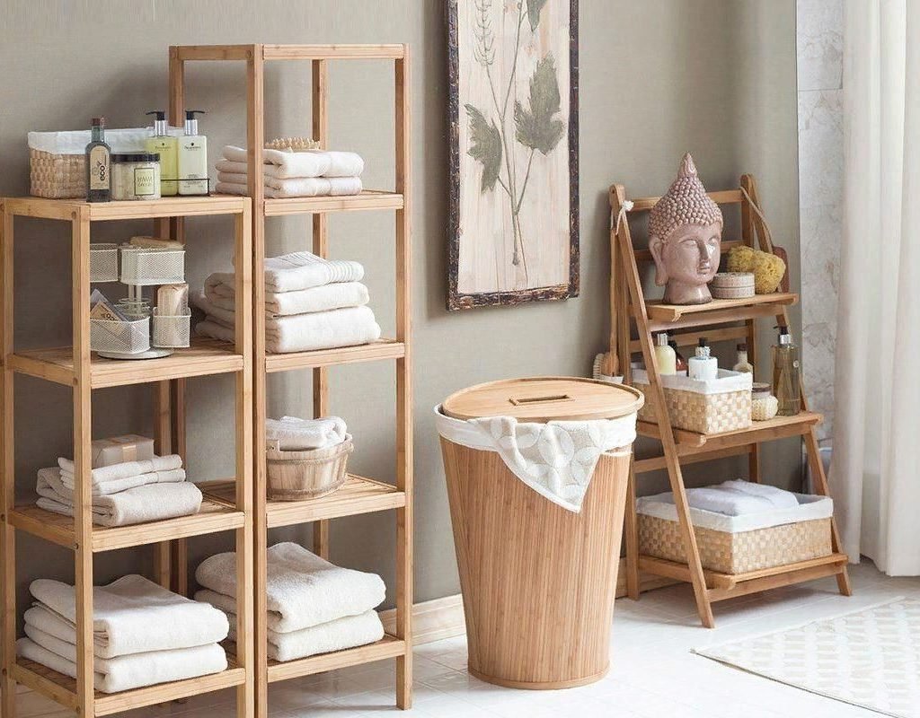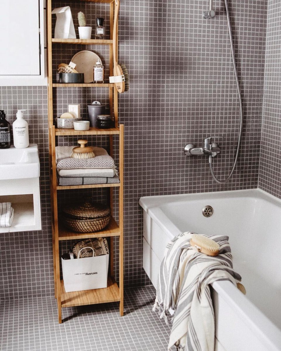 Деревянный стеллаж для ванной в интерьере