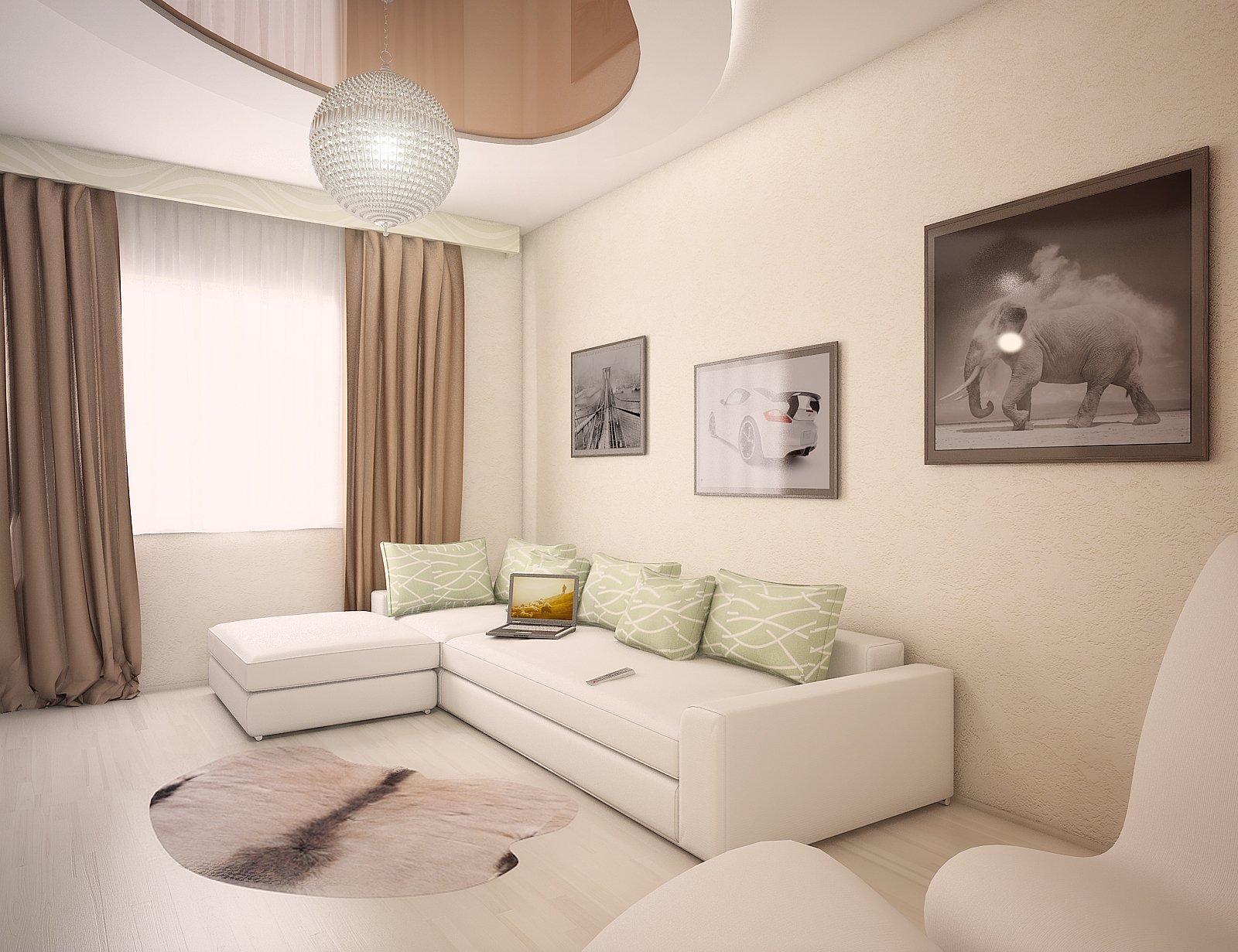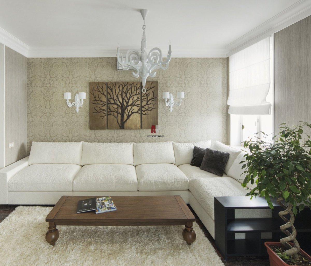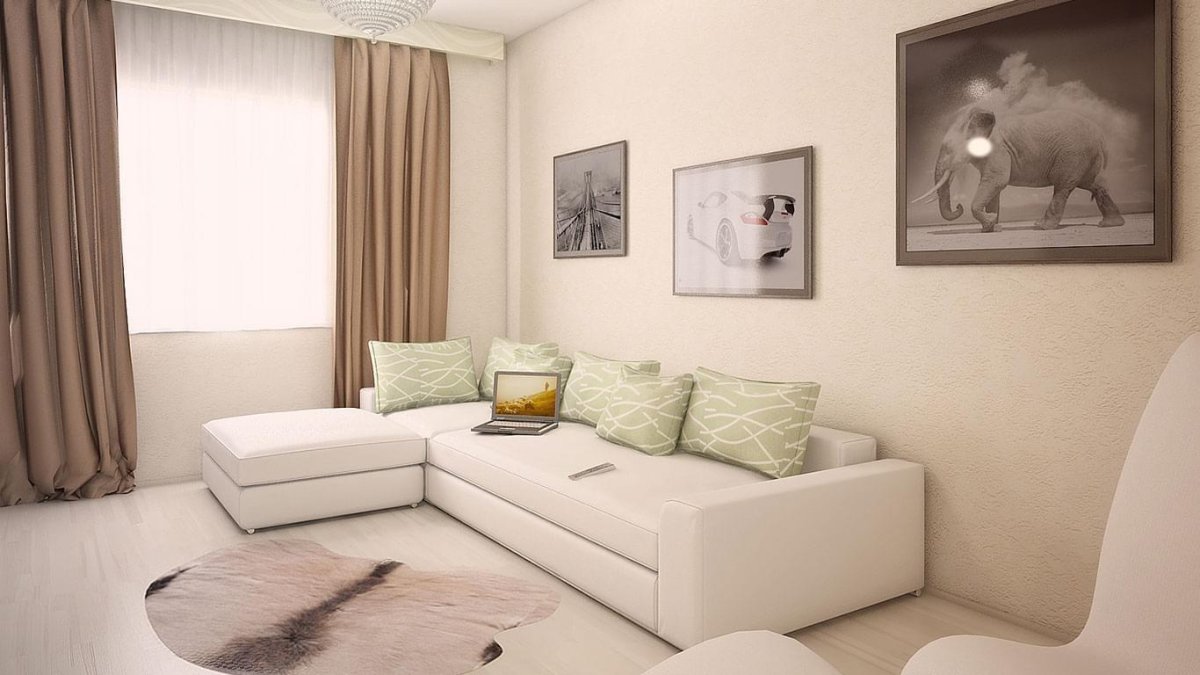 Интерьер комнаты в светлых тонах с угловым диваном