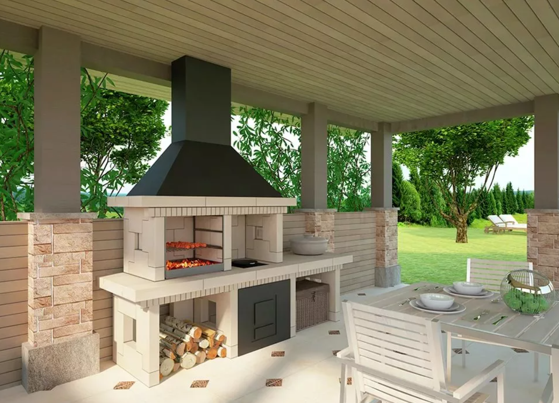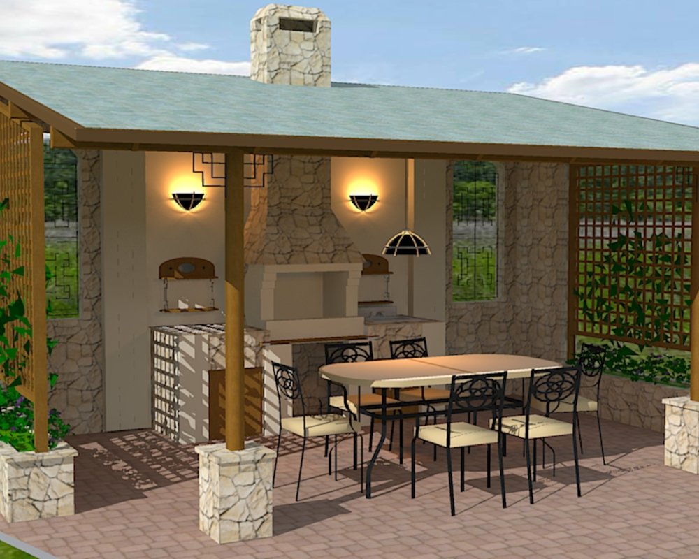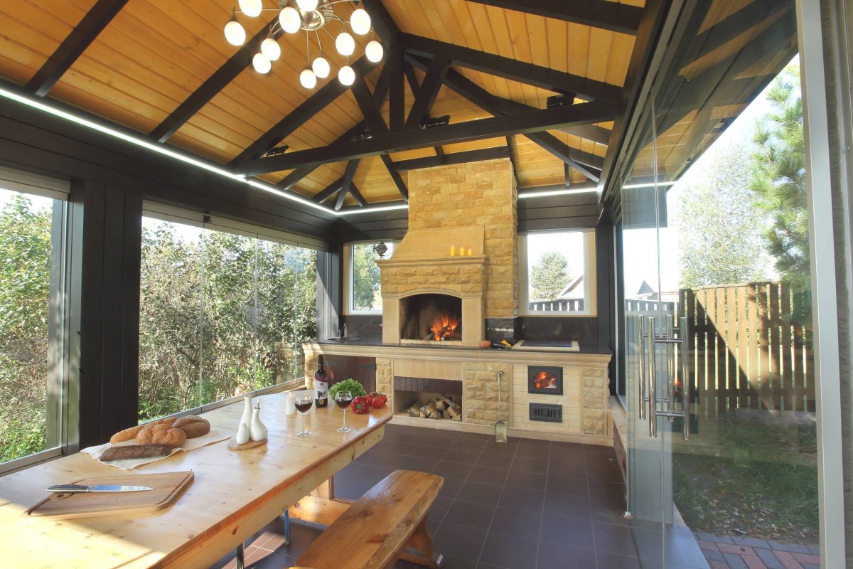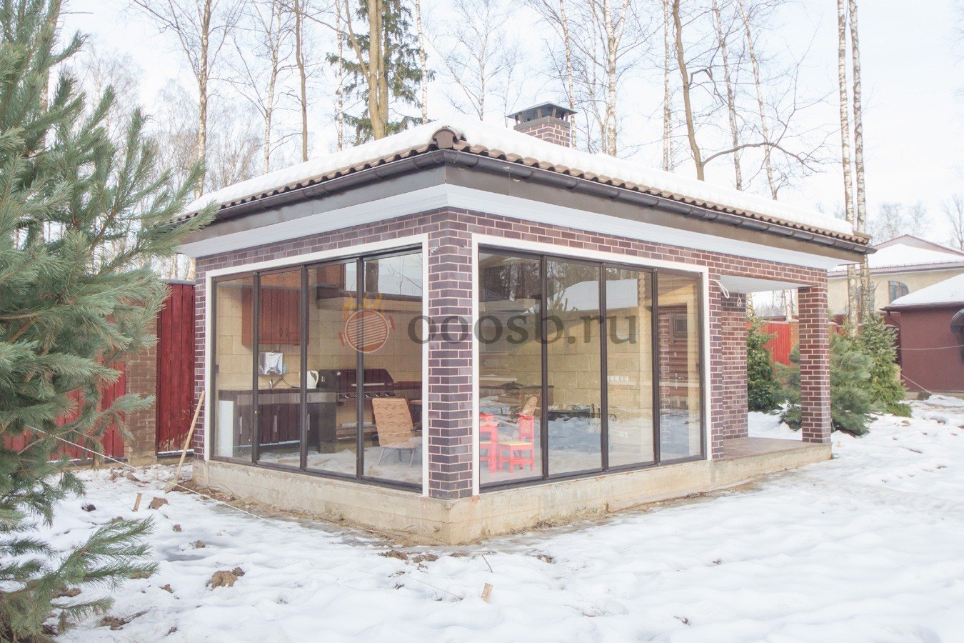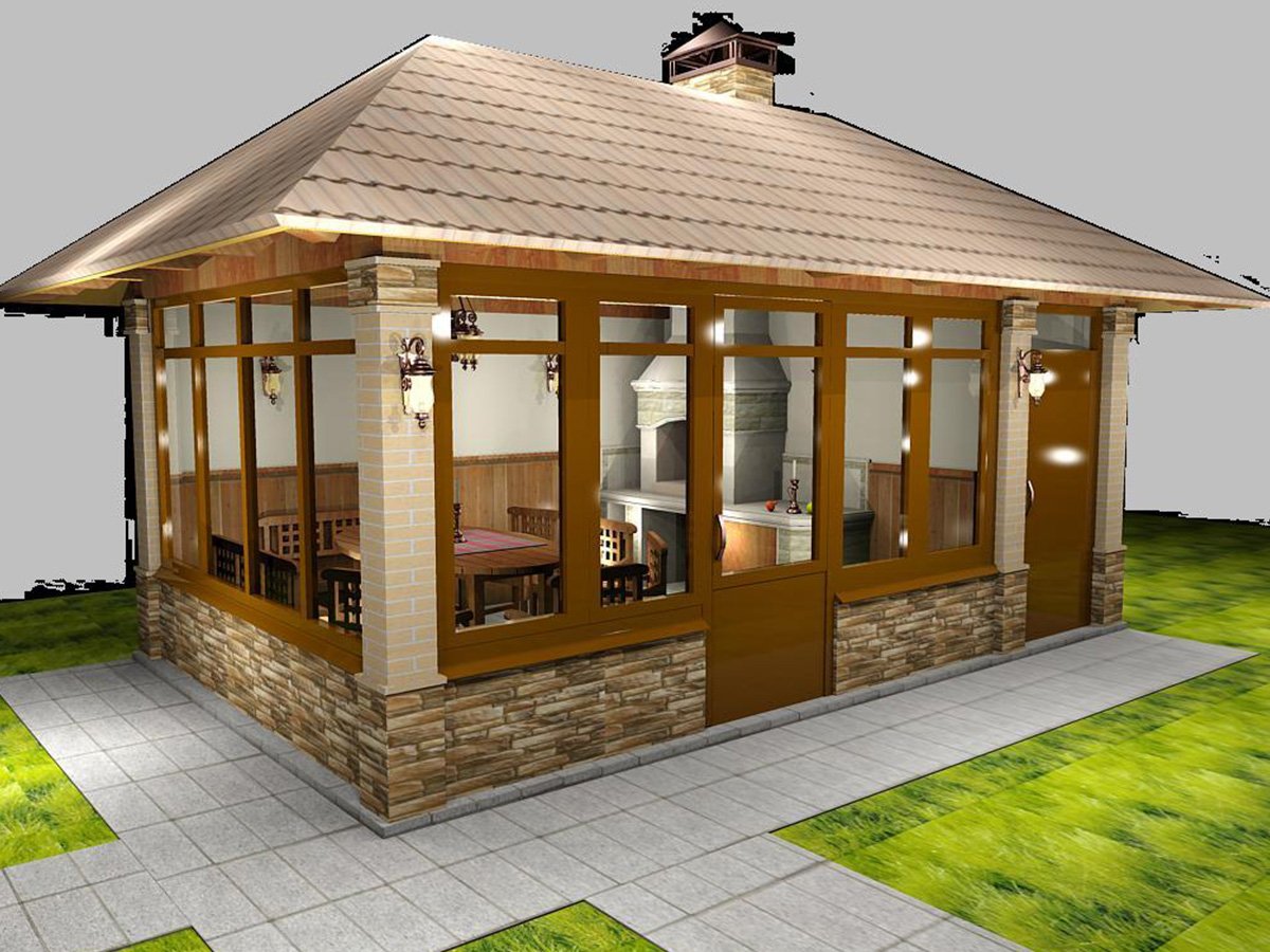 Крытая беседка застекленная с мангалом и барбекю 4х6