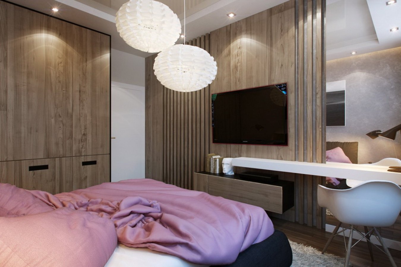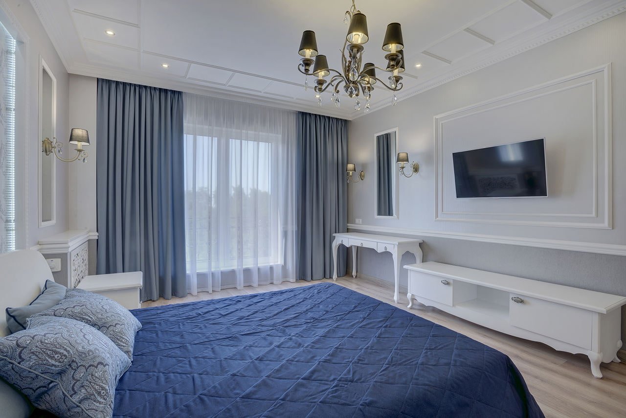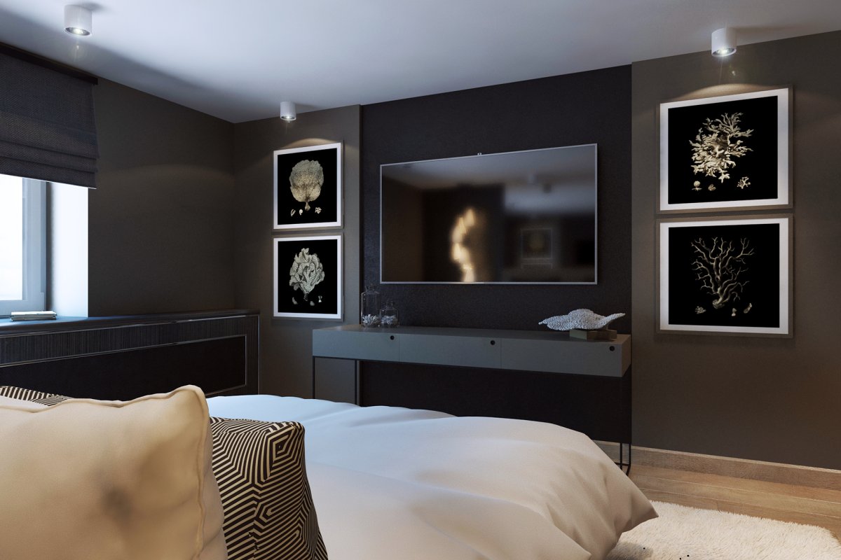 Декор интерьера спальни с телевизором