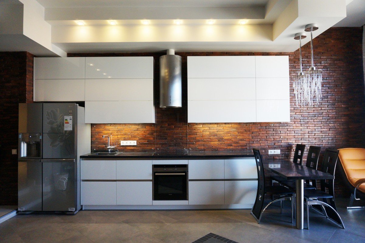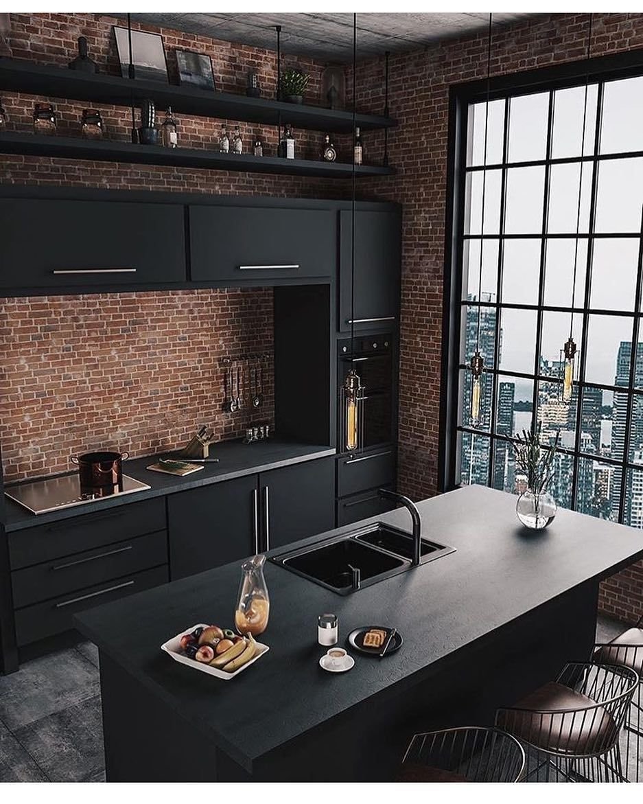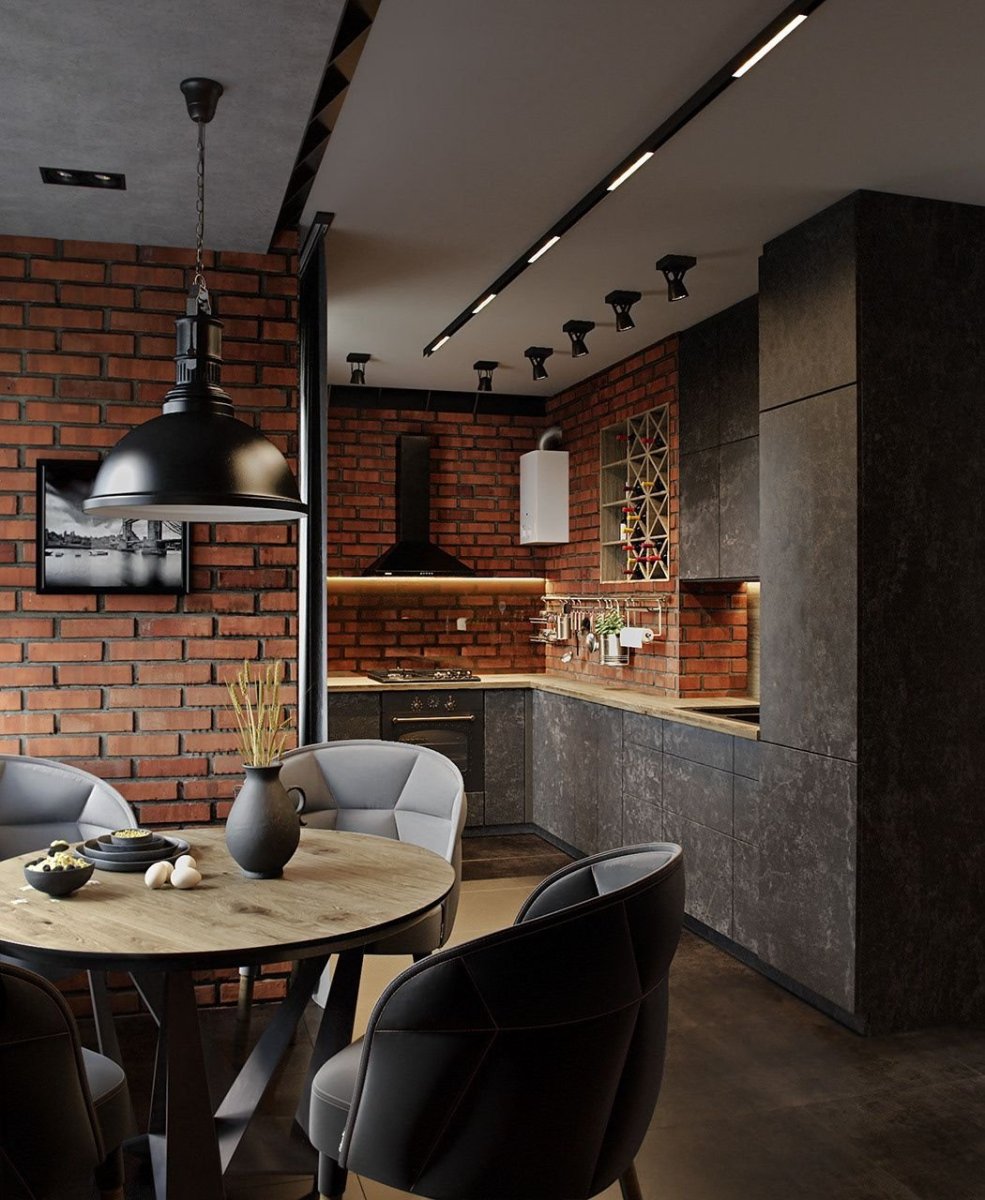 Кухня лофт с красным кирпичом