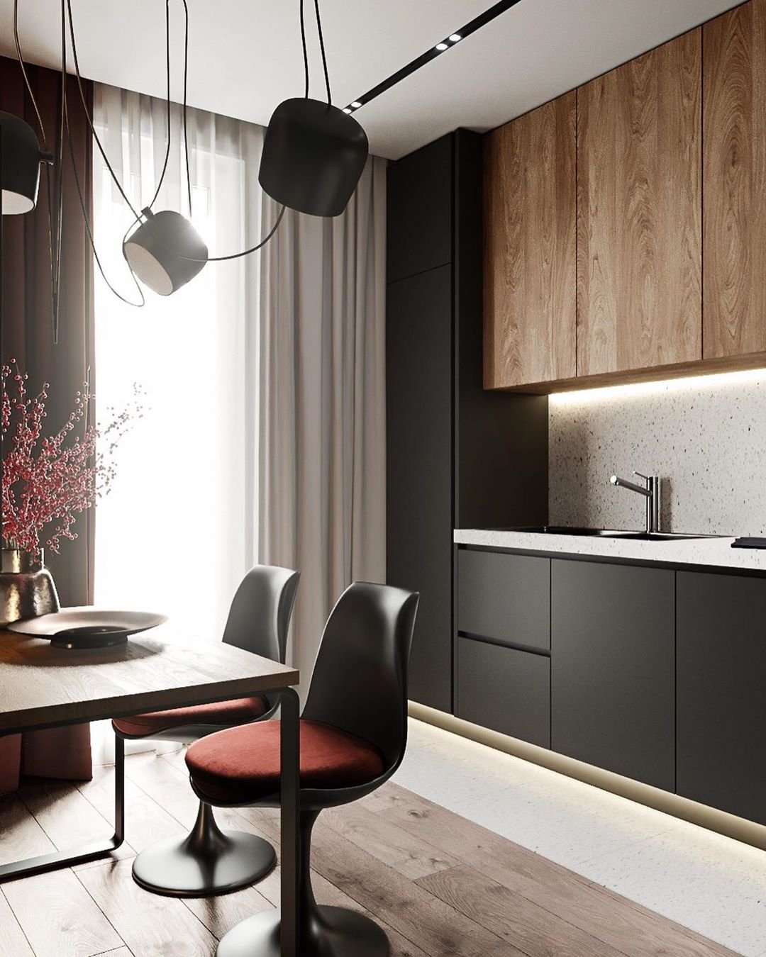 Интерьер черный с деревом