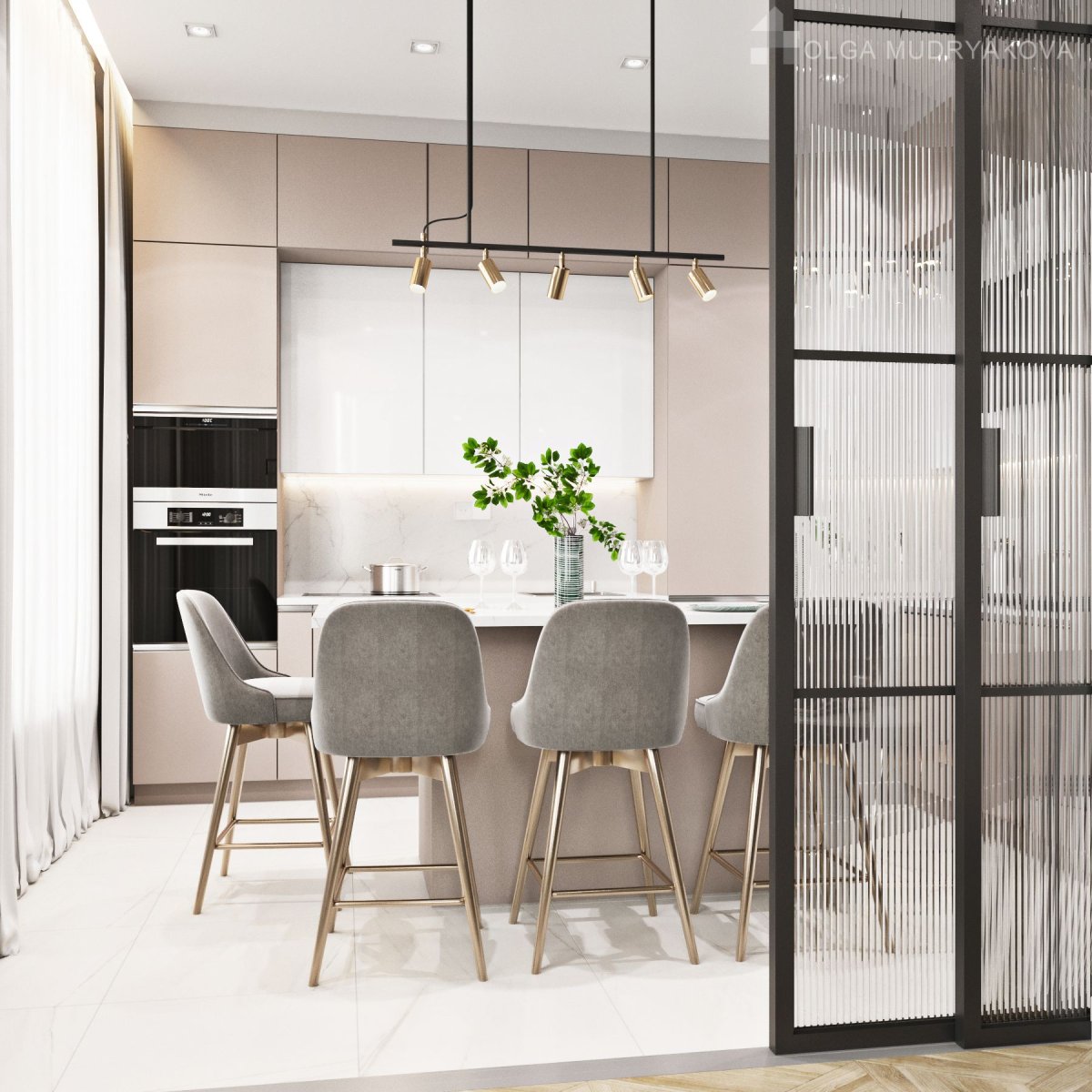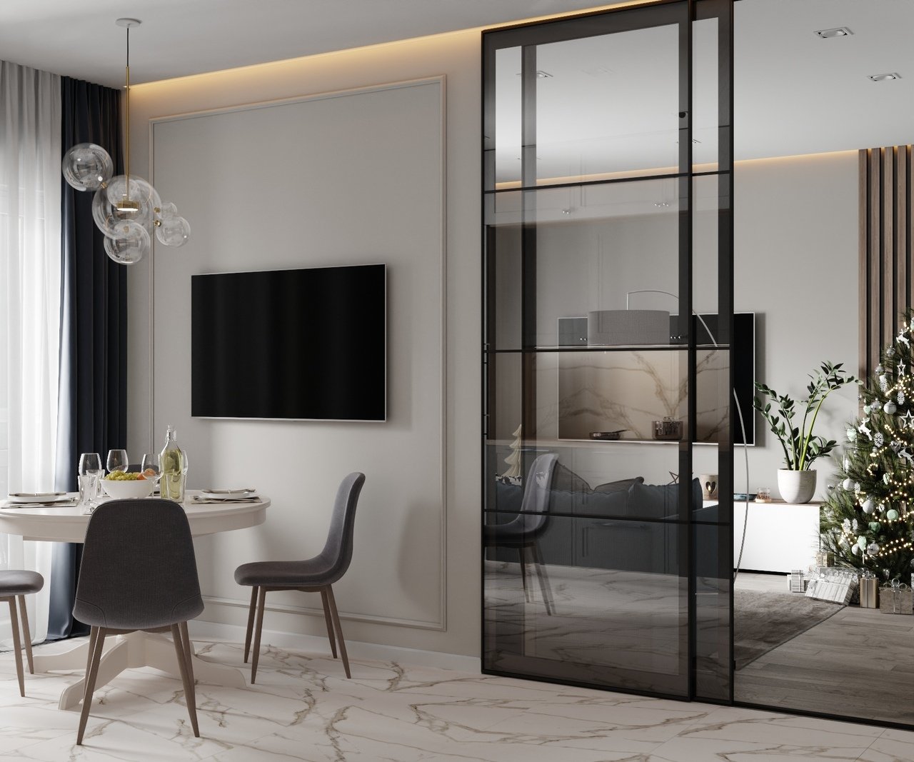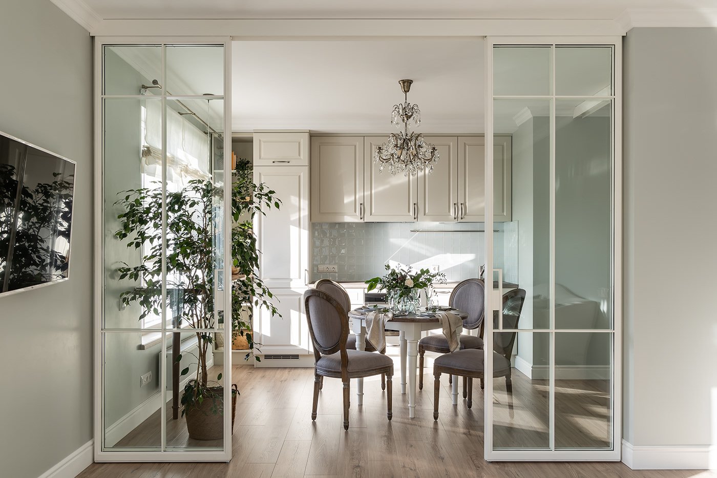 Стеклянная перегородка между кухней и гостиной
