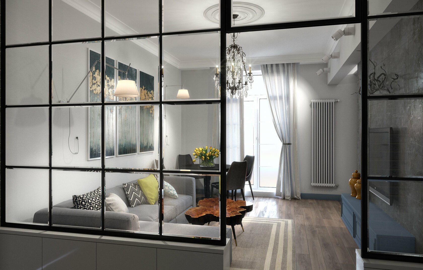 Гостиная со стеклянной перегородкой