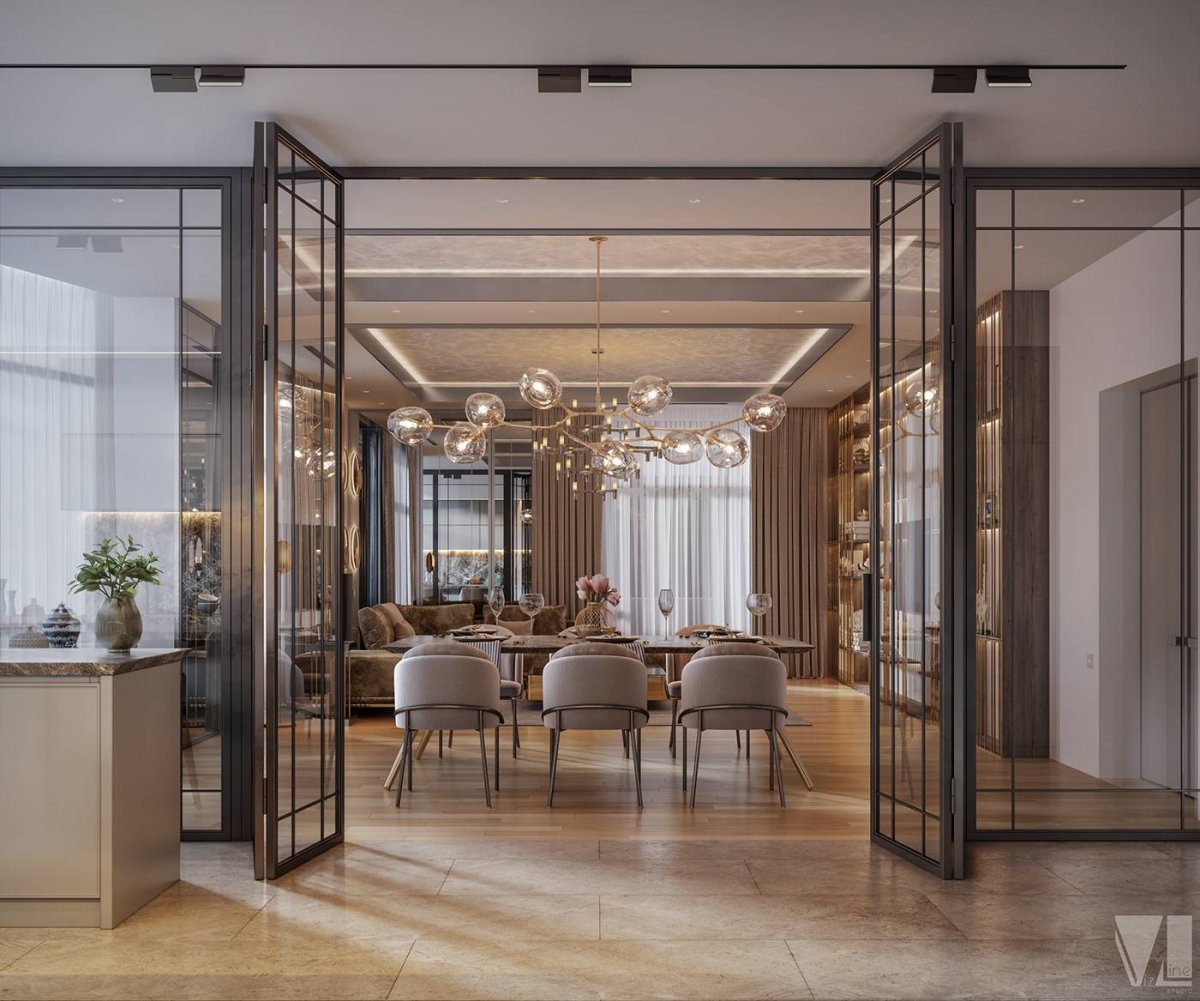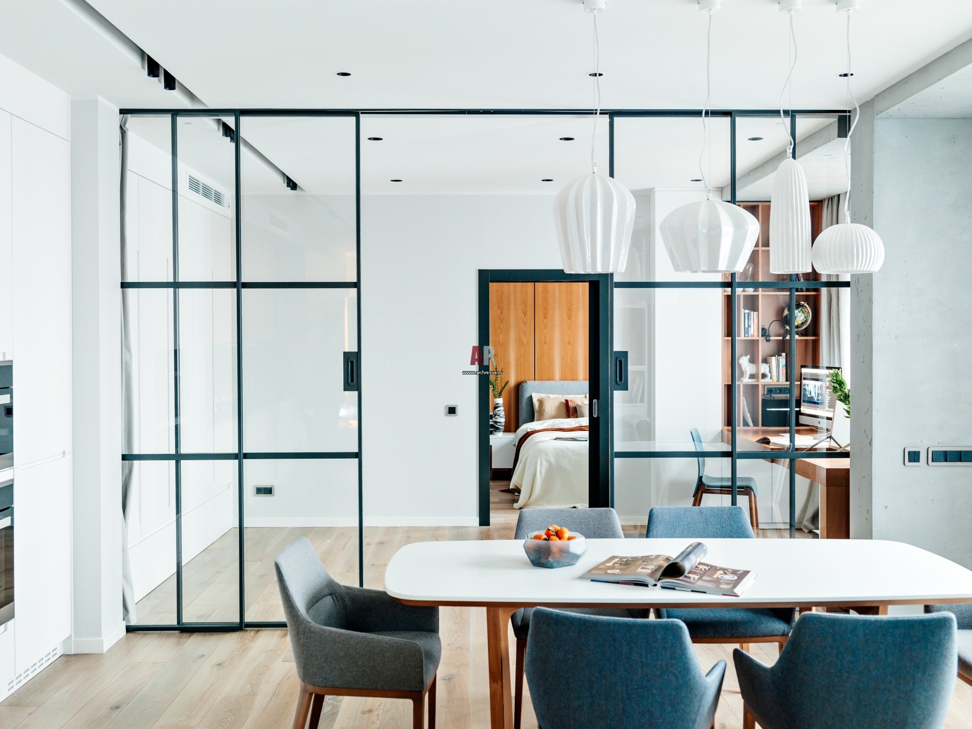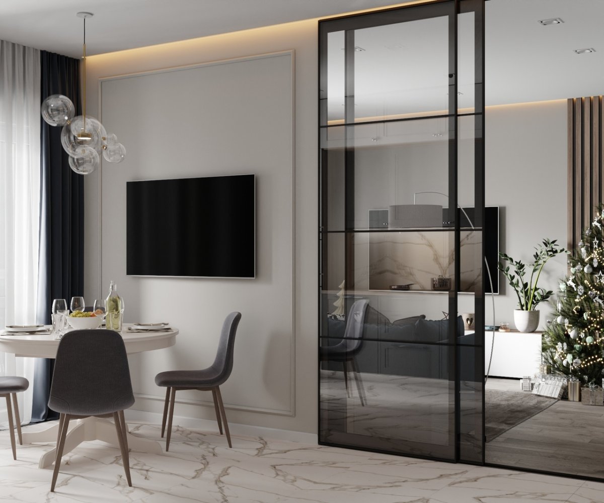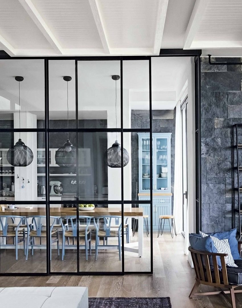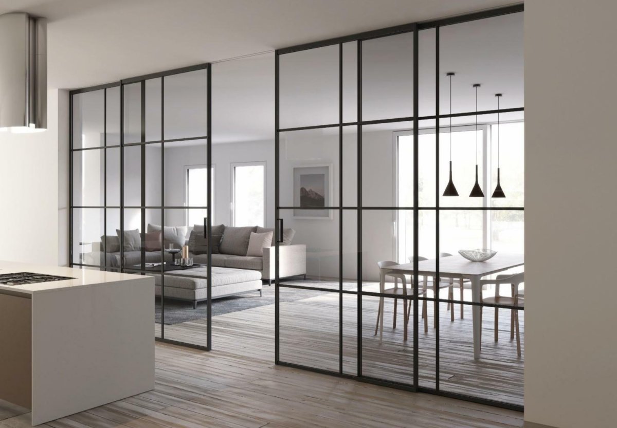 Прозрачная перегородка между кухней и гостиной