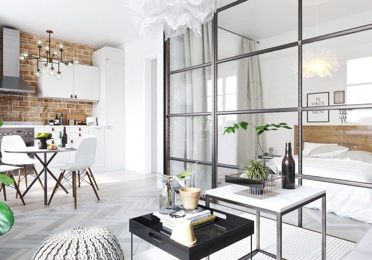 Зонирование студии перегородками в стиле лофт