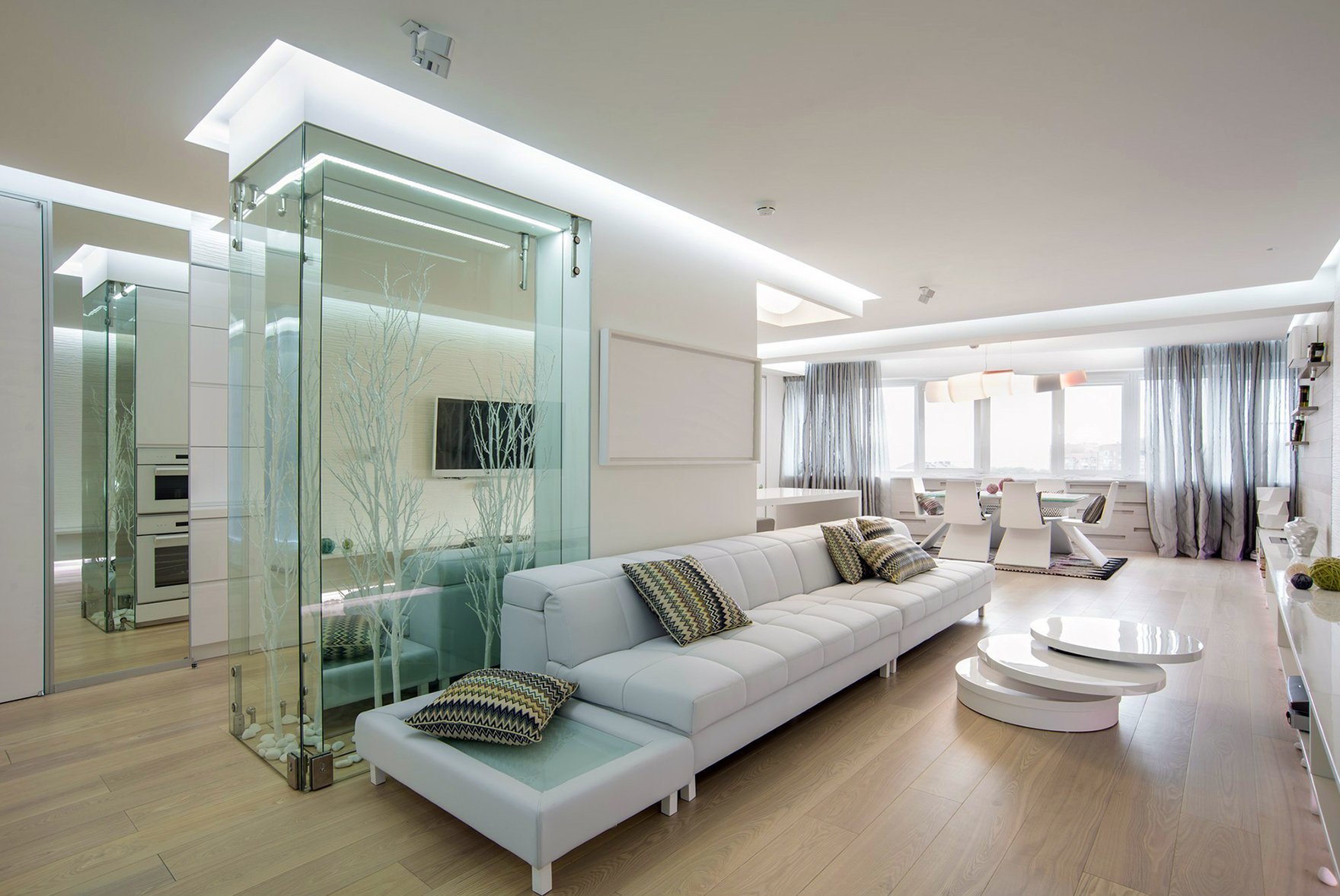 Гостиная 9 кв м с раздвижной стеклянной перегородкой