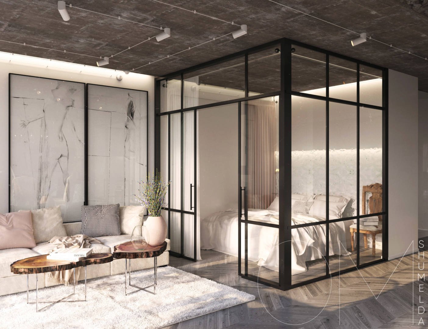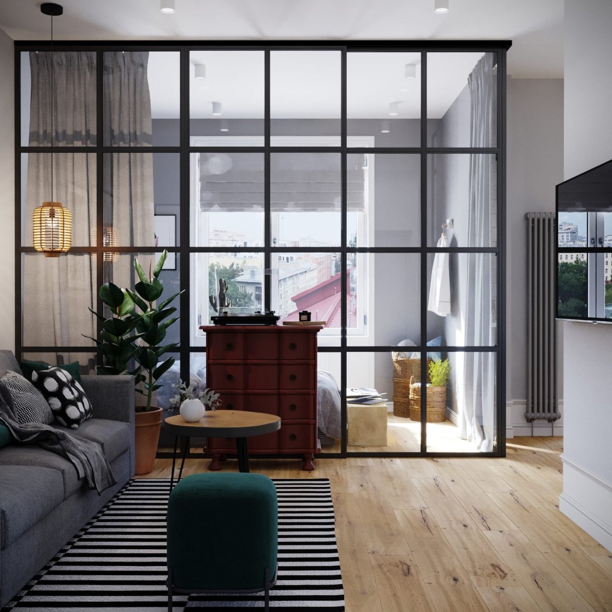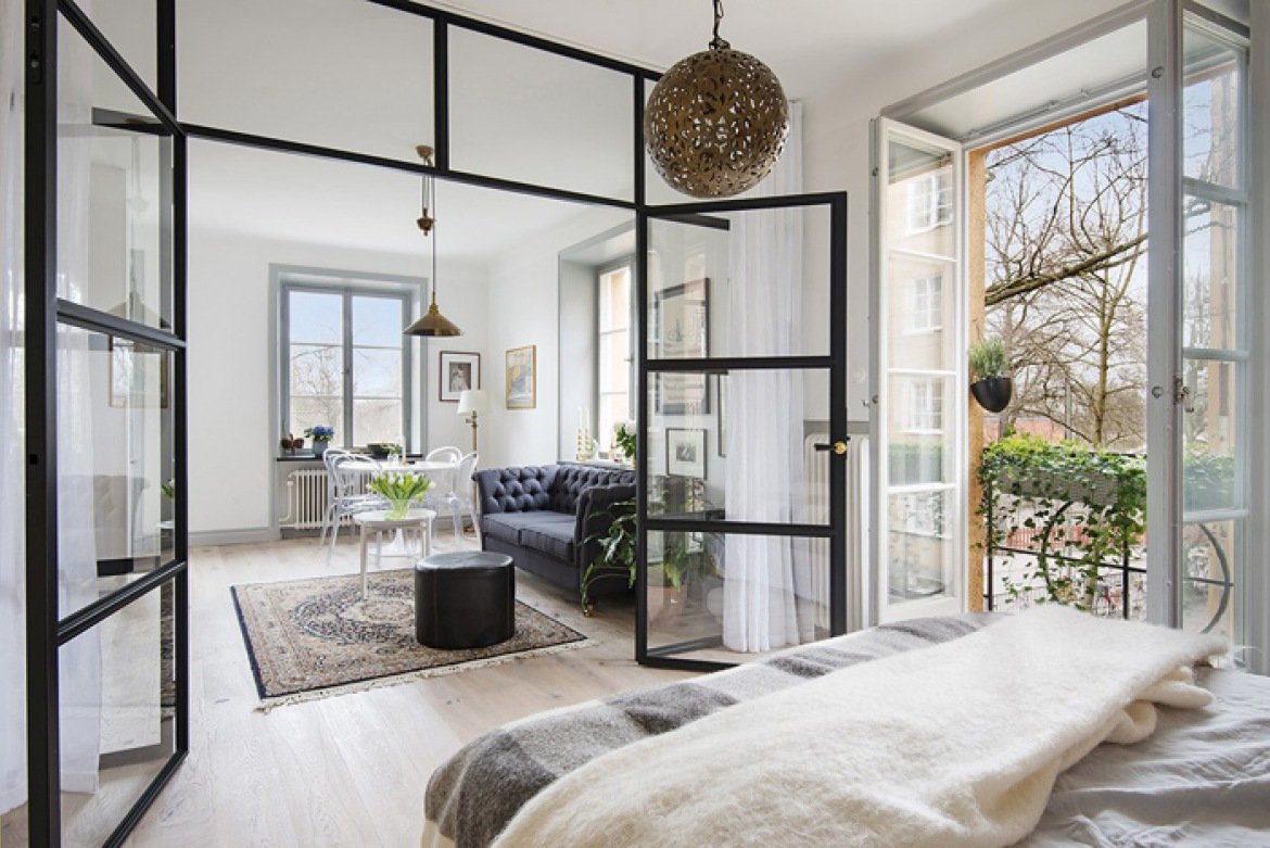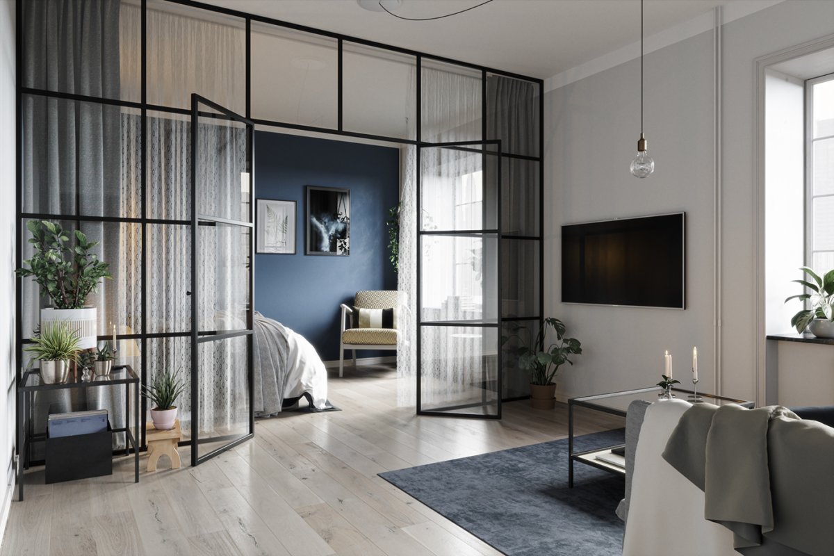 Спальня гостиная со стеклянной перегородкой