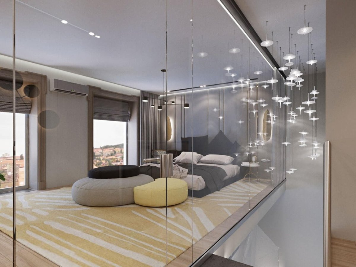 Спальня за стеклянной перегородкой