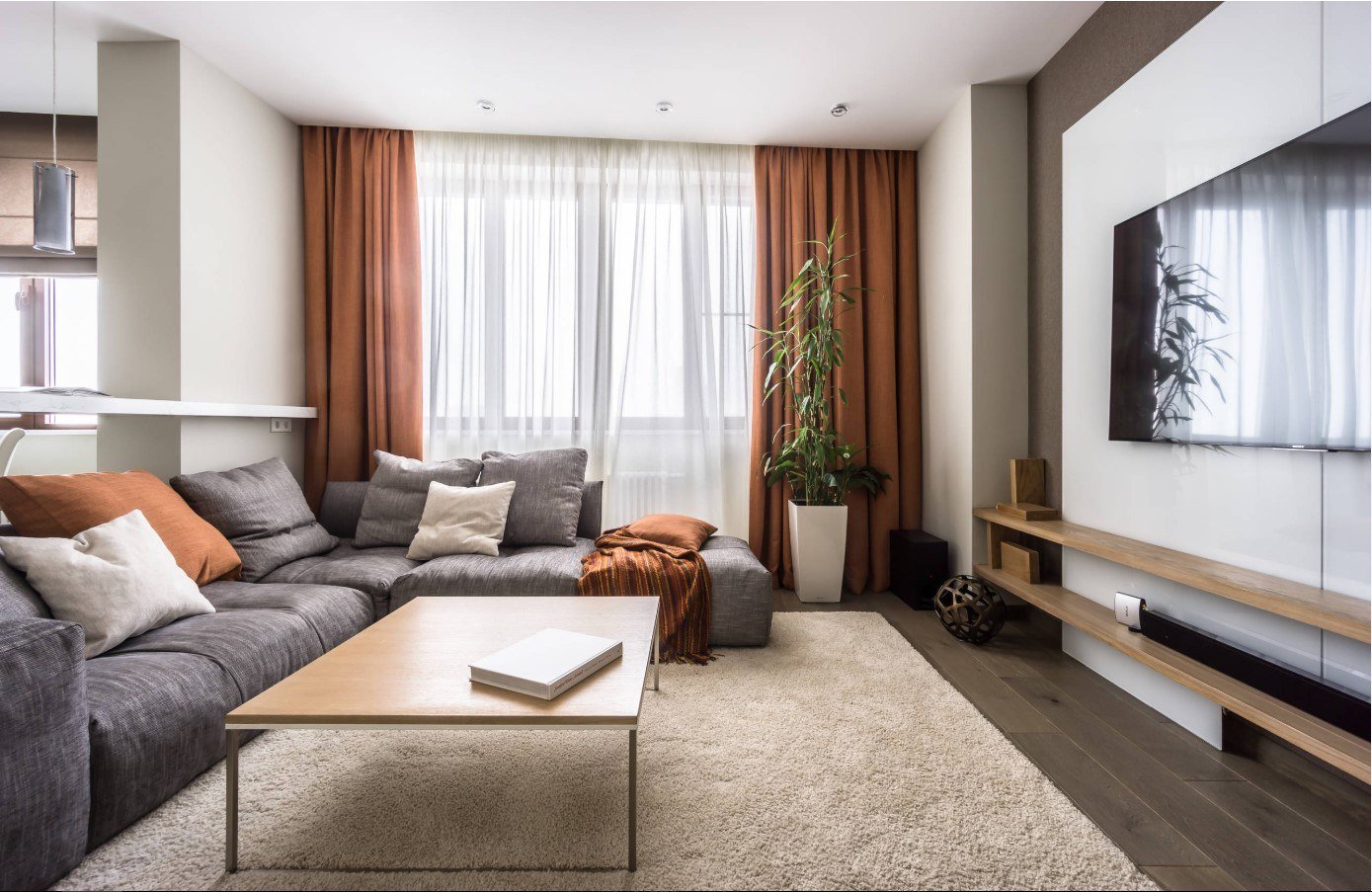 Ковры в интерьере гостиной с угловым диваном