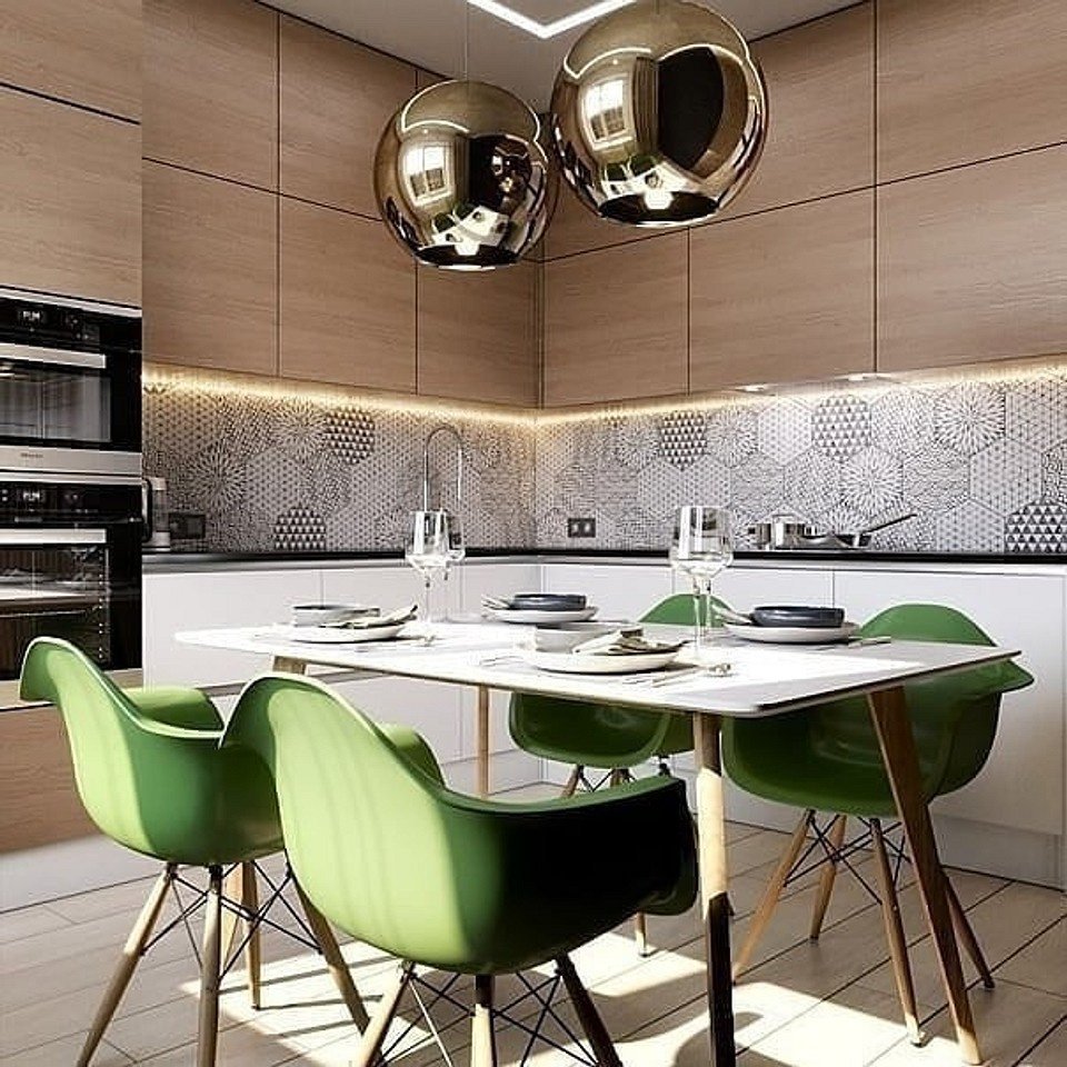 Дизайн кухни с зелеными стульями