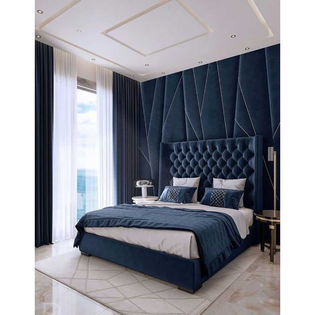 Синяя кровать в интерьере спальни